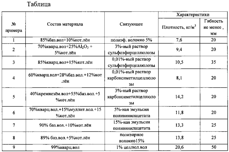1. Гибкий теплозвукоизоляционный волокнистый материал, содержащий в качестве основы минеральные волокна и волокна растительного происхождения, отличающийся тем, что в качестве волокон растительного происхождения материал содержит котонизированные волокна льна, а в качестве минеральных волокон - волокна диаметром не более 5 мкм, выбранные из группы, содержащей базальтовые, кварцевые, кремнеземные волокна или волокна на основе оксида алюминия, кроме того, материал содержит органическое связующее, при этом плотность материала составляет не более 15 кг/м3. 2. Материал по п. 1, отличающийся тем, что содержание котонизированного льняного волокна составляет 5-15% вес. от общего веса волокна в материале. 3. Материал по п. 1, отличающийся тем, что в качестве органического связующего использован раствор сульфоэфира целлюлозы с концентрацией 0,01-3%. 4. Материал по п. 1, отличающийся тем, что в качестве органического связующего использован раствор карбоксиметилцеллюлозы с концентрацией 0,01-3%. 5. Материал по п. 1, отличающийся тем, что в качестве органического связующего использована эмульсия поливинилацетата с концентрацией 5-15%. 6. Материал по п. 1, отличающийся тем, что в качестве органического связующего применяются термопластичные полиэфирные волокна в количестве 1-5% вес. от общего веса волокна в материале.