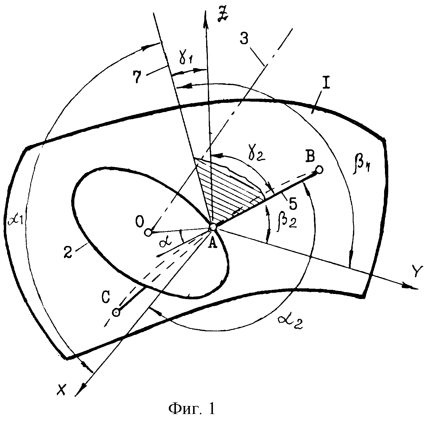 Направления векторов нормали 7 и прямой перемещения 5 характеризуются значениями углов α1, β1, γ1 и α2, β2,