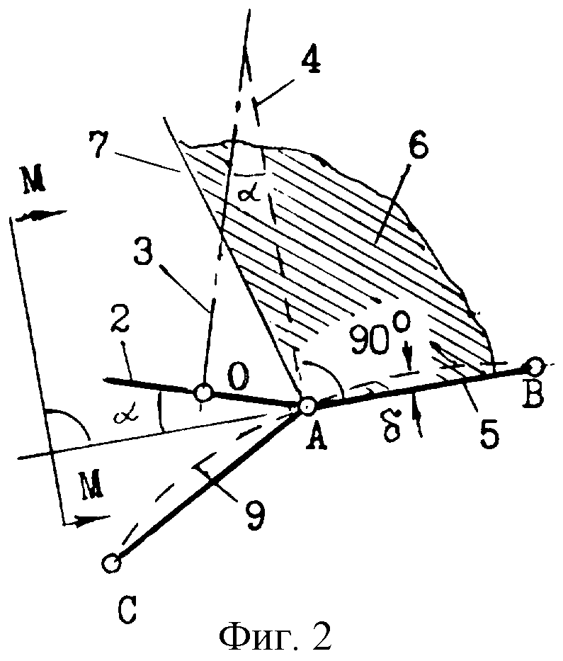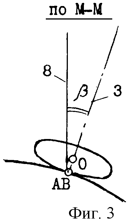 A и прямой, соединяющей точку касания с последующей опорной точкой. На фиг.3 представлено сечение М-М в плоскости, перпендикулярной к прямой, которая соединяет точку касания с