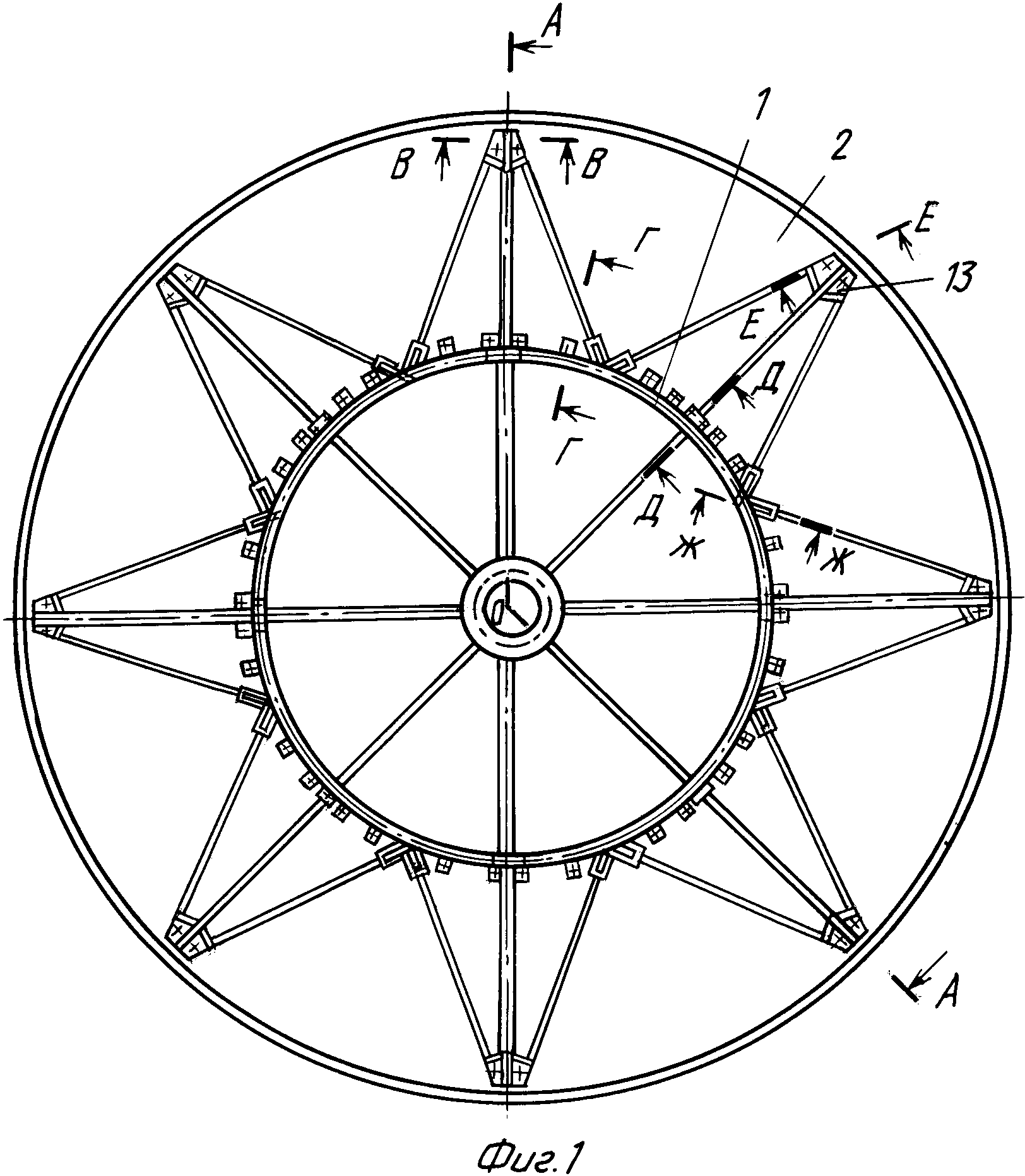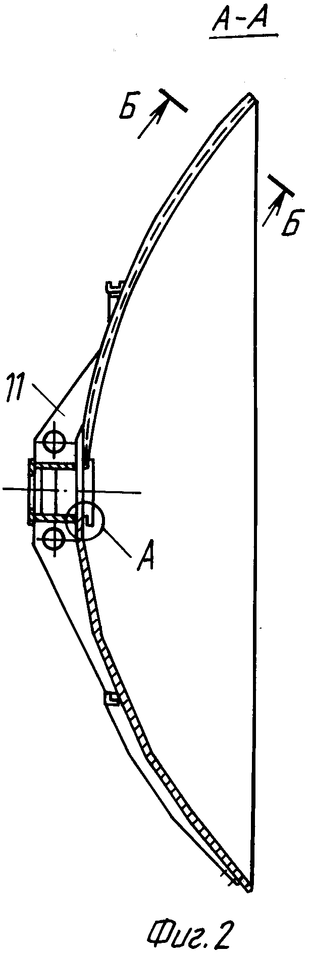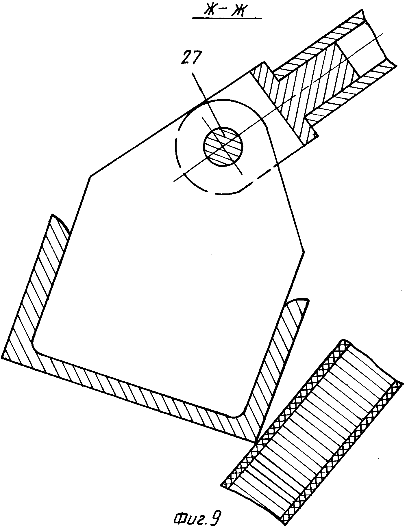 фиг. 9 - сечение Ж-Ж на фиг. 1. Рефлектор, выполненный сборно-разборным, состоит из каркаса 1, четырех сотовых лепестков 2 (панелей) и соединительных элементов. Каждый из