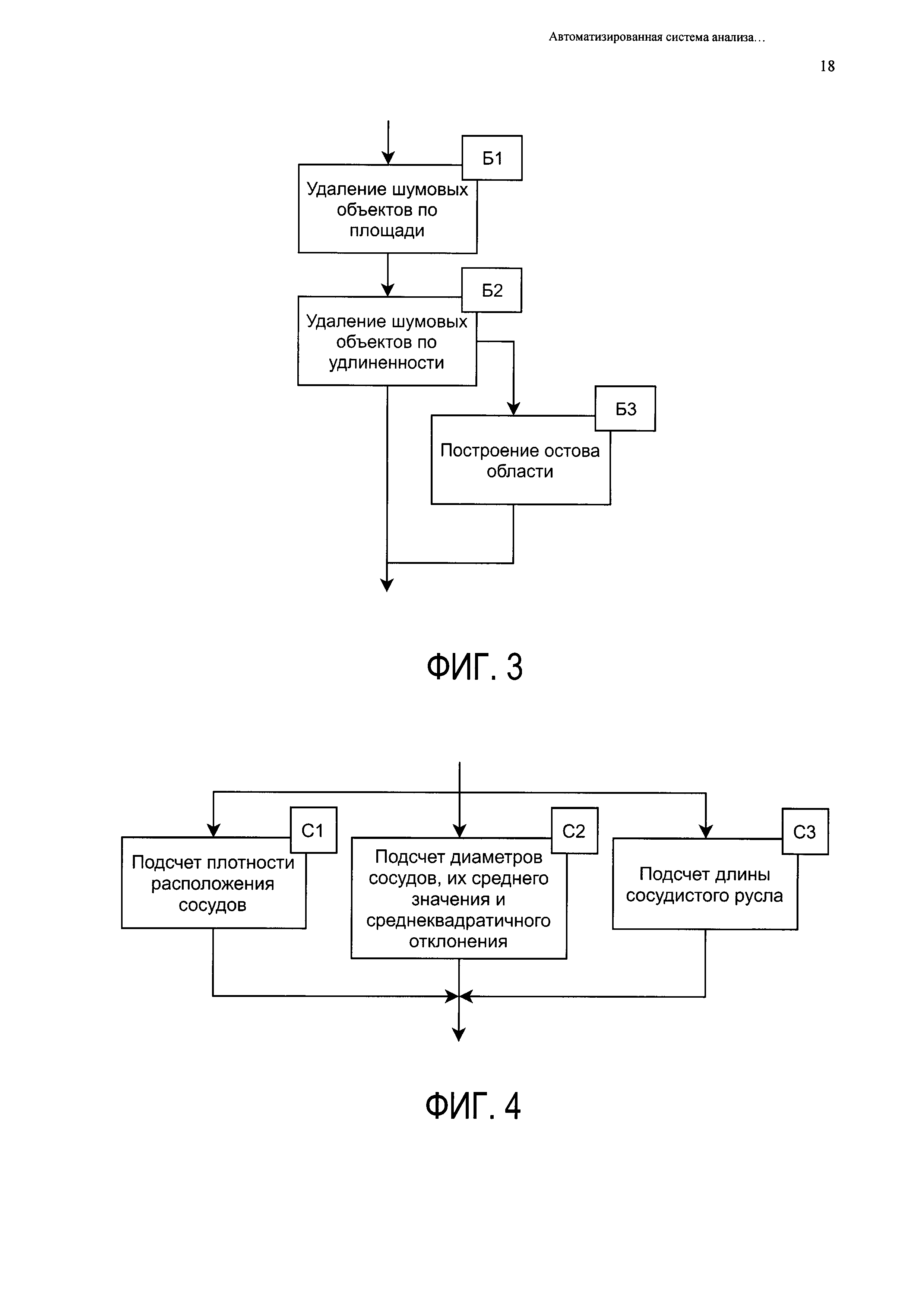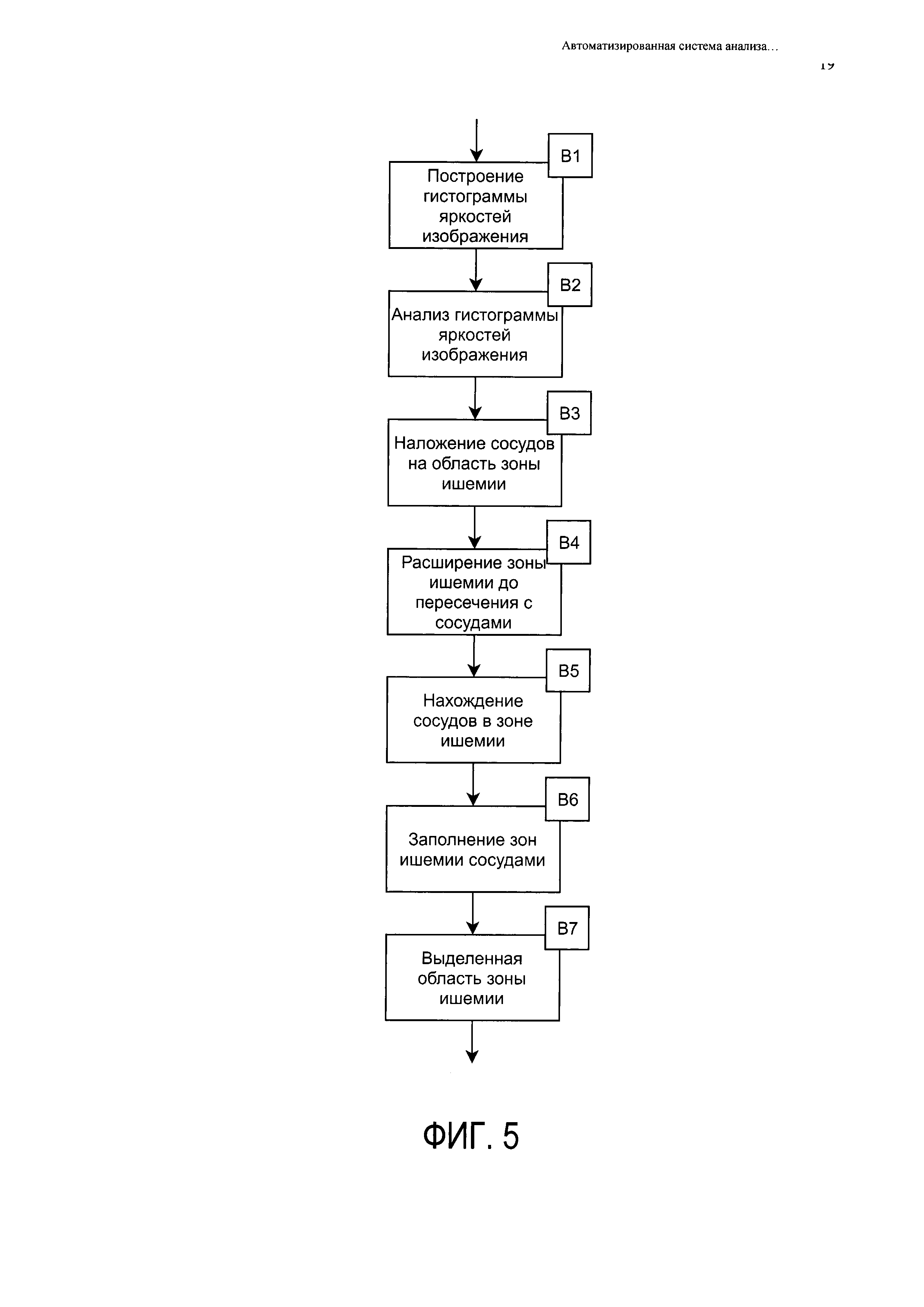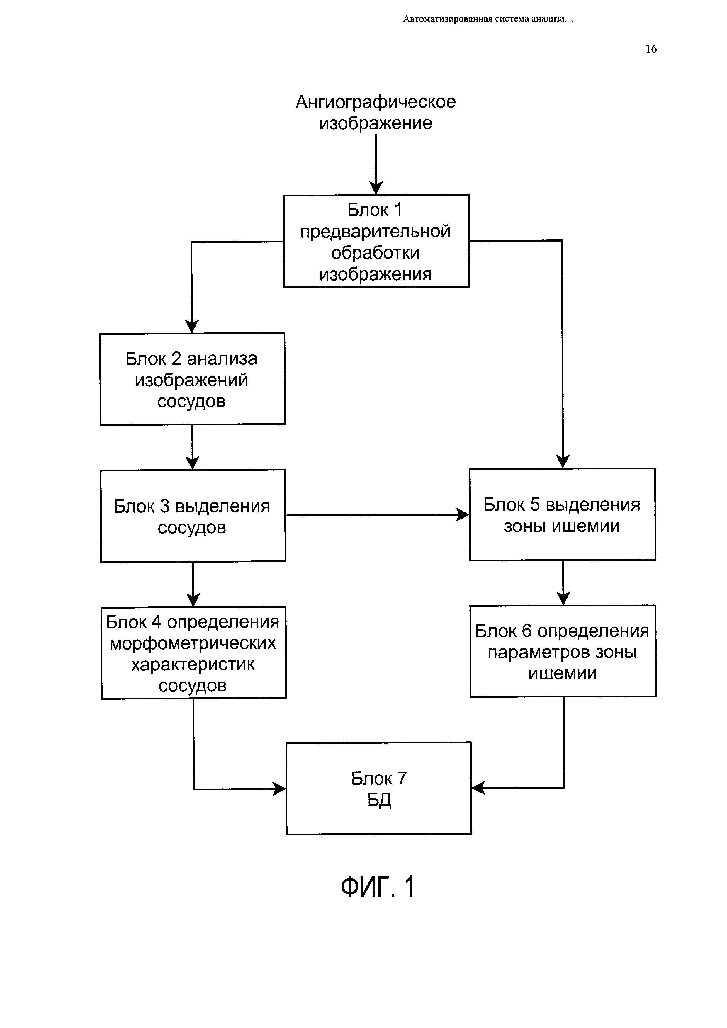 1. Автоматизированная система анализа ангиографических изображений глазного дна, включающая блок ввода исходных цифровых ангиографических изображений, средства анализа и выделения функциональных и структурных показателей глазного дна и базу данных, связанные с возможностью обмена информацией и управления с процессором, отличающаяся тем, что дополнительно введен блок предварительной обработки исходных изображений, связанный с выходом блока исходных изображений, выполненный с возможностью преобразования цветного исходного изображения в одноканальное в оттенках серого с последующей нормализацией и логарифмической коррекцией, фильтрацией шума на изображении, повышения контраста и бинаризации изображения; средства анализа и выделения функциональных и структурных показателей глазного дна содержат блок анализа изображений сосудов, выполненный с возможностью удаления шумовых объектов последовательно по площади и по удлиненности и построения остова области выделенных сосудов для последующего измерения их ширины, а также блок выделения сосудов, первый выход которого связан с блоком определения морфометрических характеристик сосудов, а второй выход - с блоком выделения зон ишемии сосудов, при этом блок определения морфометрических характеристик сосудов выполнен с возможностью определения плотности расположения сосудов, среднего диаметра и среднеквадратичного отклонения диаметров и общей длины сосудов, а блок выделения зон ишемии сосудов выполнен с возможностью построения гистограмм яркостей изображения и последующего их анализа, наложения изображений сосудов на область зоны ишемии и расширения зоны ишемии до пересечения с сосудами путем дилатации с получением области, пересекающейся с сосудами в выделенной зоне ишемии и последующим заполнением зон ишемии сосудами с помощью операций морфологического закрытия и реконструкции, при этом выход блока выделения зон ишемии сосудов связан с входом блока определения параметров зоны ишемии сосудов, выход которого и выход блока определения морфометрических характеристик сосудов связаны с базой данных. 2. Система по п. 1, отличающаяся тем, что блок предварительной обработки исходных изображений включает последовательно соединенные модуль яркостной и цветовой коррекции изображения, модуль нормализации изображения, модуль логарифмической коррекции изображения, модуль фильтрации шума на изображении, модуль повышения контраста изображения и модуль бинаризации изображения, выход которого является выходом блока. 3. Система по п. 1, отличающаяся тем, что блок анализа изображений сосудов включает модуль удаления шумовых объектов по площади, связанный по выходу с модулем удаления шумовых объектов по удлиненности, первый выход которого связан с входом модуля построения остова области, выход которого и второй выход модуля удаления шумовых объектов по удлиненности объединены и являются выходом блока. 4. Система по п. 1, отличающаяся тем, что блок определения морфометрических характеристик сосудов включает параллельно соединенные модуль подсчета плотности расположения сосудов, модуль подсчета диаметров сосудов, их среднего значения и среднеквадратичного отклонения, модуль подсчета длины сосудистого русла, выходы которых объединены и являются выходом блока.