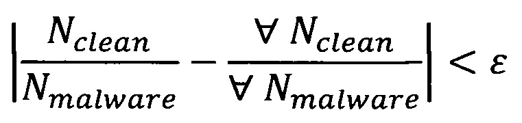 распределение между безопасными и вредоносными файлами, выбранными из базы файлов, соответствует распределению между безопасными и вредоносными файлами, собранными с помощью антивирусных поисковых роботов;