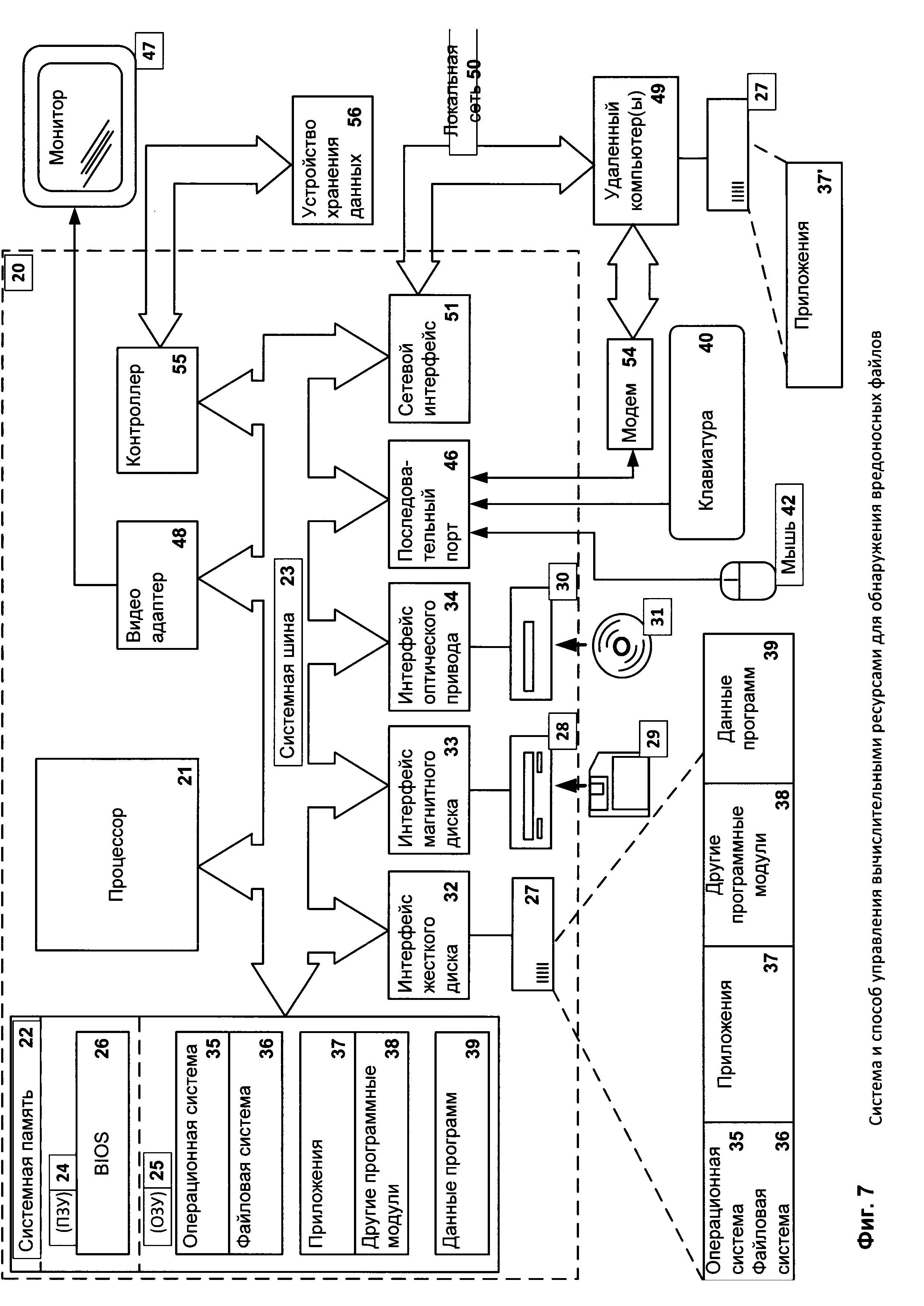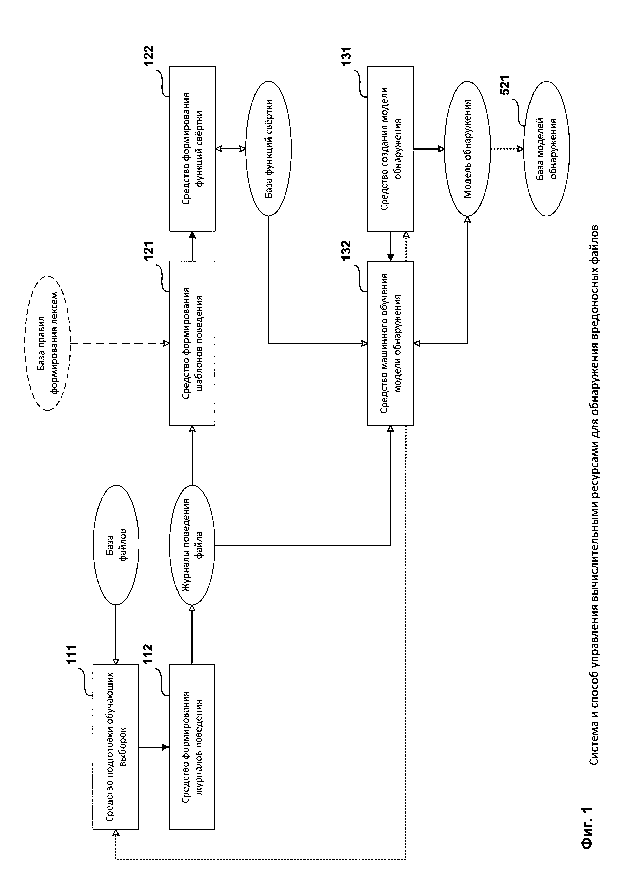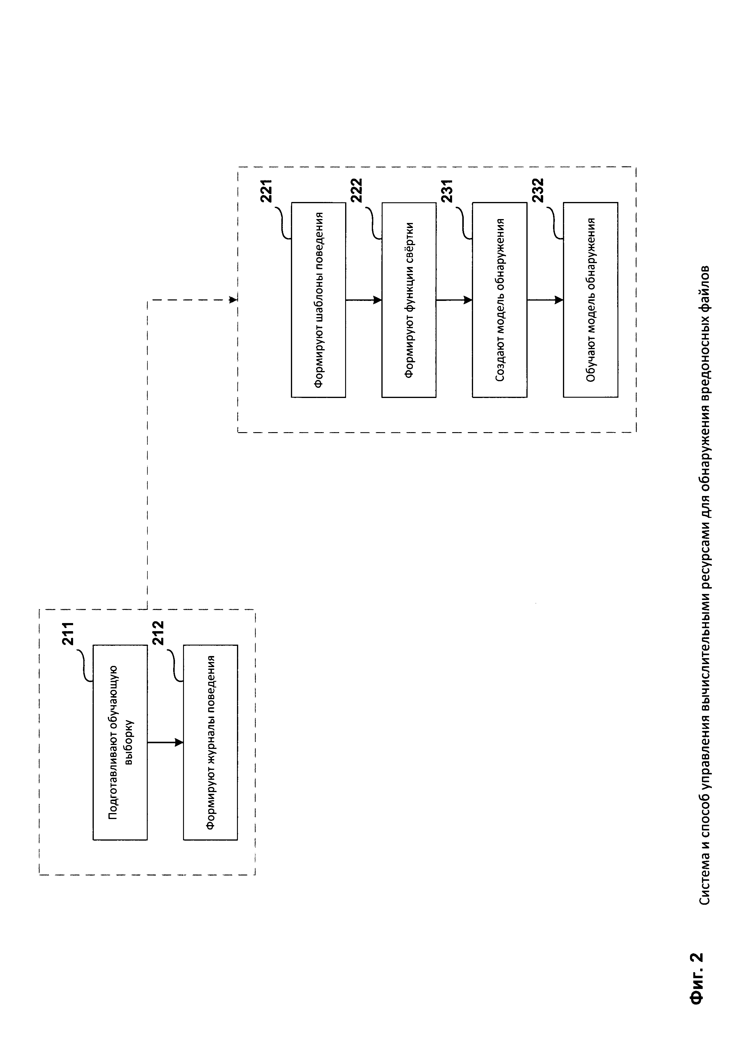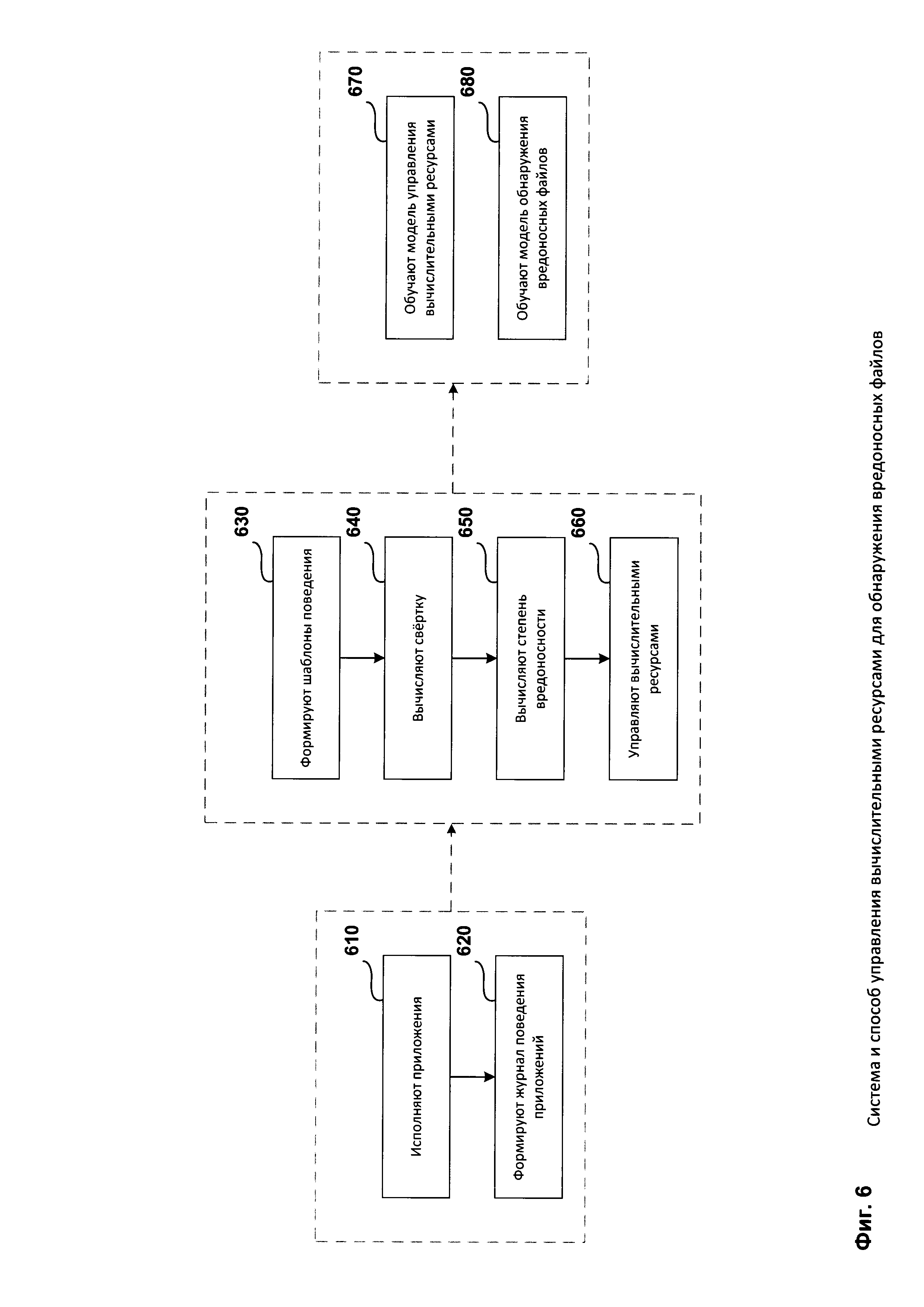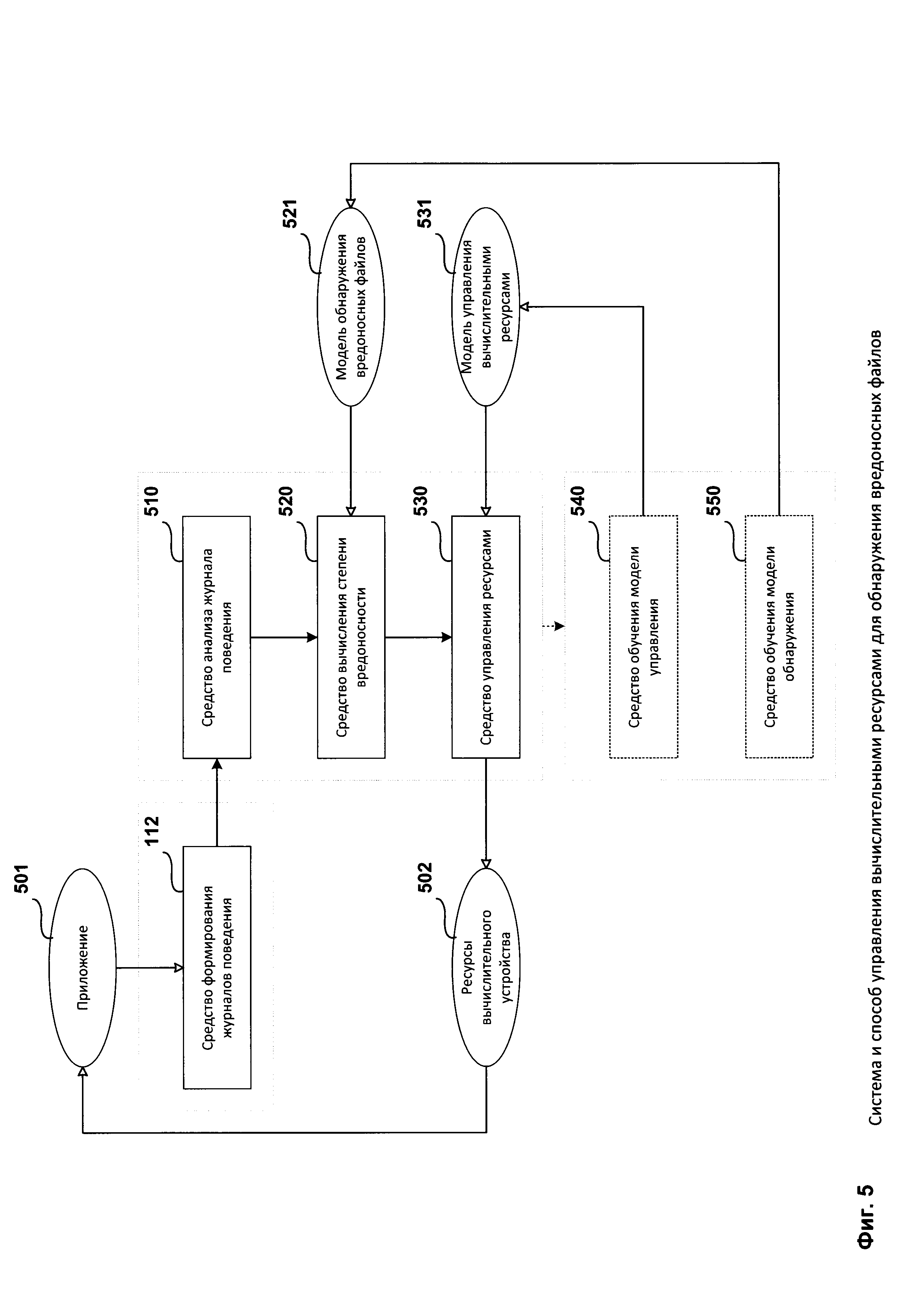 в случае отрицательного результата переобучения модели управления вычислительными ресурсами 531 на новых обучающих выборках приложений. Средство обучения модели обнаружения 550 предназначено для машинного обучения (переобучения) модели обнаружения вредоносных файлов 521 на основании анализа по меньшей мере одного созданного журнала поведения, при этом упомянутое машинное обучение выполняется в случае, когда после завершения последнего управления ресурсами 502 вычисленная степень вредоносности приложений оказывается выше заранее заданного порогового значения.