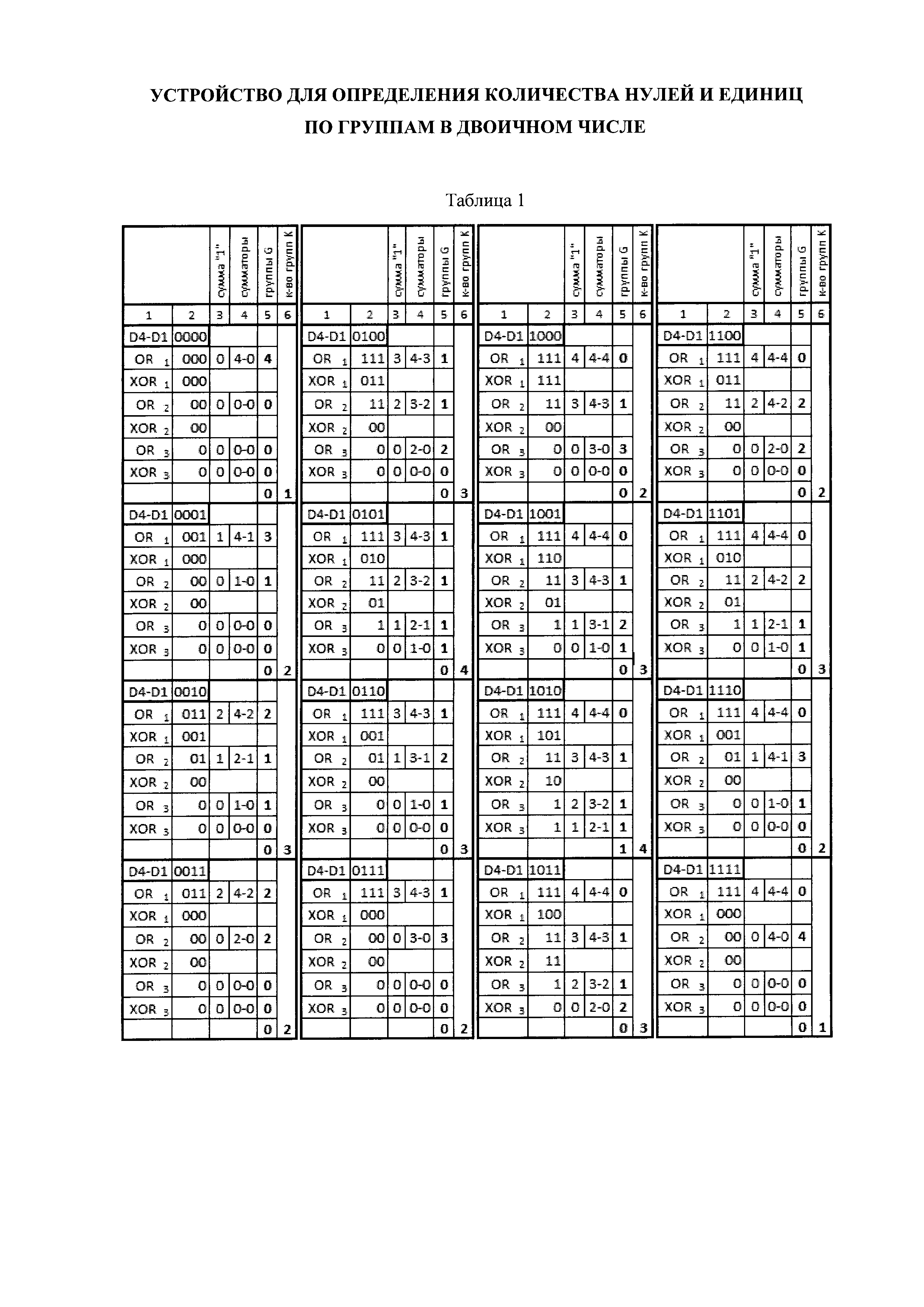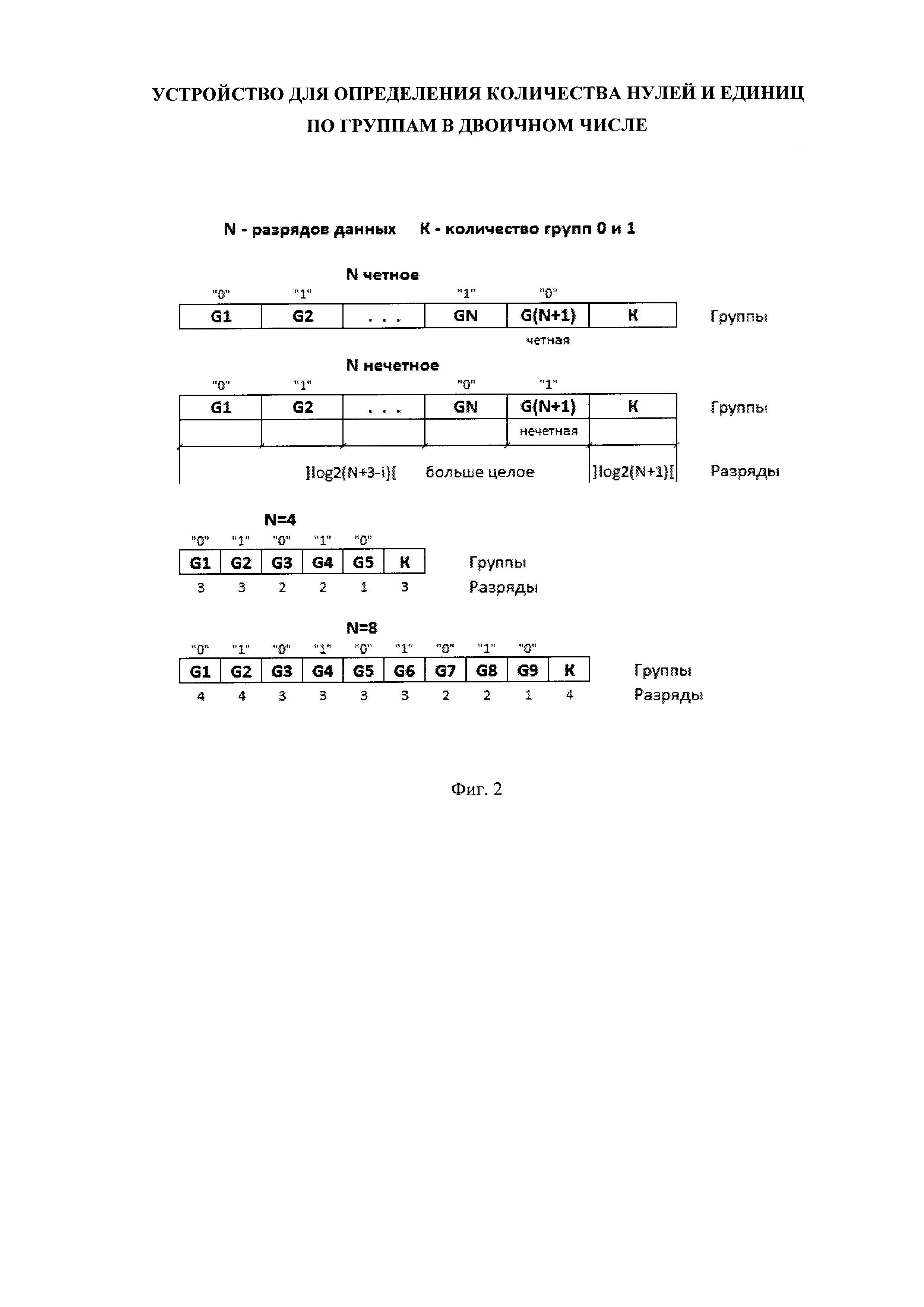 Изобретение относится к области вычислительной техники. Технический результат заключается в расширении арсенала средств того же назначения. Устройство для определение количества нулей или единиц по группам в двоичном числе содержит N разрядов входного двоичного числа D1, …, DN, (N+1) групп выходных данных G1, …, G(N+1), выходную группу К количества групп нулей и единиц, группу из (N-1) внутренних шин упорядоченных двоичных чисел S1, …, S, (N-1) каскадов формирователя упорядоченных двоичных чисел 1, 1, …, 1, и каждый i-й каскад 1(i=1, …, (N-1)) содержит группу из (N-i) элементов ИЛИ 2,…, 2, группу из (N-i) элементов XOR 3, 3, …, 3, группу из (N+1-i) входов A1, …, A(N+1-i), группу из (N-i) выходов Q1, …, Q(N-i) в следующий каскад и группу из (N+1-i) выходов разрядов соответствующей i-й внутренней шины S, а также в устройство введены первая группа из (N-i) блоков счета младших упорядоченных единиц 4, …, 4, группа из N сумматоров 5,…, 5, с инверсной группой входов второго слагаемого, элемент ИЛИ с одним инверсным входом 6 и второй блок счета младших упорядоченных единиц 7, и каждый i-й сумматор 5содержит ]log(N+3-i)[ (большее целое) разрядов, последний N-й сумматор 5содержит два разряда, а выходы количества групп К содержат ]log(N+1)[ (большее целое) разрядов. 2 ил., 1 табл.
