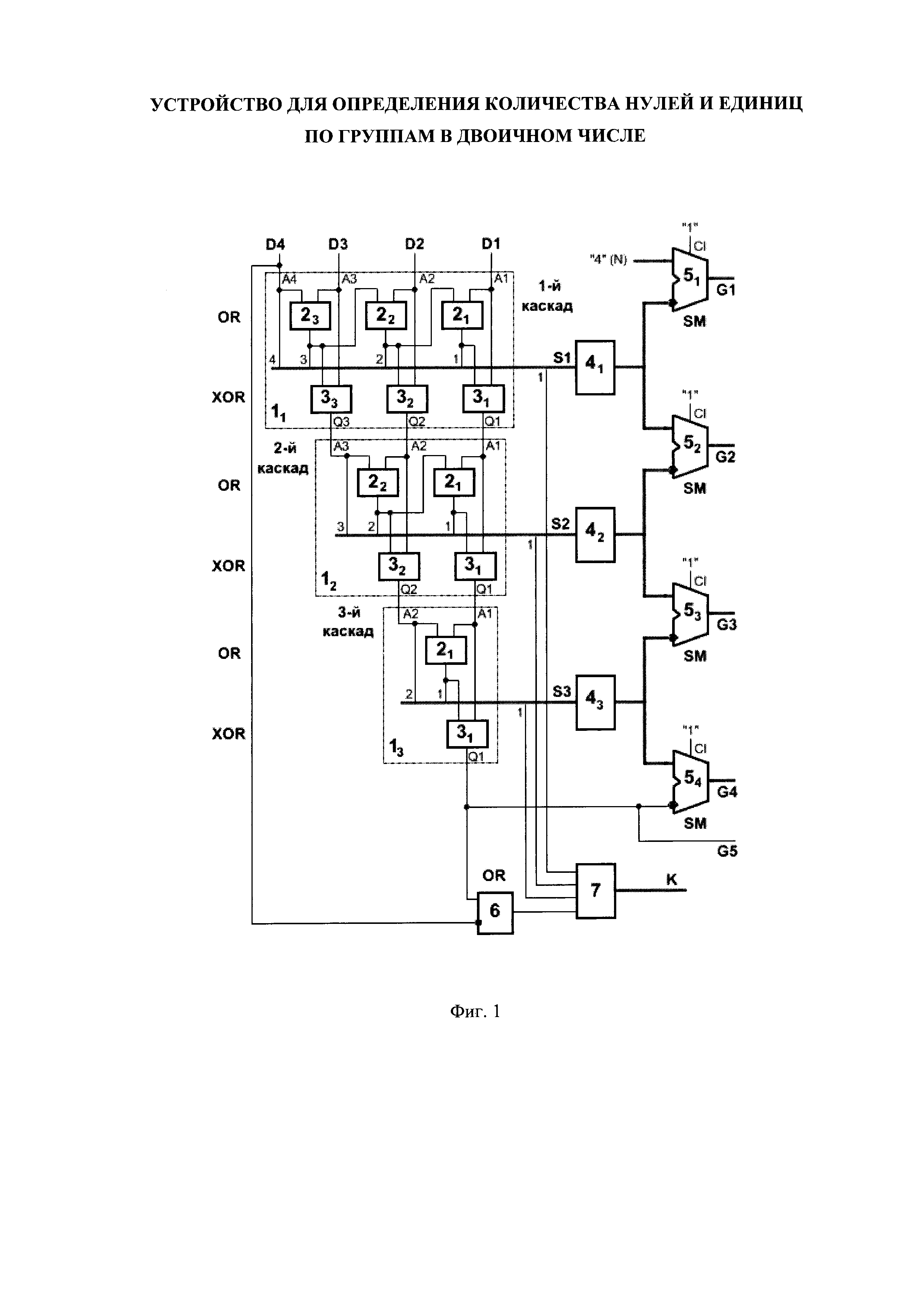 Устройство для определения количества нулей и единиц по группам в двоичном числе содержит N разрядов входного двоичного числа D1, D2, …, DN, (N+1) групп выходных данных G1, G1, …, G(N+1), выходную группу К количества групп нулей и единиц, группу из (N-1) внутренних шин упорядоченных двоичных чисел S1, S2, …, S(N-1), (N-1) каскадов формирователя упорядоченных двоичных чисел 11, 12, …, 1N, которые объединены в пирамидальную структуру, причем каждый i-й каскад 1i (i=1, …, (N-1)) содержит группу из (N-i) элементов ИЛИ 21, 22, …, 2(N-i), группу из (N-i) элементов XOR 31, 32, …, 3(N-i), группу из (N+1-i) входов A1, А2, …, A(N+1-i), группу из (N-i) выходов Q1, Q2, …, Q(N-i) в следующий каскад и группу из (N+1-i) выходов разрядов соответствующей i-й внутренней шины Si из группы S1, S2, …, S(N-1), а также в устройство введены первая группа из (N-i) блоков счета младших упорядоченных единиц 41, 42, …, 4(N-i), группа из N сумматоров 51, 52, …, 5N, с инверсной группой входов второго слагаемого, элемент ИЛИ с одним инверсным входом 6 и второй блок счета младших упорядоченных единиц 7, причем каждый i-й сумматор 5i содержит ]log2(N+3-i)[ (большее целое) разрядов, а последний N-й сумматор 5N содержит два разряда, причем N разрядов входного двоичного числа D1, D2, …, DN соединены с одноименными входами A1, А2, …, AN первого каскада 11, в каждом i-м каскаде первые (N-i) входов A1, А2, …, A(N-i), кроме последнего входа A(N+1-i), также соединены со вторыми входами соответствующих одноименных элементов ИЛИ 21, 22, …, 2(N-i) и вторыми входами одноименных элементов XOR 31, 32, …, 3(N-i), а первые входы первых (N-i-1) элементов 21, 22, …, 2(N-i-1) из группы элементов ИЛИ соединены с выходами соответствующих последующих элементов 22, 23, …, 2(N-i) из группы элементов ИЛИ, первый вход последнего элемента 2(N-i) из группы элементов ИЛИ соединен с последним входом запроса A(N+1-i) i-го каскада, выходы (N-i) элементов ИЛИ 21, 22, …, 2(N-i) соединены также с первыми входами соответствующих одноименных элементов XOR 31, 32, …, 3(N-i), выходы которых являются группой (N-i) выходов Q1, Q2, …, Q(N-i) в следующий каскад каждого i-го каскада, а выходы всех (N-i) элементов ИЛИ 21, 22, …, 2(N-i) являются одноименными первыми младшими (N-i) разрядами соответствующей i-й внутренней шины Si из группы S1, S2, …, S(N-1), а последний вход A(N+1-i) i-го каскада является старшим (N+1-i)-м разрядом соответствующей i-й внутренней шины Si, причем в первых (N-2) каскадах, кроме последнего (N-1)-го каскада, (N-i) выходов в следующий (i+1)-й каскад Q1, Q2, …, Q(N-i) соединены с соответствующими (N-i) одноименными входами A1, А2, …, A(N-i) следующего (i+1)-го каскада, все разряды каждой i-й внутренней шины Si из группы S1, S2, …, S(N-1) соединены с входами соответствующего одноименного блока 4i из первой группы из (N-i) блоков счета младших упорядоченных единиц, а выходы каждого i-го блока 4i соединены с инверсной группой входов второго слагаемого i-го сумматора 5i и первой группой прямых входов первого слагаемого (i+1)-го сумматора 5(i+1) из группы из N сумматоров 51, 52, …, 5N, выходы которых являются соответствующими первыми N группами выходных данных G1, G2, …, GN, а последний одноразрядный выход G(N+1) соединен с выходом Q1 последнего (N-1) каскада 1(N-1), который также соединен со второй инверсной группой входов последнего N-го сумматора 5N и первым прямым входом элемента ИЛИ с одним инверсным входом 6, второй инверсный вход которого соединен со старшим N-м разрядом DN входного двоичного числа, на группу первых прямых входов первого сумматора 51 подано двоичное число «