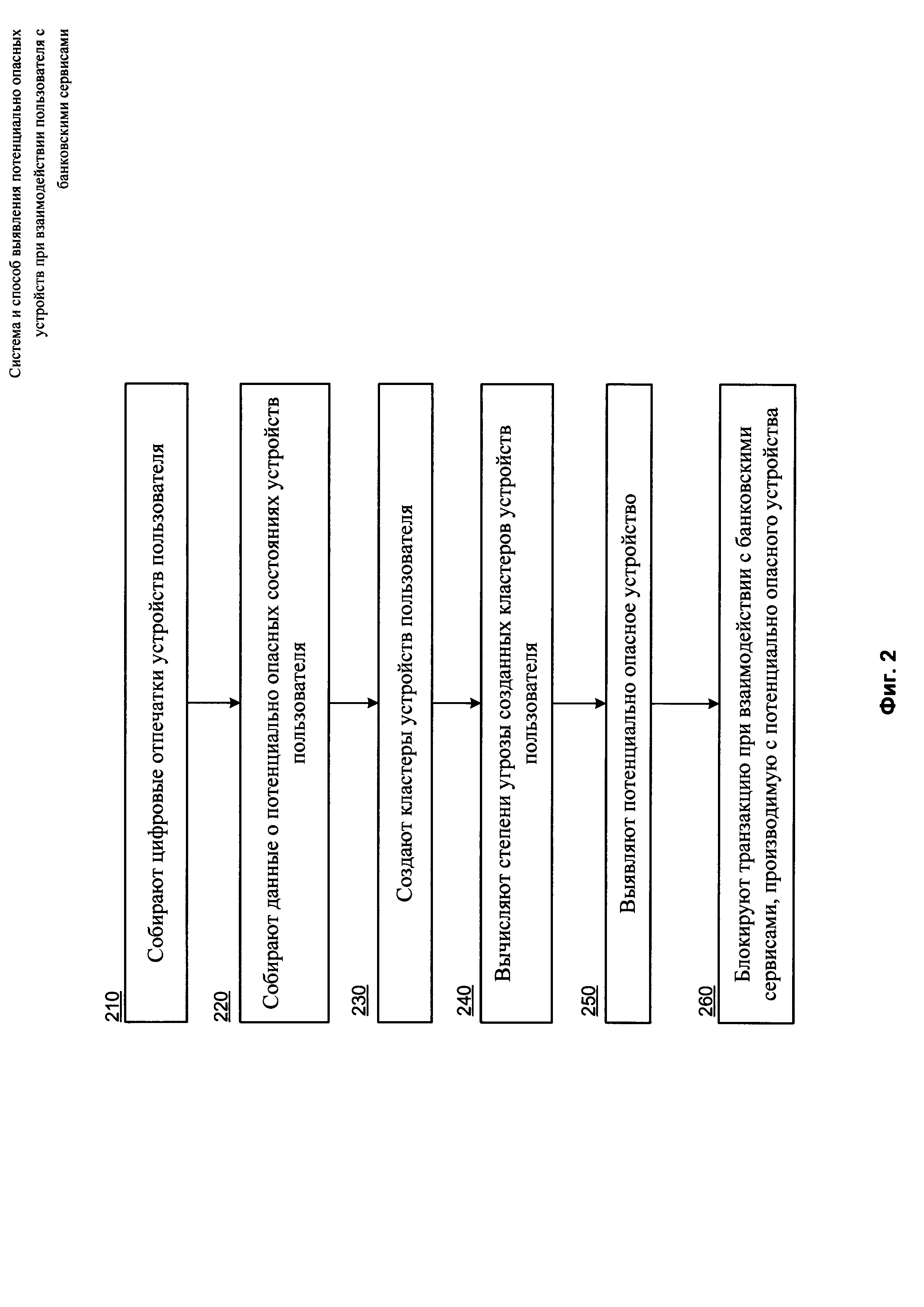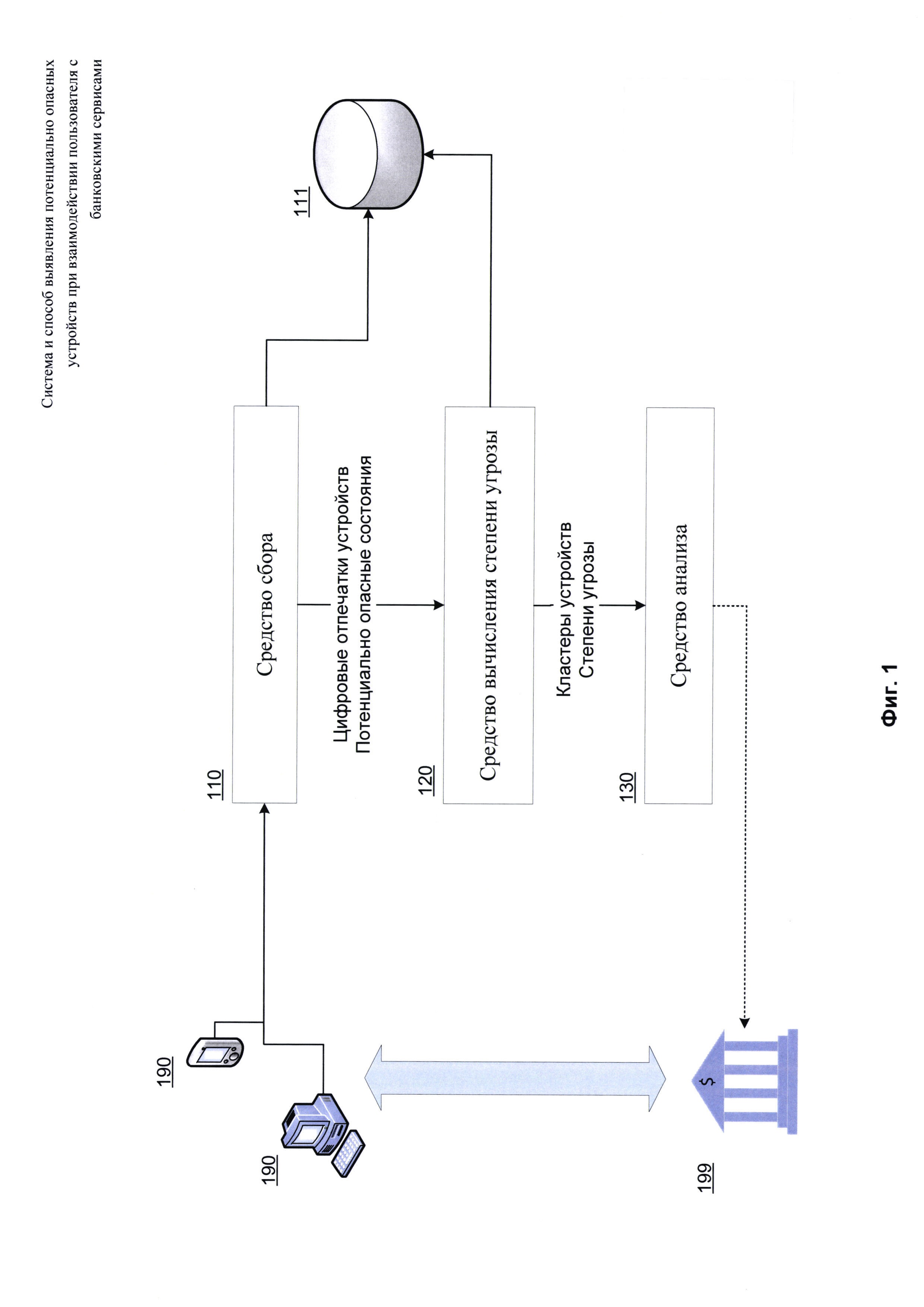 1. Система выявления потенциально опасных устройств среди устройств, посредством которых пользователь взаимодействует с банковскими сервисами, которая содержит: - сбора цифровых отпечатков устройств пользователя, при этом отпечаток содержит по меньшей мере одну характеристику упомянутого устройства пользователя; - сбора данных о потенциально опасных состояниях упомянутого устройства пользователя; - передачи собранных данных средству вычисления степени угрозы; - вычисления степеней угрозы устройства пользователя, при этом степень угрозы есть числовая величина, пропорциональная частоте встречаемости потенциально опасного состояния; - создания кластеров устройств на основании по меньшей мере одной характеристики устройства, полученной при сборе отпечатка устройства; - вычисления степеней угрозы созданных кластеров устройств пользователей; - передачи созданных кластеров и вычисленных степеней угрозы средству анализа; 2. Система по п. 1, в которой характеристиками устройства являются: - идентификатор операционной системы, под управлением которой работает устройство; - местоположение устройства; - региональные характеристики прошивки устройства; - идентификатор аккаунта; - данные о том, функционирует ли устройство в рамках виртуальной машины или эмулятора; - версия браузера; - плагины, установленные в браузере устройства; - уязвимые приложения, установленные на устройстве. 3. Система по п. 1, в которой потенциально опасным состоянием является наличие корневого доступа на устройстве. 4. Система по п. 1, в которой собирают информацию о потенциально опасных состояниях устройства пользователя из Kaspersky Security Network. 5. Система по п. 1, в которой блокируют транзакцию при взаимодействии с банковскими сервисами, производимую с потенциально опасного устройства. 6. Способ выявления потенциально опасных устройств среди устройств, посредством которых пользователь взаимодействует с банковскими сервисами, реализуемый с помощью средства сбора, средства вычисления степени угрозы и средства анализа и содержащий этапы, на которых: а) собирают цифровые отпечатки устройств пользователя, при этом отпечаток содержит по меньшей мере одну характеристику упомянутого устройства пользователя; б) собирают данные о потенциально опасных состояниях упомянутого устройства пользователя; в) создают кластеры устройств пользователя на основании по меньшей мере одной характеристики устройства, полученной при сборе отпечатка устройства; г) вычисляют степени угрозы созданных кластеров устройств пользователя, при этом степень угрозы есть числовая величина, пропорциональная частоте встречаемости потенциально опасного состояния; д) выявляют потенциально опасное устройство, при этом потенциально опасным считается устройство, соответствующее по меньшей мере двум кластерам устройств со степенями угрозы, превышающими пороговое значение, при этом каждый кластер создан на основании различных характеристик устройств. 7. Способ по п. 6, в котором характеристиками устройства являются: - идентификатор операционной системы, под управлением которой работает устройство; - местоположение устройства; - региональные характеристики прошивки устройства; - идентификатор аккаунта; - данные о том, функционирует ли устройство в рамках виртуальной машины или эмулятор