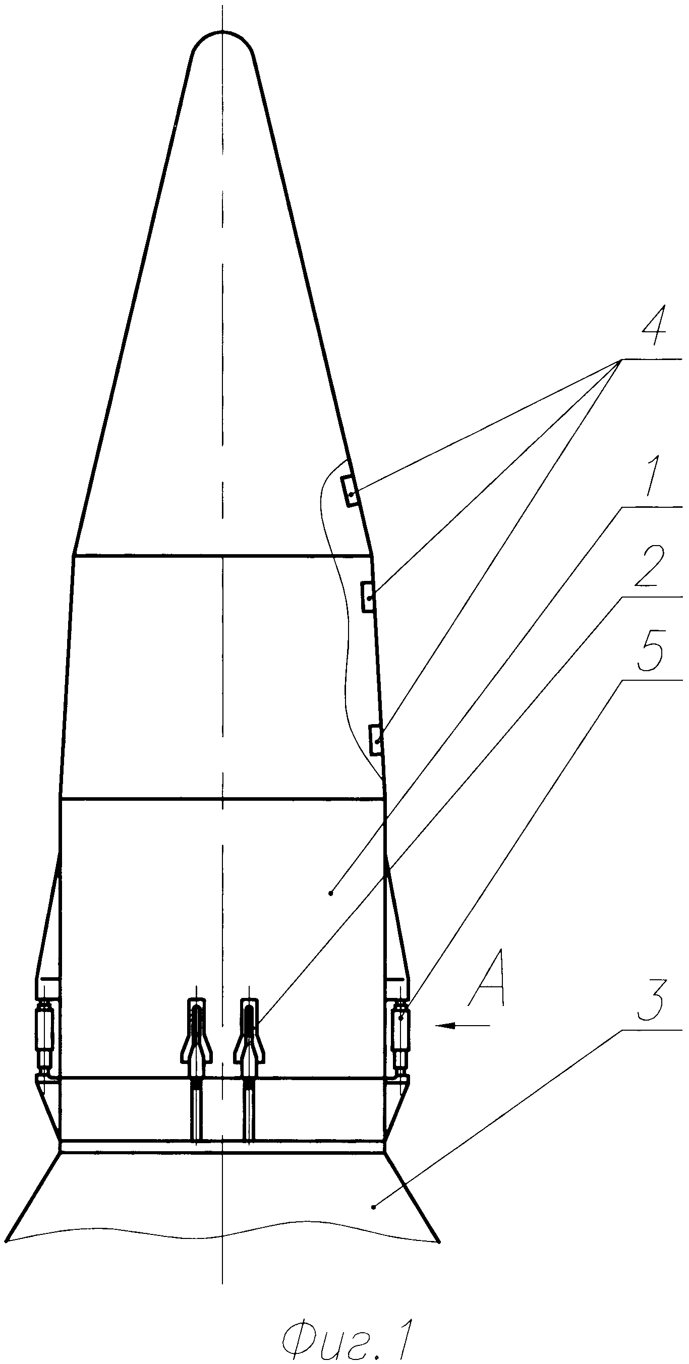 Предложенное изобретение относится к области ракетной техники и может быть использовано при разработке ракет-носителей. Наиболее близким по набору существенных признаков является техническое решение по патенту РФ №2406662, B64G 1/64, F42B 51/36, 2009 г., которое и было принято авторами за аналог. Данное техническое решение представляет собой устройство разделения и сброса головного обтекателя ракеты-носителя и содержит закрепленные на ней с возможностью вращения створки, толкатели, установленные на наружной поверхности створок, опирающиеся на фитинги ракеты-носителя, регулируемые в осевом направлении, связанными со штоками толкателей хвостовиками, имеющими сферические законцовки. Толкатель выполнен в виде пневмоцилиндра, а на каждой створке с ее внутренней стороны установлен аккумулятор давления, связанный через клапан открытия и пневмомагистрали с установленными на той же створке пневмоцилиндрами. К недостаткам данного устройства следует отнести то, что данное устройство имеет сложную конструкцию толкателей, что приводит к снижению надежности разделения и сброса головного обтекателя ракеты-носителя. Наличие аккумуляторов давления, установленных с внутренних сторон створок, приводит к уменьшению полезного объема под обтекателем, а также к необходимости дополнительных элементов сигнализации для задействования системы. Также в процессе длительного хранения (10 лет и более) в состоянии постоянной готовности (дежурства) появляется необходимость в проведении регламентных работ и проверок. Целью предлагаемого изобретения является создание устройства разделения и сброса головного обтекателя ракеты-носителя простой конструкции и повышение надежности разделения и сброса головного обтекателя. Указанная цель достигается тем, что устройство разделения и сброса головного обтекателя ракеты-носителя содержит закрепленные на ней с возможностью вращения створки, толкатели, шарнирно установленные на наружной поверхности створок, опирающиеся на фитинги ракеты-носителя, связанные со штоками толкателей хвостовиками, имеющими сферические законцовки. Каждый толкатель содержит внешний и внутренний цилиндры, телескопически соединенные между собой с возможностью продольного перемещения друг относительно друга. Внутренний цилиндр состоит из штока, шарнирно соединенного с одной из створок, и верхней крышки, жестко закрепленной на штоке. Внешний цилиндр состоит из гильзы, соединенной с хвостовиком с возможностью поступательного движения, и нижней крышки, жестко закрепленной на гильзе. На верхней крышке установлен стакан, а на нижней крышке установлен малый стакан, которые телескопически соединены между собой с образованием полости между нижней и верхней крышками. В полости установлены одна в другой пружины с противоположным направлением навивки. Сущность изобретения поясняется чертежами, где на фиг. 1 и 2 изображено устройство разделения и сброса головного обтекателя ракеты-носителя, установленное на ракете-носителе. На фиг. 1 и 2 указаны позиции в следующем порядке: 1 - створка; 2 - шарнир; 3 - ракета-носитель; 4 - замок продольного стыка; 5 - толкатель; 6 - фитинг; 7 - хвостовик; 8 - сферическая законцовка; 9 - внутренний цилиндр; 10 - внешний цилиндр; 11 - шток; 12 - верхняя крышка; 13 - гильза; 14 - нижняя крышка; 15 - стакан; 16 - малый стакан; 17 - полос