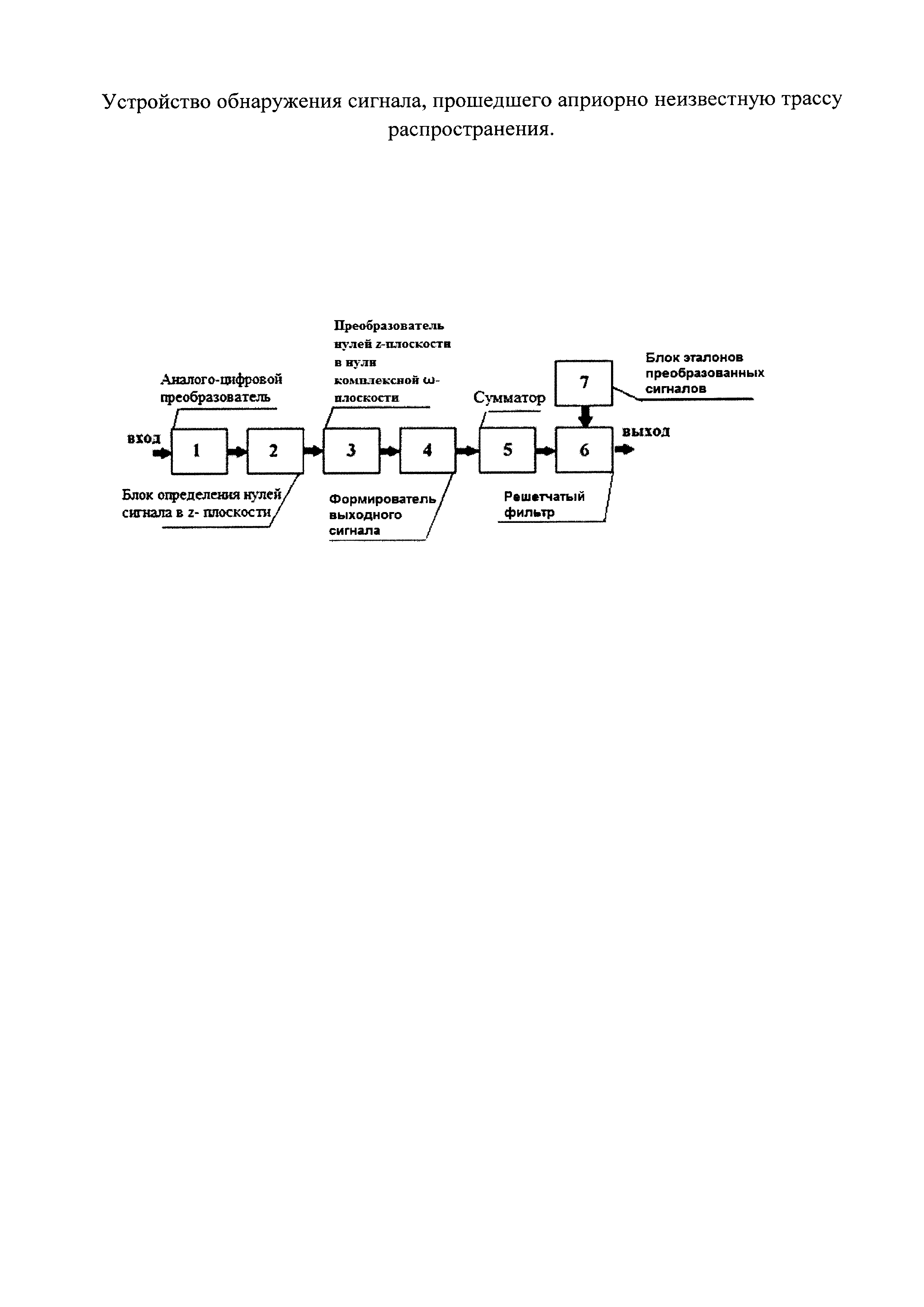 Изобретение относится к цифровой технике обработки сигналов в части обнаружения аналогового сигнала по его преобразованным нулям Фурье-образа. Известно устройство [L. Chudnovskiy, V. IvanovNoiseSignalSelf-SynchronizationinOptimalDetectionSystems // AIS-2016 «ATMOSPHERE, IONOSPHERE, SAFETY», Kaliningrad, 2016, ISBN 978-5-9971-0412-2, P. 316-319] факторизации исходного сигнала и импульсной характеристики трассовых искажений по нулям Фурье-образа в комплексной плоскости частот. Недостаток устройства - отсутствие в нем автоматизации разделения нулей Фурье-образа на сигнальные и трассовые нули. Наиболее близким техническим решением является устройство [Л.С. Чудновский Восстановление речевого сигнала, искаженного линейной трассой распространения // Проблемы криминалистической экспертизы видео и звукозаписи / Мин. юстиции СССР, ВНИИСЭ. - М., 1990, 45-55], содержащее последовательно расположенные аналого-цифровой преобразователь, блок определения нулей сигнала и согласованный фильтр. Недостаток устройства заключается в большом объеме вычислительных процедур, реализующих данный способ. Технический результат изобретения - уменьшение объема вычислительных затрат за счет того, что блок определения нулей сигнала имеет объемный алгоритм обработки сигнала, сказывающийся на быстродействии устройства. Технический результат достигается тем, что в устройстве обнаружения сигнала, прошедшего априорно неизвестную трассу распространения, содержащем последовательно расположенные аналого-цифровой преобразователь, блок определения нулей сигнала и фильтр, являющийся выходом устройства, между блоком определения нулей сигнала и фильтром дополнительно введены расположенные друг за другом преобразователь нулей z-плоскости в нули комплексной ω-плоскости, формирователь выходного сигнала и сумматор, причем фильтр выполнен решетчатым с дополнительным входом, к которому подключен дополнительно введенный блок хранения эталонов преобразованных сигналов, сам блок определения нулей сигнала выполнен в z-плоскости с возможностью обнаружения импульсного сигнала по превышению порога в точке n0 и осуществления его финитизации на отрезке [n0-n1;n0+n2] с расчетом корней полинома X(Zk) - произведение корней полинома; Zk - корень полинома; x(n) - оцифрованная последовательность входного сигнала; Zn - переменная степени полинома и передачи полученных значений в преобразователь нулей z-плоскости в нули комплексной ω-плоскости. На рисунке изображена структурная схема устройства. Устройство содержит: аналого-цифровой преобразователь 1, блок определения нулей сигнала в z-плоскости 2, преобразователь нулей z-плоскости в нули комплексной ω-плоскости 3, формирователь выходного сигнала 4, сумматор 5, решетчатый фильтр 6, блок эталонов преобразованных сигналов 7. Расположенные друг за другом преобразователь нулей z-плоскости в нули комплексной ω-плоскости 3, формирователь выходного сигнала 4, сумматор 5, решетчатый фильтр 6 с двумя входами и блок эталонов преобразованных сигналов 7 введены дополнительно. Дополнительно введенный блок эталонов преобразованных сигналов 7 присоединен к дополнительному входу решетчатого фильтра 6. Блок определения нулей сигнала в z-плоскости 2 выполнен с возможностью обнаружения импульсного сигнала по превышению порога в точке n0 и осуществления его финитизации на отрезке [n0-n1; n0+n2] с расчетом корней полинома X(Zk) - произв
