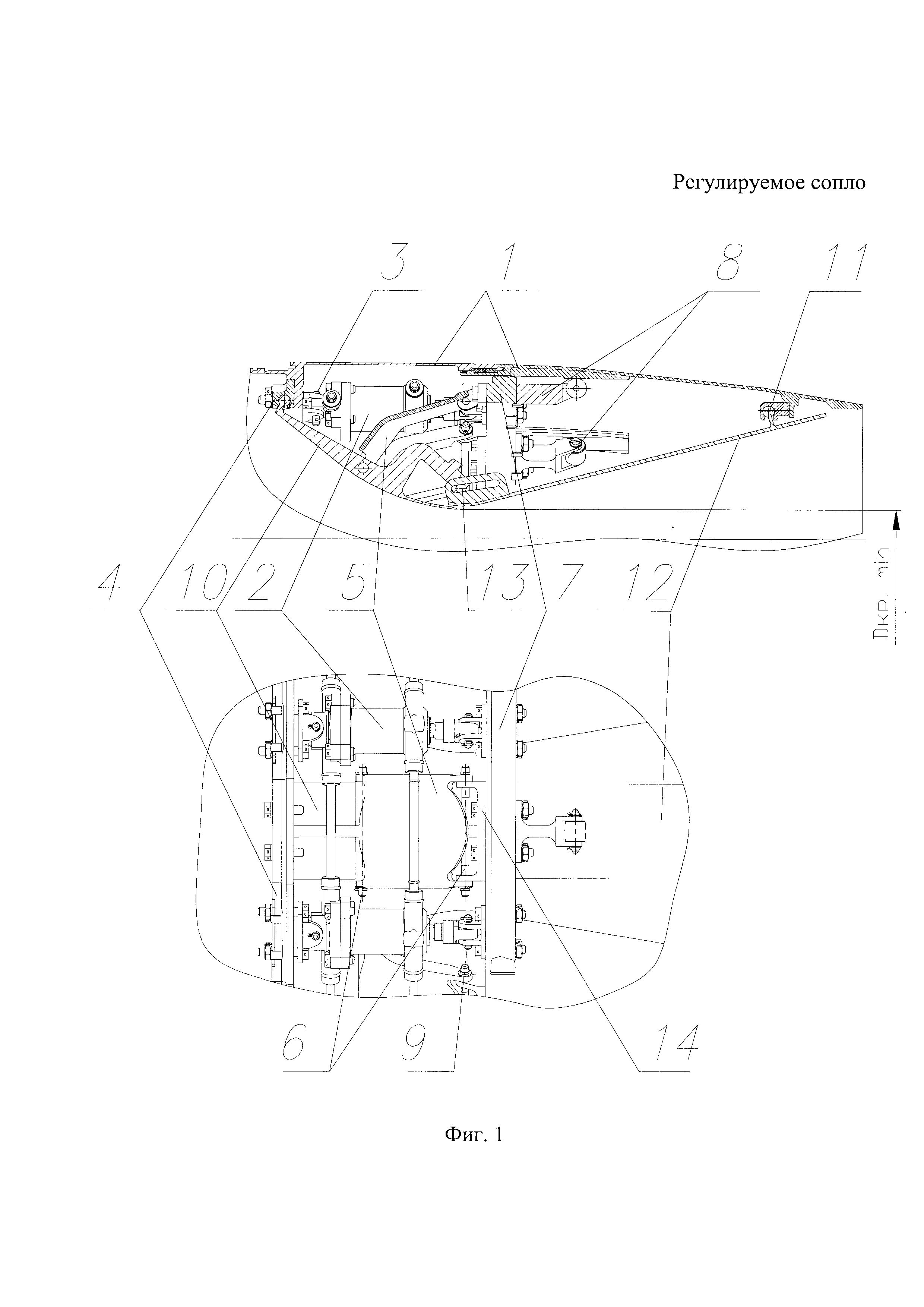 Изобретение относится к ракетной технике и описывает устройство регулируемого сопла с регулирующим приводом и механизмом синхронизации. Регулируемое сверхзвуковое сопло содержит корпус, шарнирно закрепленные на нем дозвуковые и сверхзвуковые створки, образующие канал для истечения продуктов сгорания, привод створок и механизм синхронизации. Корпус сопла выполнен из двух жестко соединенных цилиндрической и ожевальной оболочек с уплотнением, обеспечивающим герметичность по внешнему обводу корпуса. Площадь входного и выходного сечений сопла нерегулируема, а дозвуковые и сверхзвуковые створки шарнирно скреплены с корпусом сопла. Дозвуковые створки, кинематически связанные с приводом створок, и соответствующие им сверхзвуковые створки являются ведущими. Дозвуковые и сверхзвуковые ведущие створки свободными концами попарно скреплены между собой с помощью оси вращения, размещенной в выполненном в створке пазу, с возможностью продольного перемещения. Привод сопла выполнен в виде осей, вилок, гидроцилиндров с поршнями и силового кольца синхронизации с роликами, опирающегося на корпус сопла. Гидроцилиндры объединены коллекторами, соединяющими соответствующие полости гидроцилиндров в кольцо, и шарнирно скреплены с корпусом сопла посредством осей вращения. Силовое кольцо синхронизации шарнирно скреплено через оси вращения со всеми штоками поршней гидроцилиндров с возможностью продольного перемещения вдоль оси сопла. Шарниры крепления дозвуковых створок, закрепленные по многограннику на корпусе сопла, вилки, оси вращения и тяги, скрепленные с ведущими дозвуковыми створками с одной стороны и с силовым кольцом