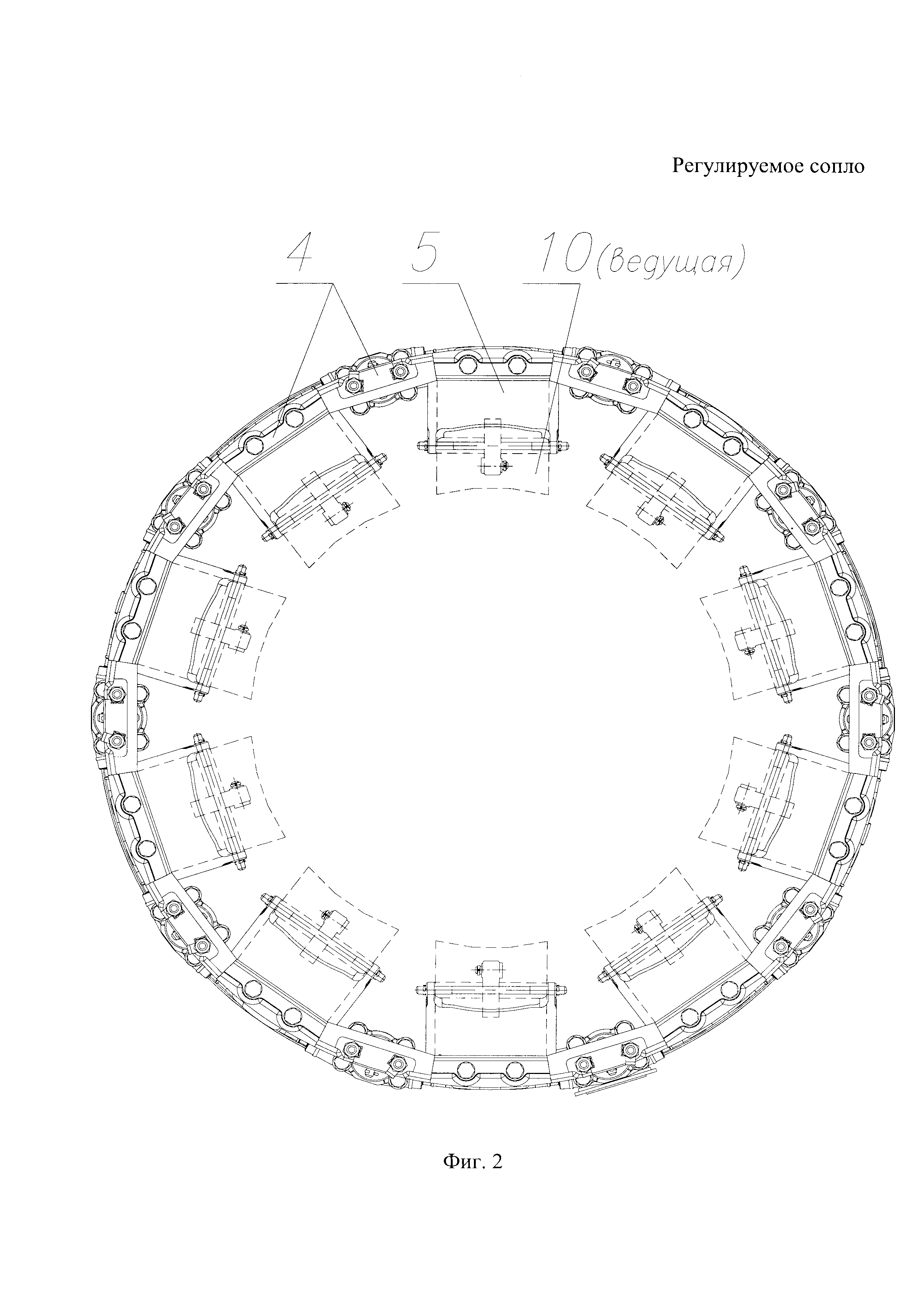 Изобретение относится к ракетной технике и описывает устройство регулируемого сопла с регулирующим приводом и механизмом синхронизации. Известно регулируемое сопло (авторское свидетельство РФ №1009150, 1980 г.), содержащее корпус сопла, закрепленные на нем дозвуковые и внешние створки, соединенные со сверхзвуковыми створками, механизм синхронизации в виде основных и дополнительных рычагов. Конструкция выполнена таким образом, что используются 3 вида створок и 2 привода створок для формирования проточной части продуктов сгорания: дозвуковые, внешние и сверхзвуковые створки, привод внутренних створок, привод внешних створок, что значительно усложняет конструкцию, снижает надежность, приводит к внешней негерметичности, увеличению габаритов и массы сопла. Механизм синхронизации выполнен в виде основных и шарнирно связанных с ним дополнительных рычагов, причем каждый дополнительный рычаг шарнирно связан с внешней створкой и корпусом, что также значительно усложняет конструкцию сопла, увеличивая ее вес и габариты, особенно в радиальном направлении. Зазоры и неточности установки рычагов за счет деформации приводят к отклонению вектора тяги от оси сопла. Для летательного аппарата, стартующего из-под воды, а также длительного хранения, необходима герметичность по внешнему обводу сопла, что приведет к значительному усложнению конструкции, увеличению массы и габаритов существующего сопла. Целью предлагаемого технического решения является устранение указанных недостатков: упрощение конструкции, уменьшение массы, габаритов регулируемого сопла, повышение надежности работы сопла, уменьшение отклонения вектора тяги от оси сопла, увеличение диапазона регулирования критического сечения сопла и обеспечение герметичности по внешнему обводу сопла. Указанная цель достигается тем следующим образом. Регулируемое сверхзвуковое сопло, содержащее корпус, шарнирно закрепленные на нем дозвуковые и сверхзвуковые створки, образующие канал для истечения продуктов сгорания, привод створок и механизм синхронизации, отличающееся тем, что корпус сопла выполнен из двух жестко соединенных цилиндрической и ожевальной оболочек с уплотнением, обеспечивающим герметичность по внешнему обводу корпуса, при этом площадь входного и выходного сечений нерегулируема, дозвуковые и сверхзвуковые створки шарнирно скреплены с корпусом сопла, причем дозвуковые створки, кинематически связанные с приводом створок, и соответствующие им сверхзвуковые створки являются ведущими, дозвуковые и сверхзвуковые ведущие створки свободными концами попарно скреплены между собой с помощью оси вращения, размещенной в выполненном в створке пазу, с возможностью продольного перемещения, привод сопла выполнен в виде осей, вилок, гидроцилиндров с поршнями, силового кольца синхронизации с роликами, опирающегося на корпус сопла, причем гидроцилиндры объединены коллекторами, соединяющими соответствующие полости гидроцилиндров в кольцо, и шарнирно скреплены с корпусом сопла посредством осей вращения, силовое кольцо синхронизации шарнирно скреплено через оси вращения со всеми штоками поршней гидроцилиндров с возможностью продольного перемещения вдоль оси сопла, при этом шарниры крепления дозвуковых створок, закрепленные по многограннику на корпусе сопла, вил