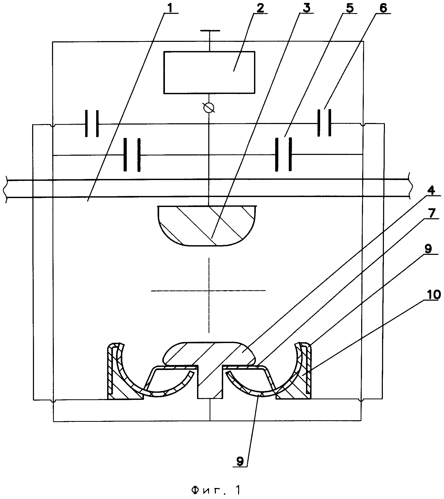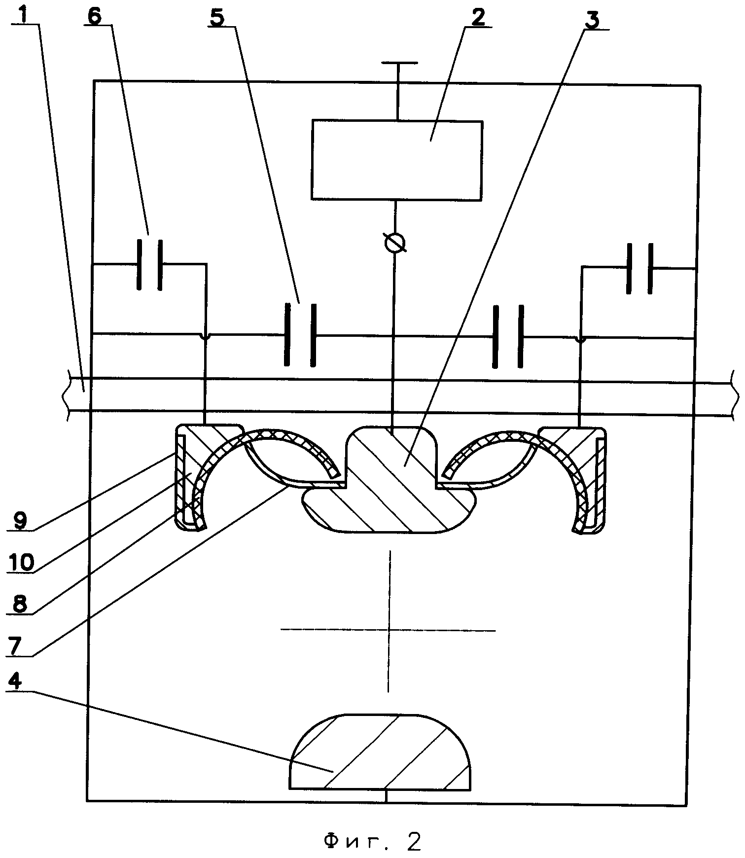 Изобретение относится к квантовой электронике, в частности к мощным импульсно-периодическим газоразрядным лазерам, преимущественно эксимерным, с поперечным самостоятельным разрядом и УФ предыонизацией. Область применений включает лазерную микрообработку материалов, отжиг аморфного кремния (α-Si) при производстве плоских дисплеев, производство высокотемпературных сверхпроводников методом импульсной лазерной абляции и др. Известна разрядная система газового лазера [1], в которой УФ предыонизация осуществляется разрядами через диэлектрический барьер, зажигаемыми сбоку от высоковольтного электрода. При использовании в эксимерном лазере разрядная система позволяет эффективно получать энергию генерации при высокой частоте следования импульсов. Недостатком указанного устройства является малый уровень предыонизации, ограничивающий возможность увеличения апертуры основного разряда, повышения энергии генерации и средней мощности лазера. Этого недостатка лишена разрядная система газового лазера с УФ предыонизацией, осуществляемой излучением от двух рядов искр, автоматически зажигаемых при зарядке импульсных конденсаторов сбоку от высоковольтного электрода, расположенного со стороны стенки корпуса лазера [2]. Данная система обеспечила достижение высокой (600 Вт) средней мощности лазерного УФ излучения в эксимерном KrF лазере. Недостатком электродной системы с УФ предыонизатором в виде рядов отдельных искровых промежутков является пространственная неоднородность предыонизации по длине электродов, что уменьшает КПД лазера, и ее сложность из-за необходимости герметизировать десятки токовводов предыонизатора. Кроме того, искровые промежутки обусловливают повышенное поступление в газ продуктов эрозии электродов предыонизатора, что уменьшает время жизни газовой смеси лазера. Частично этих недостатков лишена разрядная система газового лазера с предыонизацией, осуществляемой через частично прозрачный электрод УФ излучением завершенного скользящего разряда по поверхности плоской диэлектрической пластины [3]. В данной электродной системе обеспечивается высокий уровень и пространственная однородность предыонизации разрядной зоны между высоковольтным и заземленным электродами лазера. Достигается возможность повышения энергии генерации и средней мощности излучения лазера. При этом реализуется возможность в несколько раз уменьшить прокачиваемую через предыонизатор энергию, что, в свою очередь, повышает время жизни газовой смеси. При генерации на XeCl средняя мощность УФ лазера с данной электродной системой достигала более 1 кВт. Однако частично прозрачный электрод с предыонизатором, расположенным со стороны его нерабочей поверхности, имеет относительно большие поперечные размеры, что повышает индуктивность разрядного контура. Этот фактор ограничивает получение высокоэффективной генерации в эксимерных лазерах на фторидах инертных газов (KrF, ArF), для которых наблюдается резкая зависимость эффективности лазера от индуктивности разрядного контура. Кроме этого частично прозрачные электроды сложны и дороги в изготовлении. Наиболее близким техническим решением, выбранным в качестве прототипа, является разрядная система газового лазера, содержащая размещенные в корпусе лазера протяженные первый и вто