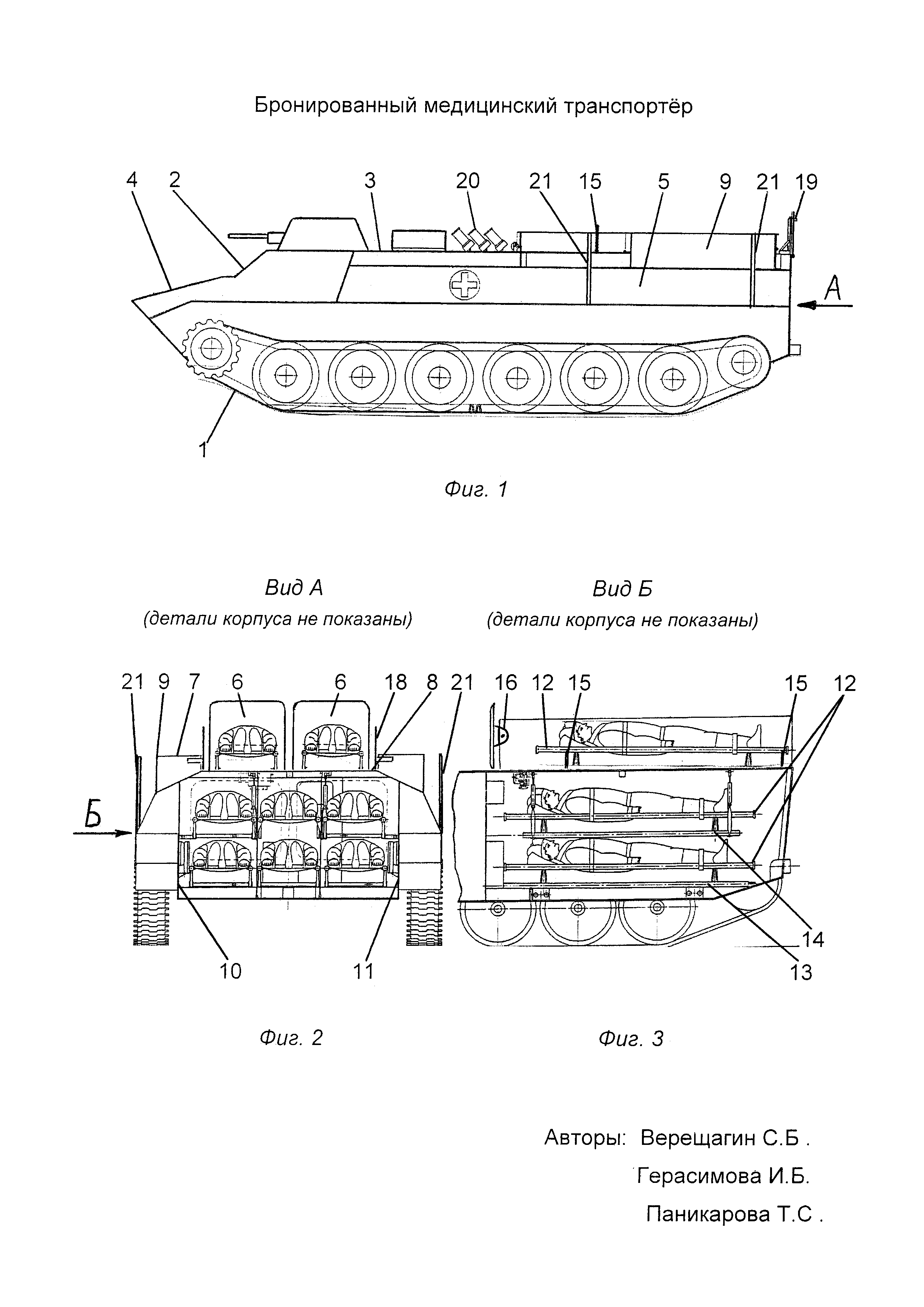 1. Бронированный медицинский транспортер, содержащий ходовую часть с гусеничным движителем, независимой торсионной подвеской и амортизаторами, а также расположенные в едином корпусе отделения управления, моторно-трансмиссионное и медицинское с бронированными крышками верхних люков, при этом медицинское отделение внутри выполнено с проходом и двумя ярусами размещения раненых как на носилках, так и на откидных сиденьях - в соответствии с выбранным вариантом, причем на первом нижнем ярусе носилки размещены слева и справа от прохода вдоль бортов на складных рамах, а на втором ярусе - с установкой вдоль бортов и подвеской на ремнях со стороны прохода, медицинское отделение имеет в своем составе систему механической погрузки-выгрузки раненых, включающую устройство для подъема и перемещения носилок на соответствующий ярус, а также лебедку с приводом на крыше медицинского отделения для подтаскивания раненых с помощью волокуши, отличающийся тем, что медицинское отделение дополнительно оснащено третьим ярусом размещения раненых на носилках, а устройство для подъема и перемещения носилок выполнено в виде складного трапа, причем третий ярус размещения раненых на носилках расположен на крыше медицинского отделения и выполнен защищенным от пуль и осколков, причем внутри медицинское отделение дополнительно снабжено парой носилок, при необходимости размещаемых в проходе с подвеской на ремнях на первом и втором ярусах, а носилки на втором ярусе вдоль бортов размещены на складных рамах с возможностью крепления последних вдоль бортов и подвески на ремнях со стороны прохода и их складывания вдоль бортов, при этом подвеска как складных рам на всех ярусах, так и носилок в проходе выполнена с использованием амортизирующих устройств, а лебедка с приводом установлена на внутренней поверхности крышки одного из верхних люков медицинского отделения. 2. Транспортер по п. 1, отличающийся тем, что защита размещенных на третьем ярусе раненых от пуль и осколков выполнена с помощью поднимаемых боковых и заднего бронещитов, укрывающих в обычном положении топливные баки, а также открытых бронированных крышек верхних люков медицинского отделения. 3. Транспортер по п. 1, отличающийся тем, что третий ярус размещения раненых на крыше медицинского отделения дополнительно снабжен тентом, закрывающим раненых от осадков. 4. Транспортер по п. 1, отличающийся тем, что он дополнительно снабжен системой защиты личного состава от воздействия ударной волны и радиационной пыли. 5. Транспортер по п. 1, отличающийся тем, что он дополнительно снабжен системой жизнеобеспечения личного состава в виде фильтровентиляционной и отопительно-вентиляционной установок. 6. Транспортер по п. 1, отличающийся тем, что медицинское отделение выполнено с тепло-шумоизоляцией. 7. Транспортер по п. 1, отличающийся тем, что он дополнительно снабжен наружной системой дымовой маскировки.