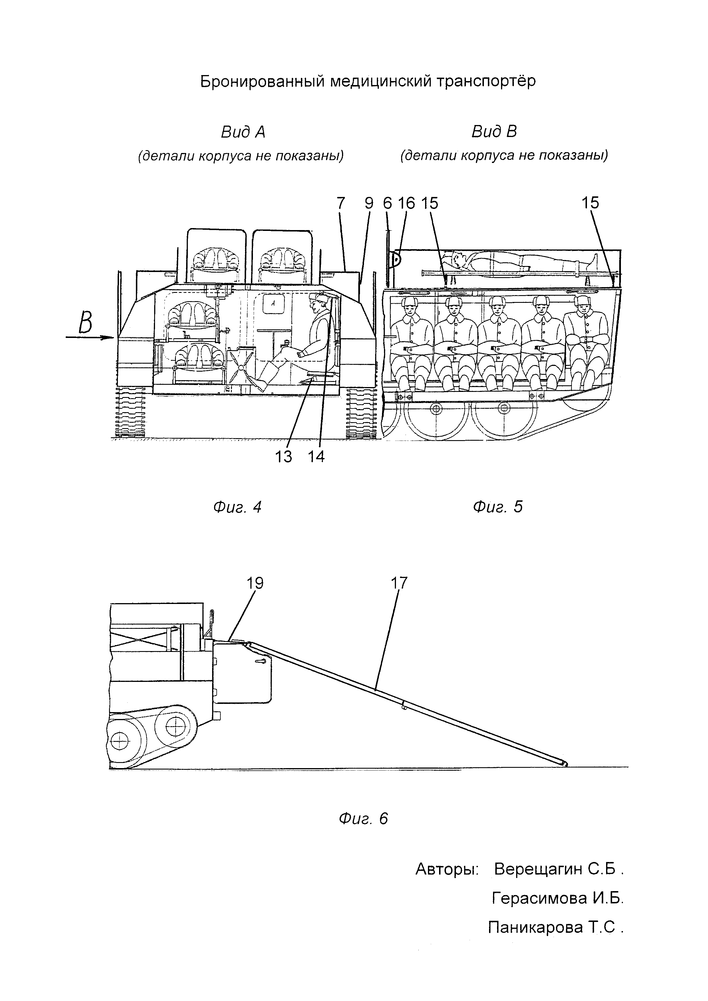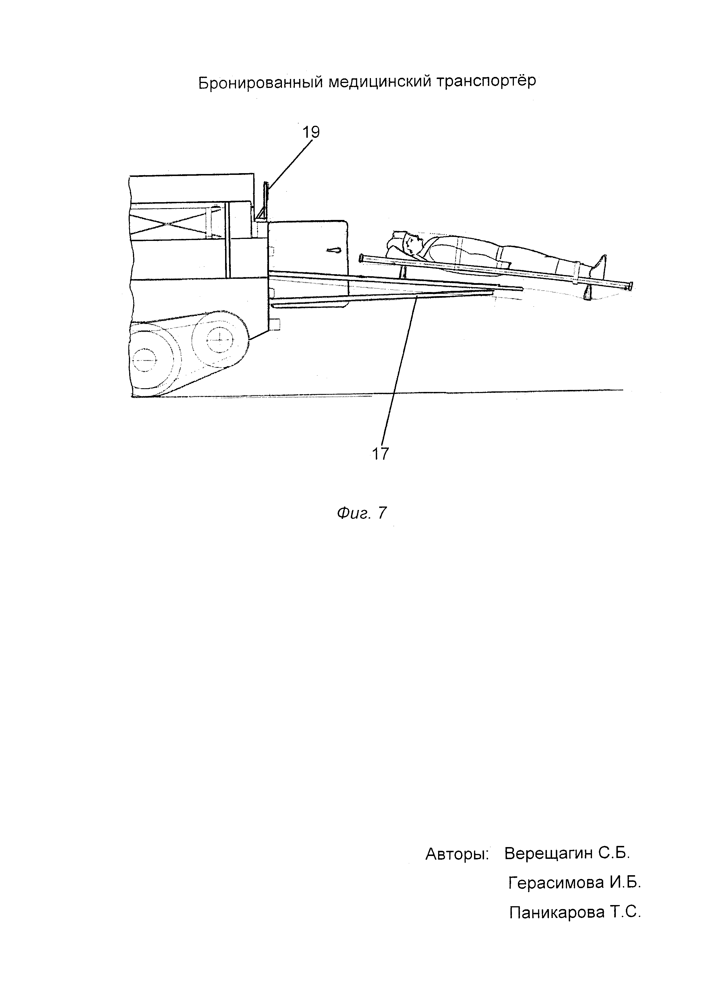 Изобретение относится к бронированным машинам, предназначенным для санитарно-эвакуационных работ при боевых действиях. Известна многоцелевая бронированная медицинская машина колесного типа, имеющая отделение управления, отделение силовой установки и медицинское отделение, предназначенное для размещения раненых на носилках и сиденьях и оборудованное системой механизации погрузки-выгрузки раненых (Военно-медицинский журнал, 1996, №11, внутренняя левая сторона разворота обложки). Однако эта медицинская машина предназначена для использования в составе воинских частей, на оснащении которых состоит только колесная техника, и не обладает достаточной вместимостью раненых и эффективностью оказания медицинской помощи. Близким по конструкции к предложенному является бронированный медицинский транспортер, включающий в себя ходовую часть с гусеничным движителем, а также отделения управления, моторно-трансмиссионное и медицинское с медицинским и санитарно-хозяйственным имуществом (патент РФ N 2086894, Мкл. F41H 7/02, опубл. 1997). Недостатки этого бронированного медицинского транспортера связаны с отсутствием системы маскировки, невозможностью преодоления водных преград, нерациональной планировкой медицинского отделения и малоэффективной его механизацией. Наиболее близким к предложенному является принятый в качестве прототипа бронированный медицинский транспортер, имеющий ходовую часть с гусеничным движителем, отделения управления, моторно-трансмиссионное и медицинское с медицинским и санитарно-хозяйственным имуществом. Транспортер оборудован также системой маскировки и оборудованием для преодоления водных преград (патент РФ N 2130578, Мкл. F16H 7/00, опубл. 1998). Недостатки этого бронированного медицинского транспортера связаны с невозможностью максимальной загрузки лежачих раненых внутрь медицинского отделения и на грузовую площадку на его крыше, а также с уязвимостью медицинского экипажа при осуществлении процесса загрузки. Техническая задача изобретения заключается в обеспечении максимального количества перевозимых раненых в условиях защиты от пуль и осколков при уменьшении времени их погрузки и обеспечении безопасности личного состава. Поставленная техническая задача решается тем, что в бронированном медицинском транспортере, содержащем ходовую часть с гусеничным движителем, независимой торсионной подвеской и амортизаторами, а также расположенные в едином корпусе отделения управления, моторно-трансмиссионное и медицинское с бронированными крышками верхних люков, при этом медицинское отделение внутри выполнено с проходом и двумя ярусами размещения раненых как на носилках, так и на откидных сиденьях - в соответствии с выбранным вариантом, причем на первом нижнем ярусе носилки размещены слева и справа от прохода вдоль бортов на складных рамах, а на втором ярусе - с установкой вдоль бортов и подвеской на ремнях со стороны прохода, и имеет в своем составе систему механической погрузки-выгрузки, раненых включающую устройство для подъема и перемещения носилок на соответствующий ярус, выполненное в виде специального складного трапа, медицинское отделение дополнительно оснащено третьим, ярусом размещения раненых на носилках, причем третий ярус размещения раненых на носилках расположен на крыше медицинского от