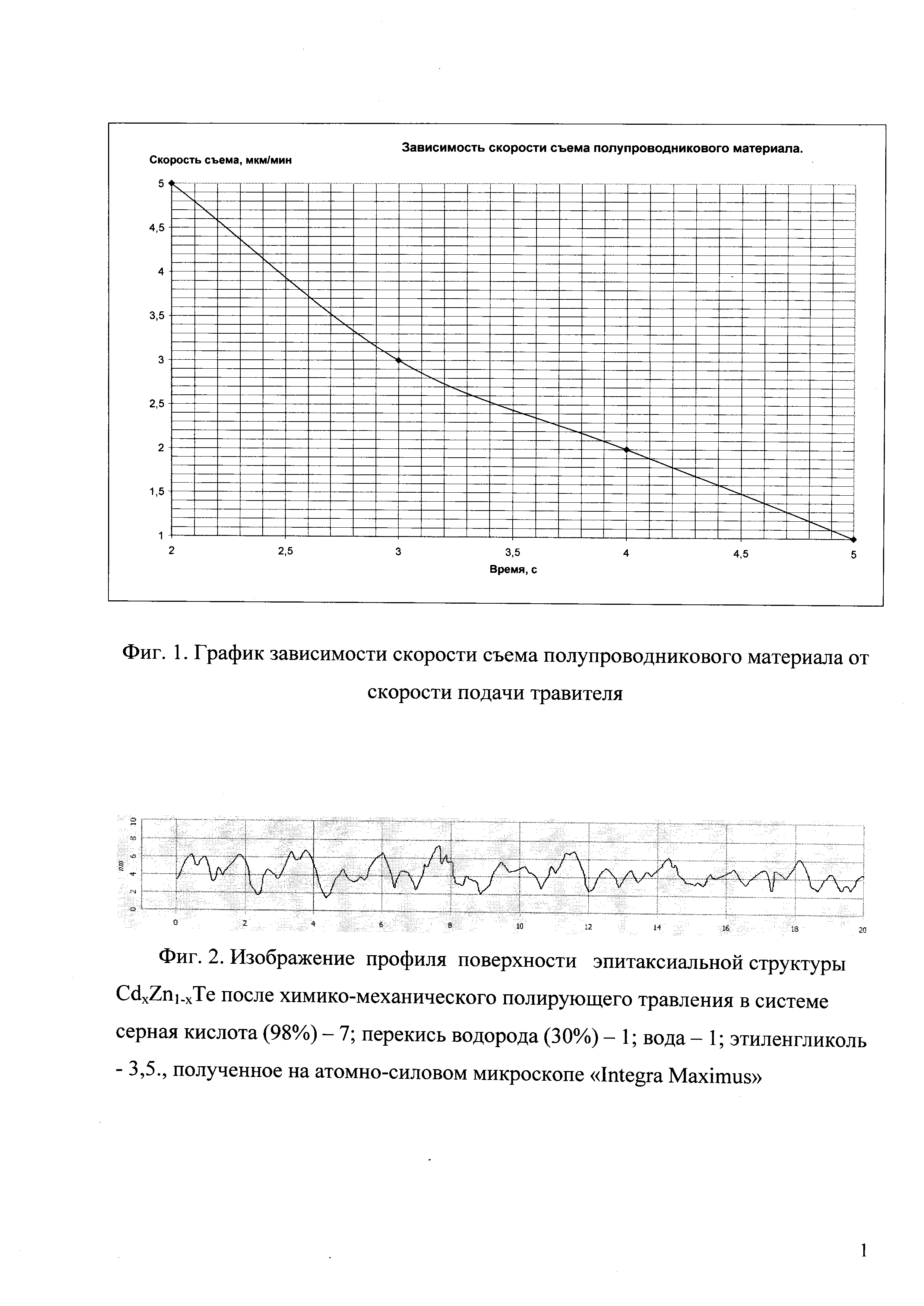 Изобретение относится к материаловедению, в частности к области обработки поверхности теллурида кадмия-цинка (КЦТ) ориентации (111) химико-механическим полирующим травлением. От состояния поверхности полупроводникового материала, ее дефектности зависит качество нанесения антиотражающего покрытия (АОП) при изготовлении полупроводниковых приборов. Для улучшения адгезии на границе раздела КЦТ-АОП необходимо, чтобы перед проведением нанесения АОП шероховатости поверхности были минимальны. Лучшим способом подготовки поверхности является полирующее химико-механическое травление. Целью данного изобретения является разработка состава травителя, который позволяет вести процесс полирующего химико-механического травления теллурида кадмия-цинка. Процесс полирующего травления может иметь место только в случае гомогенности физико-химических свойств обрабатываемой поверхности. Для гомогенизации поверхности необходимо обеспечить условия, при которых скорость электронного обмена между гетерогенными в физико-химическом отношении точками поверхности будет больше или равна скорости электронного обмена между этими точками и реагентами (травителем) в растворе. Согласно известным теориям эффект химического полирующего травления может быть достигнут при условии, что в процессе травления вблизи поверхности образуется вязкая пленка из продуктов растворения полупроводников. Этот тип пленки является гомогенной. Поэтому на практике для достижения эффекта полирующего травления обычно используют концентрированные вязкие растворы, часто с добавками ингибиторов (вода). Процесс полирующего травления осуществляется за счет относительно малого содержания растворителя по сравнению с окислителем, то есть процесс растворения полупроводникового материала протекает в диффузионном режиме, при этом вблизи поверхности образуется вязкая пленка из продуктов растворения полупроводникового материала. Растворение полупроводникового материала в системе кислот зависит от стадии окисления поверхности и последующего растворения окисла (в заявляемом изобретении растворение теллурида кадмия-цинка) происходит за счет появления активного атомарного кислорода в процессе реакций взаимодействия: (H2SO4+H2O2=H2SO5+H2O; H2SO5=H2SO4+2O*). Для растворения образующихся на поверхности оксидов целесообразно добавлять в травитель комплексообразователь (в заявляемом изобретении функцию комплексообразователя выполняет этиленгликоль). Различные многоосновные спирты (например, этиленгликоль, глицерин) благодаря высокой вязкости и малой константе ионизации уменьшают скорость растворения, что очень важно при полирующем травлении. Таким образом, процессы растворения полупроводниковых материалов в области полирующих составов протекают по окислительно-гидротационному механизму. В кислых растворах подавляется диссоциация органических веществ, которые являются комплексообразователями. Поэтому на практике для достижения эффекта полирующего травления подбирается пара: неорганическая кислота - комплексообразователь. Для теллурида кадмия-цинка наиболее распространены травители на основе брома в метаноле или бромистоводородной кислоты с добавлением этиленгликоля, глицерина. Известны составы для травления теллурида кадмия-цинка, содержащие метанол, мо