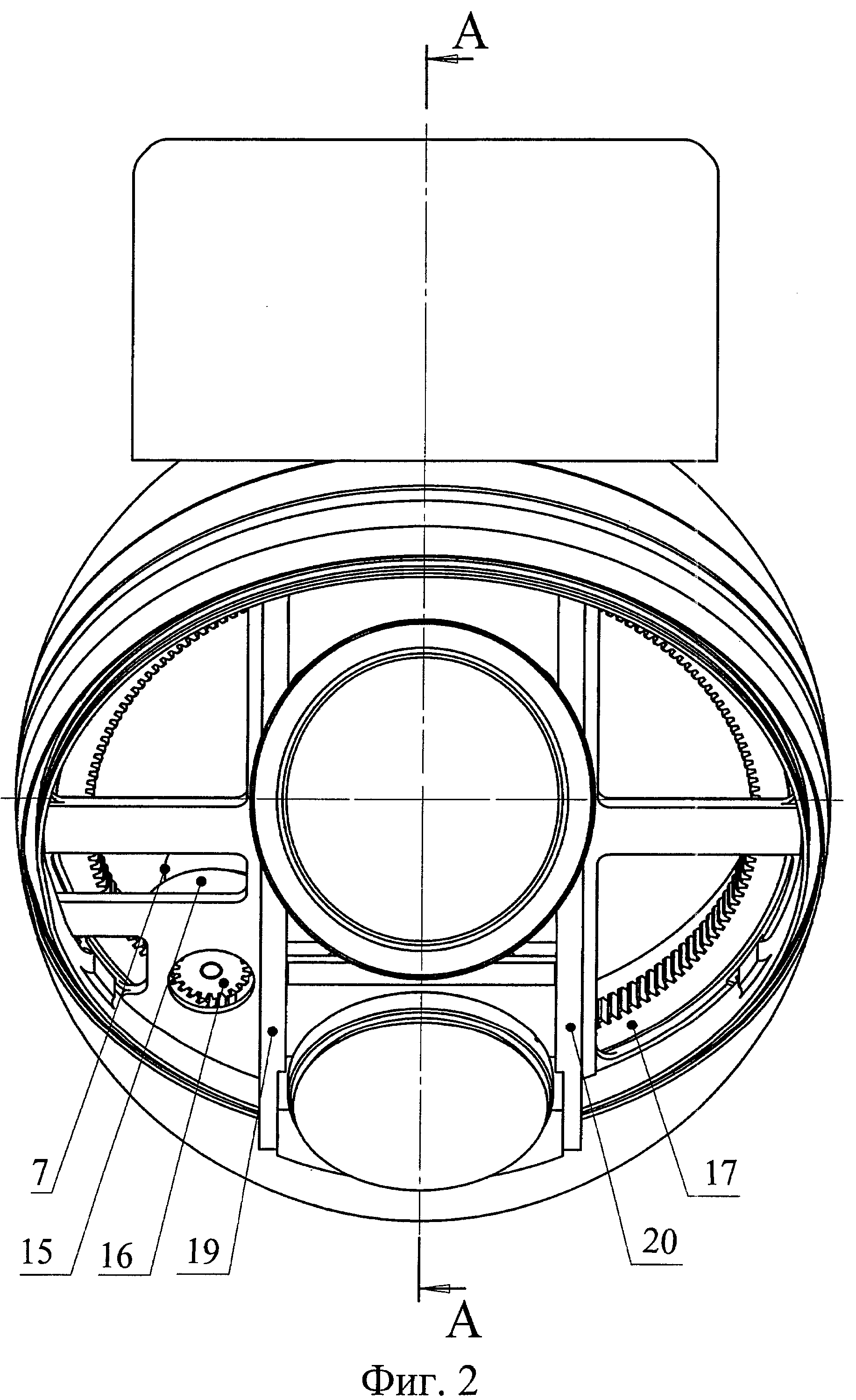 Изобретение относится к области светотехники и может быть использовано при установке на транспортные средства, преимущественно вертолеты, в качестве бортового управляемого источника света. Прожекторы, предназначенные для проведения авиационных работ, должны обеспечивать формирование высокоинтенсивного светового излучения с дистанционным изменением его телесного угла и разворотом светового луча по азимуту (влево/вправо) и по углу места (вверх/вниз). Известен поисковый прожектор с креплением на поисково-спасательном гидросамолете, содержащий карданную вилку с двумя электроприводами (SU 1762510 А1, МКИ 7 B64D 47/04, опубл. 10.11.2004). Недостатком данного устройства является недостаточная надежность тросовых связей привода с корпусом прожектора. Известна прожекторная система SX-16 Nightsun фирмы Spectrolab (Руководство по эксплуатации и техническому обслуживанию. http//www.spectrolab.com). Данный прожекторная система включает прожектор и устройство поворотное. Корпус прожектора выполнен в виде цилиндра, внутри которого размещены составные части прожектора, в том числе механизм изменения фокуса (телесного угла луча). Устройство поворотное (кардан) выполнено в виде U-образной вилки с двумя электроприводами (азимут и угол места). Электропривод азимутального направления установлен в верхней части кардана и обеспечивает подвижность влево/вправо. Электропривод угломестный установлен с одной из сторон вилки и обеспечивает движение прожектора вверх/вниз. Однако конструкторское решение данной прожекторной системы не в полной мере обеспечивает защиту электроприводов от климатических и ветровых воздействий. Наиболее близкой к настоящему изобретению по технической сущности и достигаемому результату является прожекторная поисково-осветительная система по патенту РФ на полезную модель №62895 (МПК B6D 47/04, опубл. 15.05.2007), в которой реализована повышенная защищенность электроприводов от внешних воздействий и улучшение аэродинамических свойств устройства поворотного с прожектором за счет размещения электроприводов внутри устройства поворотного и придания ему обтекаемой формы. Недостаток указанной прожекторной системы заключается в том, что прожектор выступает за габариты устройства поворотного, то есть прожекторная система имеет асимметричную форму, что снижает ее аэродинамические свойства и затрудняет управление вращением прожектора в полете. Задачей данного изобретения является создание прожекторной поисково-осветительной системы, устойчивой к внешним воздействиям. Технический результат, достигаемый при использовании настоящего изобретения, заключается в упрощении конструкции и улучшении аэродинамических свойств прожекторной поисково-осветительной системы. Поставленная задача с достижением упомянутого выше технического результата решается тем, что в прожекторной поисково-осветительной системе, содержащей корпус верхний, азимутальную поворотную часть устройства поворотного, снабженную азимутальным электроприводом, и прожектор, устройство поворотное содержит связанную с азимутальной поворотной частью наклонную поворотную часть, в которой установлен прожектор и электропривод наклонного вращения, при этом ось прожектора установлена с наклоном относительно плоскости вращения наклонной поворотной части, а перемещение луча прожек