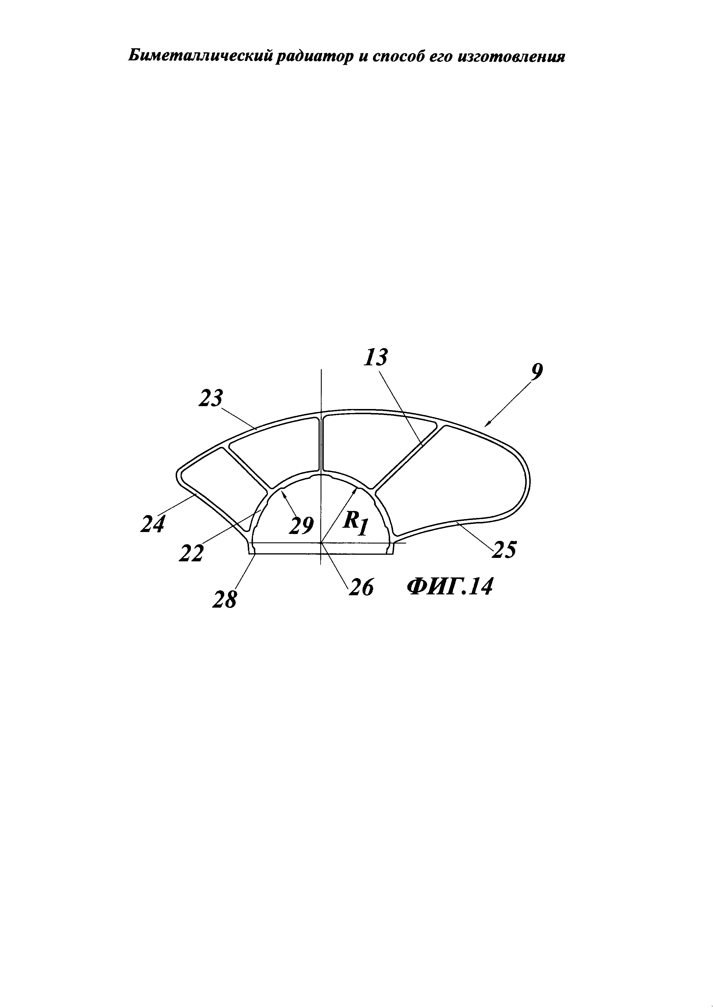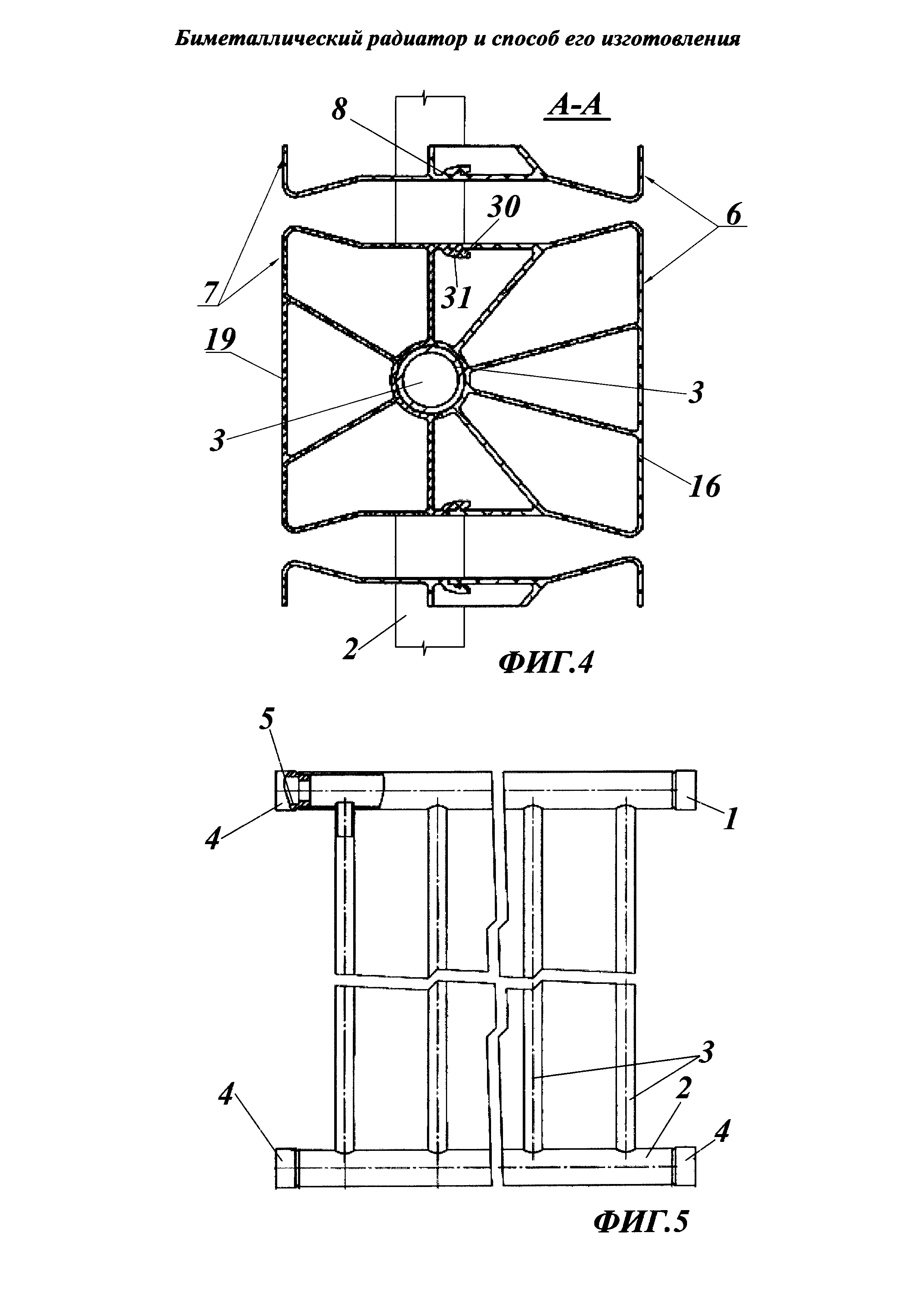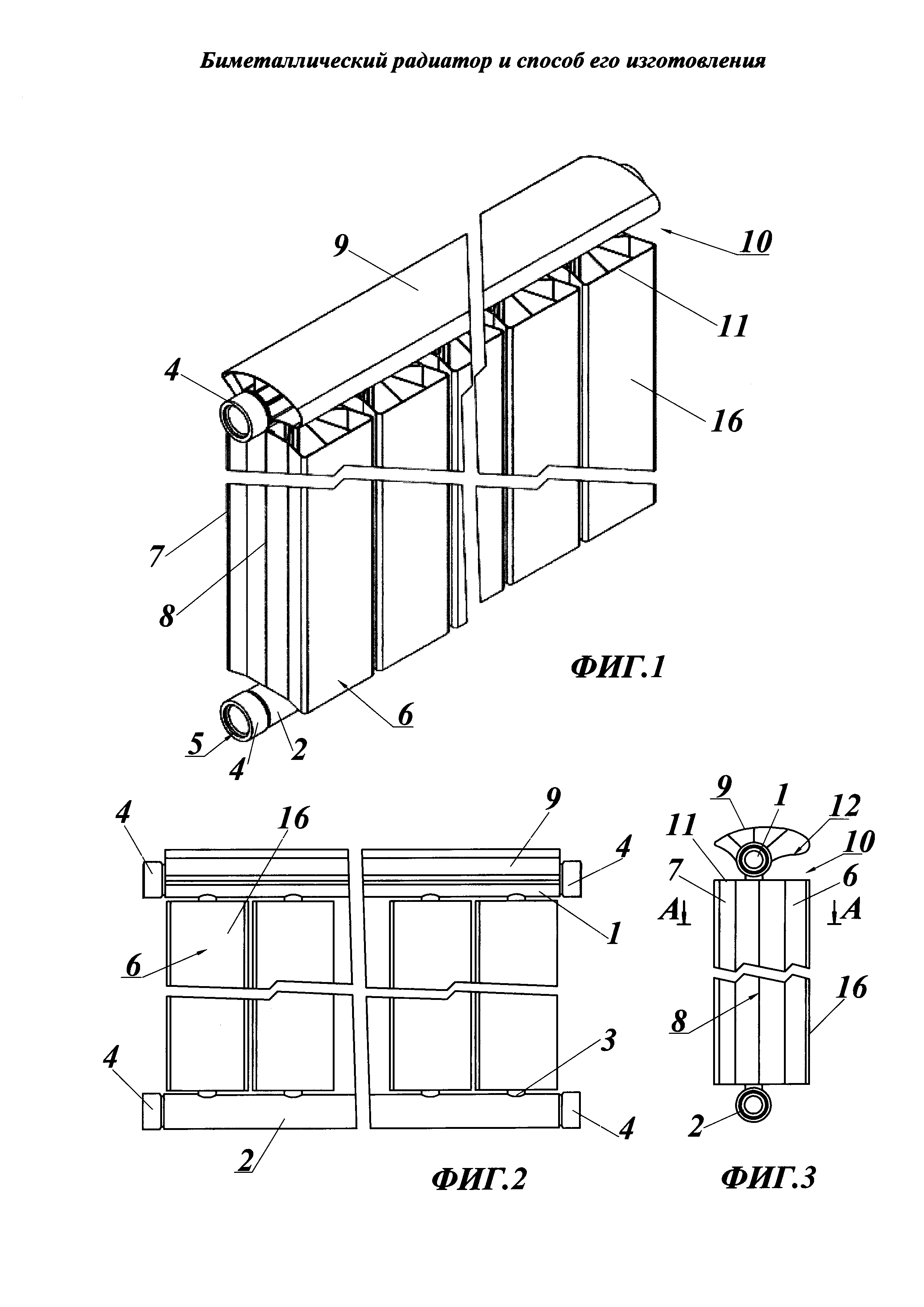 Изобретение относится к области машиностроения, в частности к конструкциям биметаллических радиаторов и способам их изготовления, и предназначено для использования в области машиностроения при производстве радиаторов отопления. Из патентной документации известен биметаллический радиатор для системы отопления, который содержит находящиеся в тепловом контакте друг с другом теплоприемную и теплоотдающую панели, при этом теплоприемная панель выполнена в виде алюминиевого листа с горизонтально расположенными на одной стороне листа полыми алюминиевыми цилиндрами, выполненными с прерывистыми направляющими их цилиндрических поверхностей, и содержит установленные в этих цилиндрах стальные трубы, предназначенные для движения по ним нагревательной среды, а теплоотдающая панель выполнена в виде алюминиевого листа с вертикальными ребрами, расположенными на одной стороне этого листа, другая сторона которого находится в непосредственном тепловом контакте с другой стороной алюминиевого листа теплоприемной панели (RU 2273803 C2, 10.04.2006). Известен отопительный радиатор-конвектор, содержащий верхний и нижний трубчатые коллекторы, выполненные из алюминиевого профиля, связанные с рядом вертикальных оребренных алюминиевых труб регистра при помощи коротких трубчатых элементов, герметично закрепленных с одной стороны посредством прессовой посадки в трубах регистра, а с другой - в отверстиях коллектора посредством уплотняющего элемента, расположенного между выступающим в полость коллектора концом трубчатого элемента и входом его в отверстие коллектора, причем каждый трубчатый элемент выполнен в виде штуцера, имеющего коническую и цилиндрическую части, на наружных поверхностях которых имеется, по меньшей мере, по одной кольцевой проточке, в месте перехода цилиндрической части в коническую выполнен бурт, расположенный между торцом трубы регистра и коллектором, а уплотняющий элемент выполнен в виде вдавленного в кромку входного отверстия коллектора переходного конуса, сопряженного с плоской кольцевой поверхностью бурта и цилиндрической поверхностью штуцера, выступающий конец которого выполнен развальцованным посредством доступа со стороны конической части штуцера (RU 2385442 С2, 27.03.2010). Известен секционный радиатор бытовой системы отопления из алюминиевых прессованных профилей, содержащий подводящий и отводящий коллекторы, выполненные в форме асимметричной профильной трубы со смещенным каналом и фиксирующими посредством винтов парными ушками со стороны опорной поверхности, соединенные с ними вертикальные трубчатые осесимметричные секции с осевыми радиальными ребрами, задней и передней наружными панелями, причем каждый коллектор выполнен со смещенным каналом «клювообразной» конфигурации в поперечном сечении и снабжен утолщенной опорой трапециевидной формы, осесимметрично расположенный трубчатый канал секции представляет собой трубу с вертикальными теплоотдающими ребрами, выполненными радиальными осевыми, и промежуточные симметрично-изогнутые ребра, с обеих сторон секции по осевому ребру на длине, равной толщине поперечной стороны профиля коллектора, запрессована в установочные отверстия коллекторов гладкая труба с двумя кольцевыми канавками, в которых размещены уплотнительные кольца, осевое ребро с об