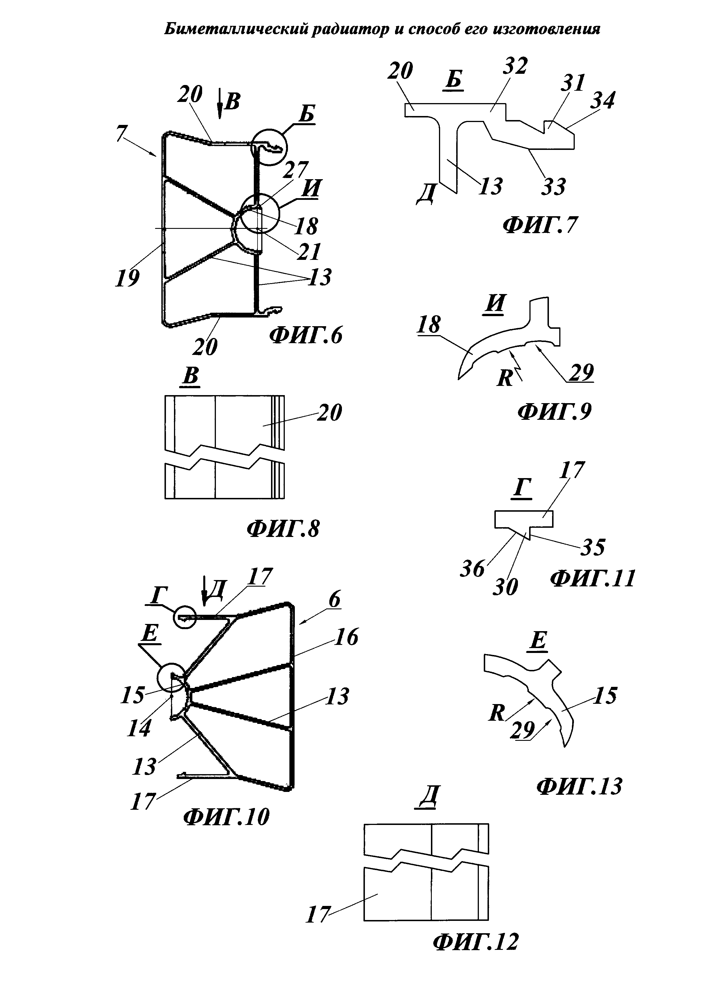 1. Биметаллический радиатор, содержащий трубчатый каркас, включающий верхний и нижний коллекторы, которые сообщены между собой трубчатыми колонками, при этом каждая колонка жестко соединена своими концами с коллекторами и на каждой колонке закреплены лицевой и тыльный профили, соединенные между собой и колонкой так, что они образуют собой коробчатую секцию радиатора, на верхнем коллекторе закреплен верхний профиль, все указанные профили выполнены с ребрами теплообмена и жесткости, расположенными внутри профилей, отличающийся тем, что каждый профиль выполнен с продольно ориентированным по отношению к продольной оси профиля ложементом, каждый профиль выполнен цельнотянутым и его ребра теплообмена и жесткости расположены параллельно продольной оси профиля, при этом на поверхности ложемента каждого профиля и поверхности ложемента верхнего профиля выполнены продольно расположенные канавки, а тыльный профиль и лицевой профиль соединены между собой зацепами, расположенными на концах этих профилей, при этом между смежными коробчатыми секциями радиатора образованы конвективные каналы. 2. Биметаллический радиатор по п. 1, отличающийся тем, что верхний и нижний коллекторы и каждая колонка выполнены из круглых труб, каждый ложемент выполнен по радиусу тела вращения, радиус ложемента каждого лицевого и тыльного профиля равен внешнему радиусу трубчатой колонки, а радиус ложемента верхнего профиля равен внешнему радиусу трубы верхнего коллектора. 3. Биметаллический радиатор по п. 1, отличающийся тем, что периметр ложемента верхнего профиля больше половины внешнего периметра поперечного сечения верхнего коллектора, периметр ложемента тыльного профиля больше половины периметра верхнего коллектора, при этом концы верхнего профиля выполнены упругими в пределах их прочности на изгиб при разведении кромок ложементов в стороны. 4. Биметаллический радиатор по п. 1, отличающийся тем, что на поверхности ложемента верхнего профиля выполнены продольные канавки, параллельные продольной оси верхнего профиля, между поверхностью ложемента верхнего профиля и поверхностью трубы верхнего коллектора в канавках верхнего профиля расположен слой отвержденного композитного материала. 5. Биметаллический радиатор по п. 1, отличающийся тем, что верхний профиль соединен с натягом с верхним коллектором, а лицевой и тыльный профили соединены с натягом друг с другом и колонкой, причем лицевой и тыльный профили соединены зацепами, входящими с натягом в зацепление друг с другом, а верхний профиль расположен с зазорами над торцами каждого лицевого и тыльного профилей и нижними поверхностями верхнего профиля. 6. Способ изготовления биметаллического радиатора, включающий изготовление трубчатого каркаса путем соединения нижнего и верхнего коллекторов с трубчатыми колонками, соединение с колонками лицевого и тыльного профилей, соединение с верхним коллектором верхнего профиля с верхним коллектором, отличающийся тем, что в процессе соединения с каждой колонкой лицевого и тыльного профилей колонку обжимают этими профилями с двух противоположных сторон одновременно до момента зацепления этих профилей между собой зацепами, а соединение с верхним коллектором верхнего профиля выполняют путем перемещения верхнего профиля в сторону верхнего кол
