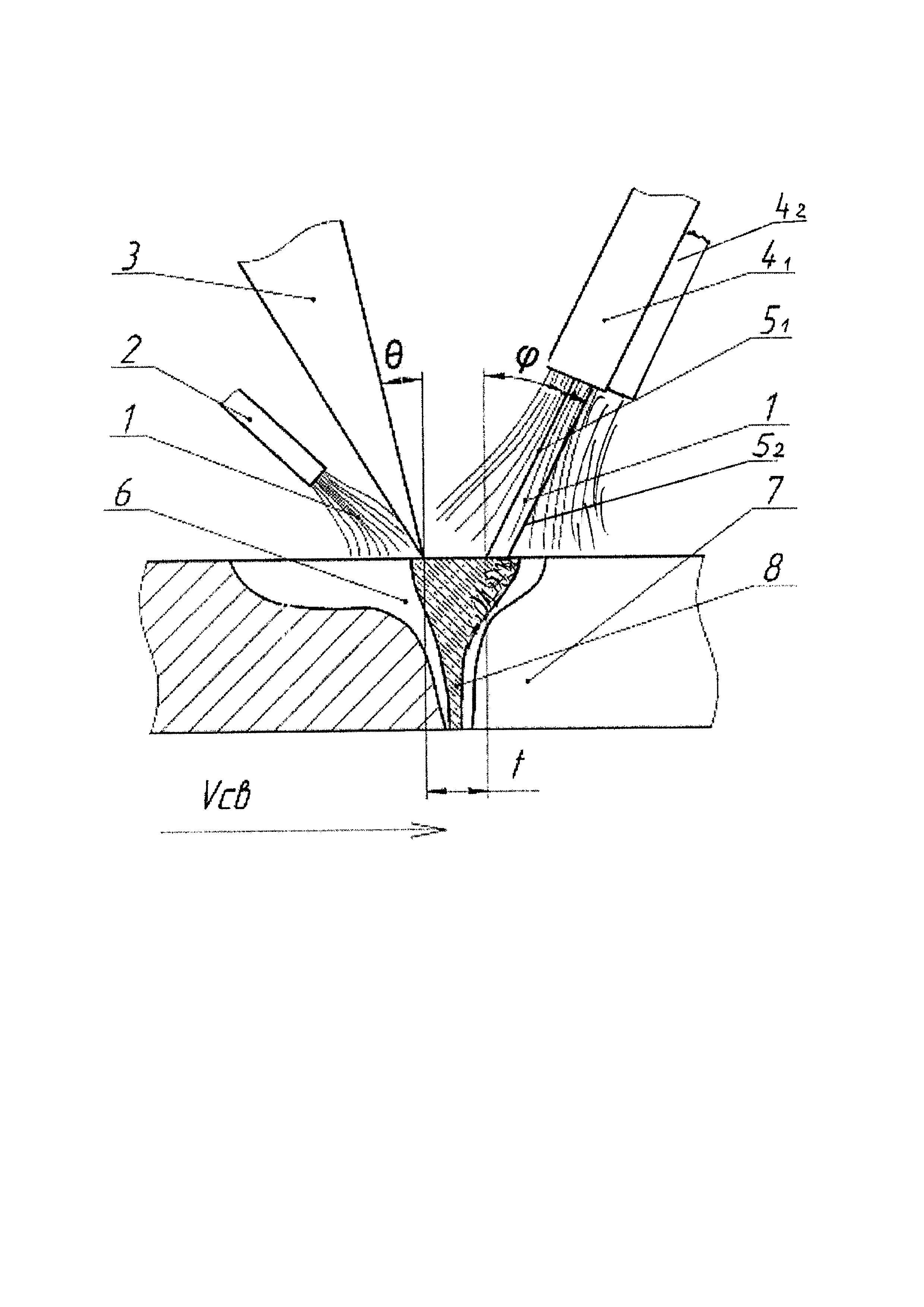 от 20 до 25°, включительно, относительно нормали к поверхности свариваемых кромок; Vсв - направление движения кромок свариваемой поверхности.