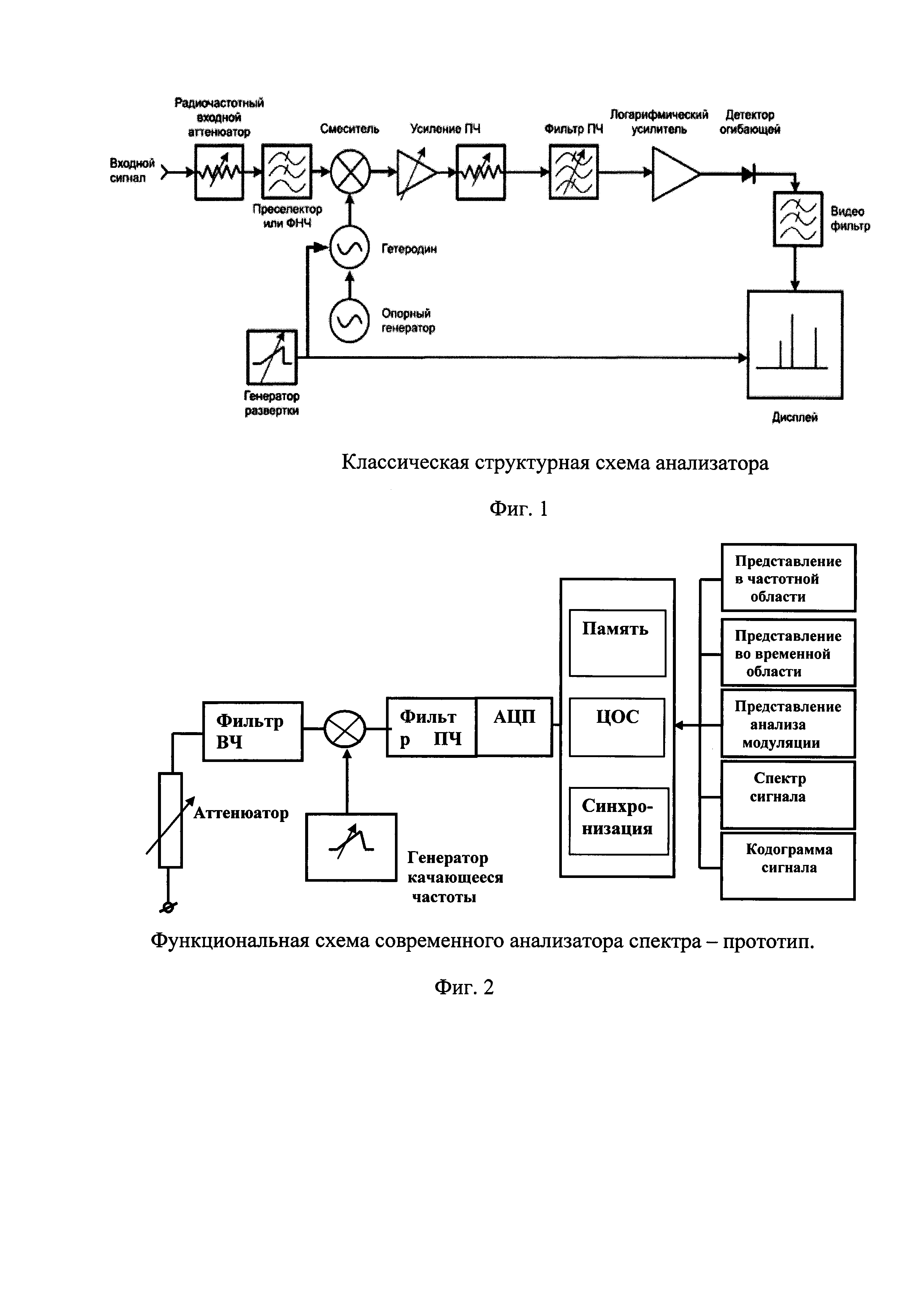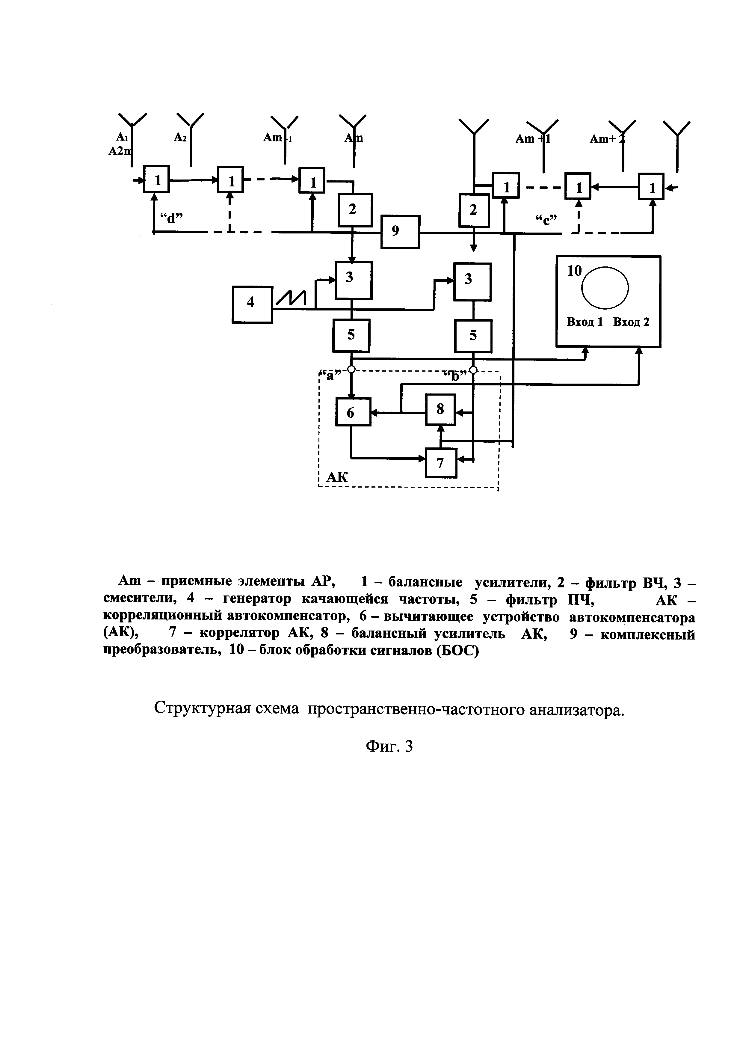 Область техники, к которой относится предлагаемое изобретение Изобретение относится к области радиотехники, класс устройств по МПК G01R 23/00, и может использоваться для радиотехнических измерениях и при поиске источников сигналов в системах радиоконтроля и радиоразведке (источник: A.M. Рембовский и др., Радиомониторинг, М., Горячая линия - Телеком, 2006, [1]). Уровень техники Известные схемы анализаторов спектра (Фиг. 1, источник) за счет изменения частоты гетеродина последовательно перемещает спектр исследуемого сигнала по оси частот относительно узкополосного фильтра ПЧ и отображает амплитудный спектр исследуемого сигнала на дисплее. Это позволяет измерить параметры сигнала и классифицировать его по типу излучения. Поэтому одной из области применения анализаторов являются станции радиотехнической разведки типа «Валерия» (источник: rusarmy.com>pvo/pvo_ws/rtr_valeria.html, [2]), «Вега» и других станциях пассивной разведки (источник: сайт «Российская военная техника», [3]). Структура современного анализатора, которая выбрана в качестве прототипа (источник: В. Дьяконов. Современные цифровые анализаторы спектра. Компоненты и технологии. №5, 2010), представлена на Фиг. 2. На фигуре приведены выполняемые им функции. Функция определения направления (пространственных координат) на анализируемые источники сигналов в прототипе отсутствует. Поэтому для решения задач идентификации источников радиоизлучений, кроме последовательного поиска источников по частоте, необходимо за счет перемещения диаграммы направленности антенны (ДНА) производить поиск в пространстве. Данное обстоятельство не отвечает требованию оперативности. Раскрытие изобретения Задачей, на решение которой направлено предлагаемое изобретение, является расширение функциональных возможностей анализаторов спектра за счет введения в анализ спектра принимаемого сигнала дополнительной функции - при перестройке частоты автоматически производится формирование ДНА на источник сигнала и определение таким образом его угловых координат. Техническим результатом (и тактическим) такого совмещения является: 1. Сокращение времени общего частотно-пространственного анализа сигналов. 2. Повышение энергетического потенциала анализатора. Этот результат реализуется за счет взаимной связи накопления энергии сигнала в частотном фильтре анализатора с формированием на источник ДНА диаграммы направленности антенны (ДНА). 3. Повышение точности измеряемых пространственных координат за счет использования в предлагаемом анализатора наиболее точного фазового метода пеленгации источника. Сущность изобретения поясняется чертежами На Фиг. 1 и Фиг. 2 сохранены наименования элементов (так в оригиналах). Фиг.3: Am - приемные элементы АР, 1 - балансные усилители квадратурных составляющих выходных сигналов антенных элементов, 4 - генератор качающейся частоты, 10 - спецвычислитель, 3 - смесители, 5 - частотные фильтры, АК - корреляционный автокомпенсатор, 6 - вычитающее устройство АК, 7 - коррелятор АК, 8 - балансный усилитель АК, 9 - комплексный преобразователь. Осуществление изобретения Предлагаемый пространственно-частотный анализатор содержит линейную антенную решетку с 2*m (A1, A2, … A2m) эквидистантно расположенными в ней элементарными антеннами, балансные усилители 1, генератор качающейся частоты 4, спецвычислитель с инд