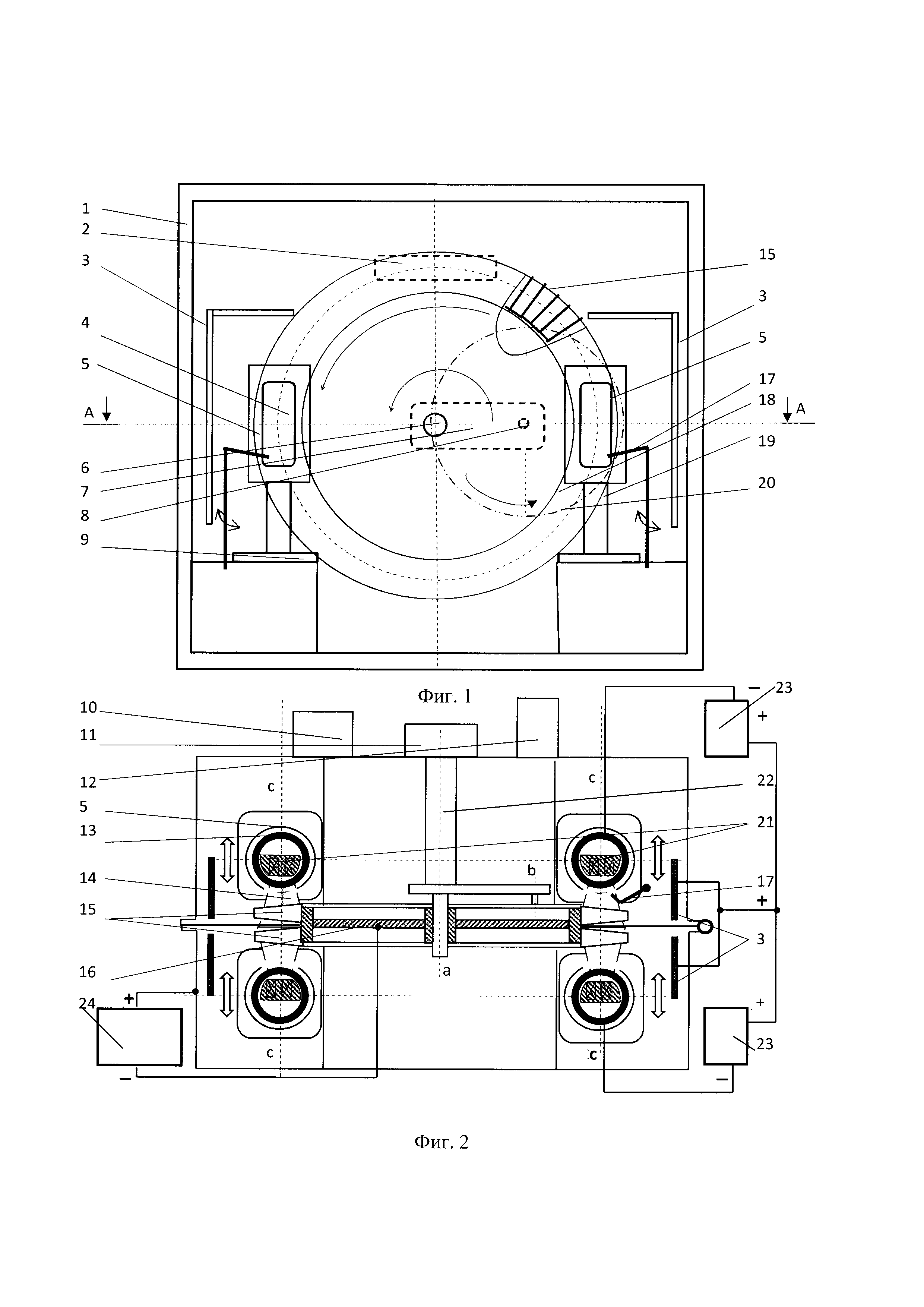 Изобретение относится к области нанесения ионно-плазменных покрытий и может найти применение для получения защитных покрытий из чистых металлов, многокомпонентных сплавов и соединений металлов (нитридов, карбидов и др.) на изделиях авиационной техники, преимущественно на лопатках турбины высокого давления, блинках, блисках и сопловых блоках газотурбинных двигателей. В промышленности широко известен способ нанесения защитных покрытий путем осаждения из вакуумно-дуговой плазмы материала покрытия и устройство для его осуществления. Устройство содержит анод, катод из испаряемого металла в виде кольца, размещенный на охлаждаемой подложке и имеющий поверхность испарения, направленную на анод, вакуумную камеру для поддержания вакуума между анодом и катодом, источник тока дуги, соединенный с катодом и анодом, возбудитель катодного пятна и средство гашения катодного пятна вне поверхности испарения (электромагнитный фиксатор катодного пятна) (GB 1322670 A, 11.07.1973). Способ предусматривает соединение электропроводящего изделия, служащего анодом или предварительно соединенного с анодом, которым может являться цилиндрическая или сферическая оболочка внутри вакуумной камеры, с положительным полюсом источника тока дуги с последующим нанесением на изделие испаряемого покрытия в вакууме (GB 1322670 A, 11.07.1973). Описанное устройство обычно используется для нанесения упрочняющих покрытий небольшой толщины (обычно не более 10 мкм) на режущие инструменты и детали машин из плазмы испаряемого материала. Небольшая площадь испарения катода в виде кольца и, как следствие, низкие токи вакуумной дуги не позволяют наносить защитные покрытия большой толщины (свыше 10-12 мкм) на детали машин за один цикл нанесения, что снижает производительность и ограничивает технологические возможности известного устройства. Наиболее близким аналогом предложенного устройства является установка МАП-2 для нанесения защитных покрытий, содержащая корпус вакуумной камеры с крышкой и расположенные в ней подвижный катод, выполненный в виде цилиндрической обечайки из испаряемого материала и снабженный подвижным цилиндрическим магнитным фиксатором катодного пятна, электроизолированный держатель с позициями вращения, снабженный системой защитных экранов и подключенный к отрицательному полюсу источника смещения потенциала, а также к приводу, обеспечивающему ему планетарное перемещение вокруг оси катода, охлаждаемый полый цилиндрический анод, снабженный магнитной катушкой и соосно охватывающий катод и держатель, защитный электроизолированный экран катода, кольцевые электроды, ограничивающие полость между анодом и катодом в осевом направлении, и возбудитель катодного пятна. Установка также содержит патрубок, размещенный на крышке вакуумной камеры в промежутке между катодом и держателем, газоразрядный источник ионов, размещенный в патрубке и снабженный со стороны вакуумной камеры заслонкой, закрывающей патрубок, и полым подвижным штоком, соединенным вне патрубка с механизмом, обеспечивающим перемещение газоразрядного источника ионов в зону обработки покрываемых изделий, источник питания, соединенный с анодом и охлаждаемым корпусом газоразрядного источника через полость подвижного штока, газовую систему, подающую рабочий газ в газоразрядный источник и