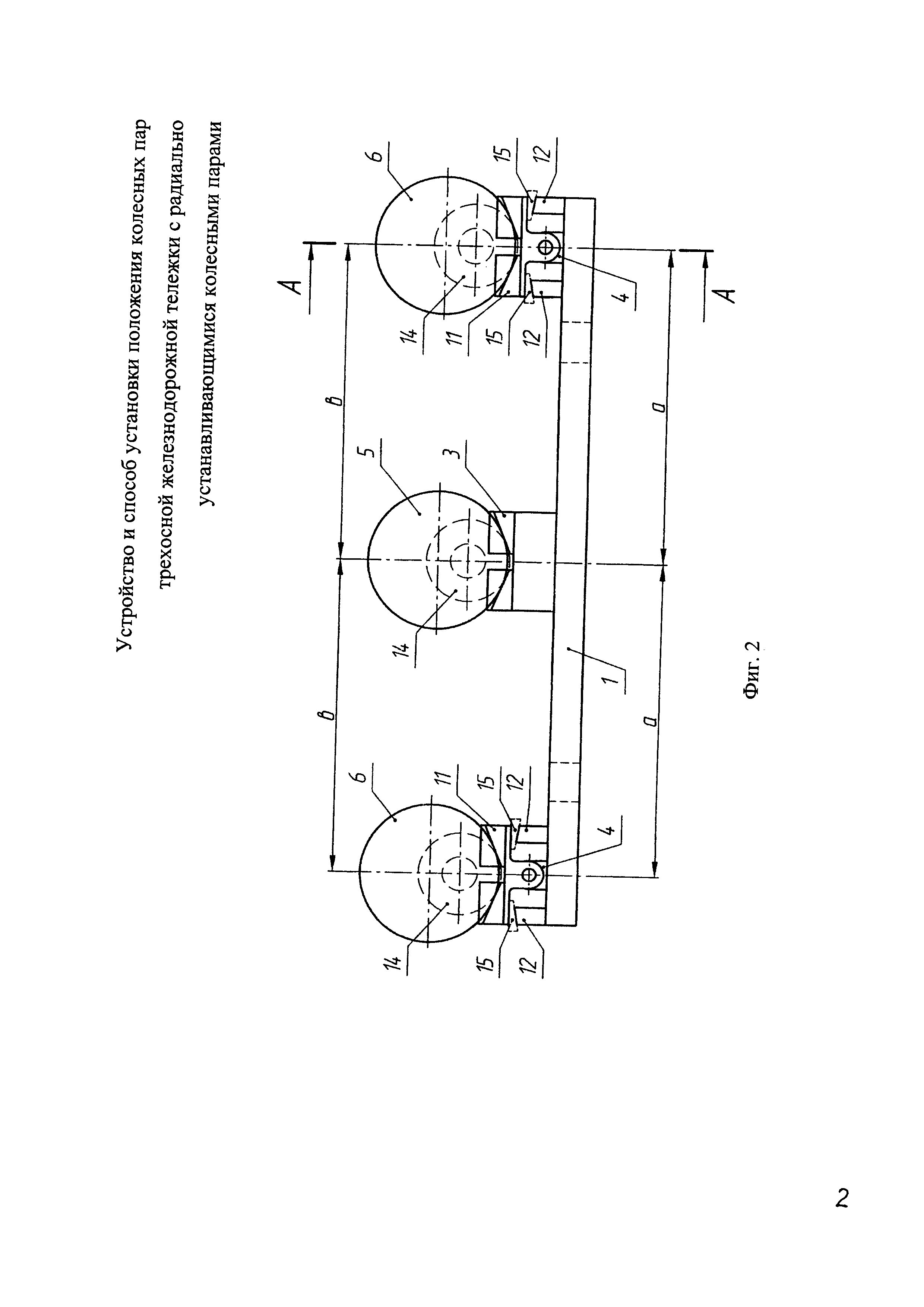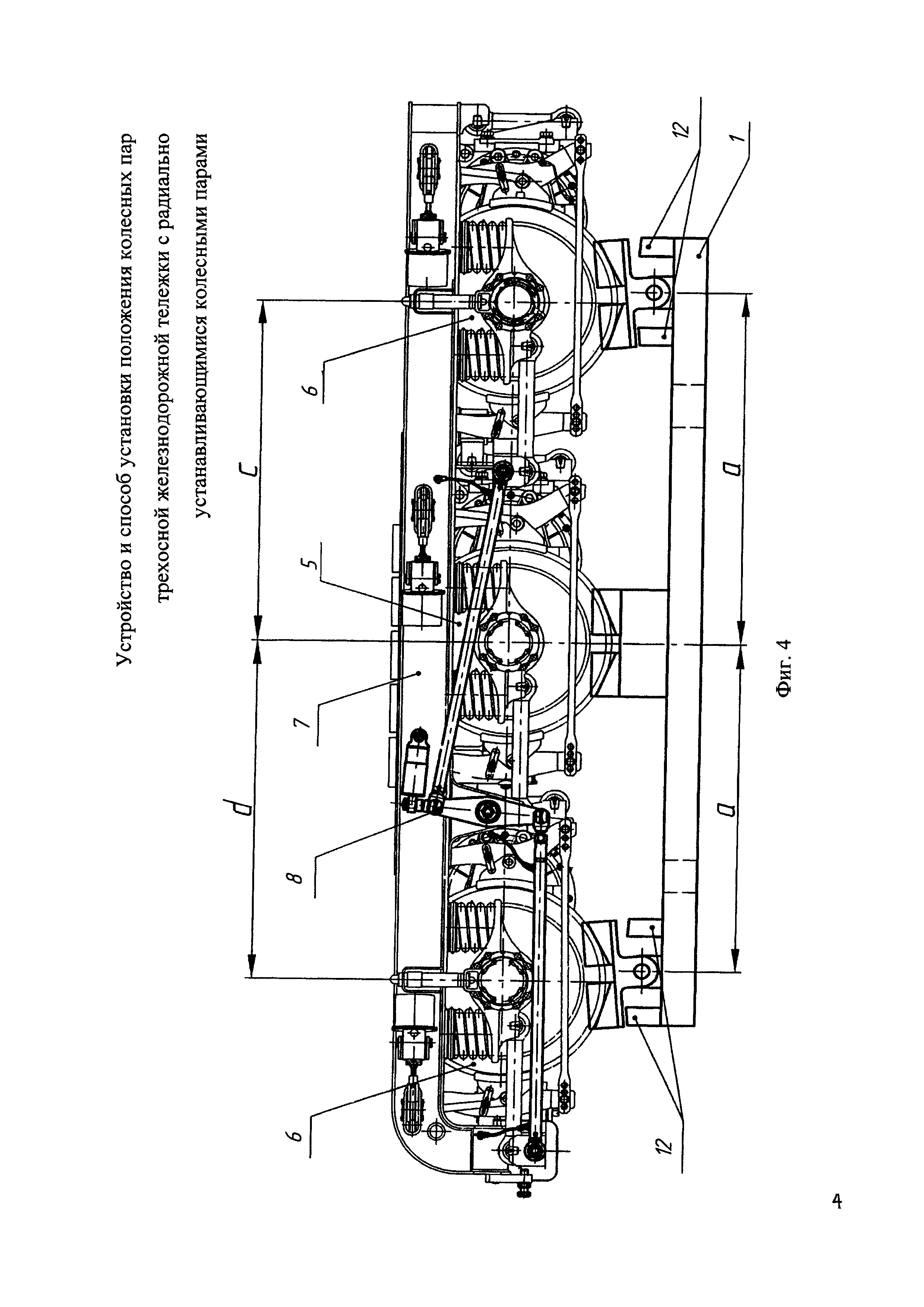 1. Устройство установки положения колесных пар трехосной железнодорожной тележки с радиально устанавливающимися колесными парами, содержащее раму, состоящую из боковин и поперечин, соединенных между собой, в центре боковин на одинаковом расстоянии от продольной оси симметрии рамы установлены неподвижные призмы, на концах боковин установлены опоры, причем расстояние 2. Устройство по п. 1, отличающееся тем, что для периодического контроля расстояния 3. Способ установки положения колесных пар трехосной железнодорожной тележки с радиально устанавливающимися колесными парами, заключающийся в том, что на устройство установки положения колесных пар трехосной железнодорожной тележки с радиально устанавливающимися колесными парами устанавливают трехосную железнодорожную тележку с частично разобранным механизмом радиальной установки колесных пар, причем среднюю колесную пару опирают на неподвижные призмы, при этом крайние колесные пары под действием массы трехосной железнодорожной тележки самоустанавливаются на подвижные призмы, закрепленные на штангах, которые поворачиваются в отверстиях опор до беззазорного контакта колес крайних колесных пар с подвижными призмами, поворот которых ограничивают в диапазоне допусков нормативного расстояния b от минимального расстояния с до максимального расстояния d упорами, установленными на боковинах устройства, перемещение колесных пар тележки в поперечном направлении ограничивают буртами, установленными на подвижных и неподвижных призмах, после установки крайних колесных пар производят сборку механизма радиальной установки колесных пар трехосной железнодорожной тележки.