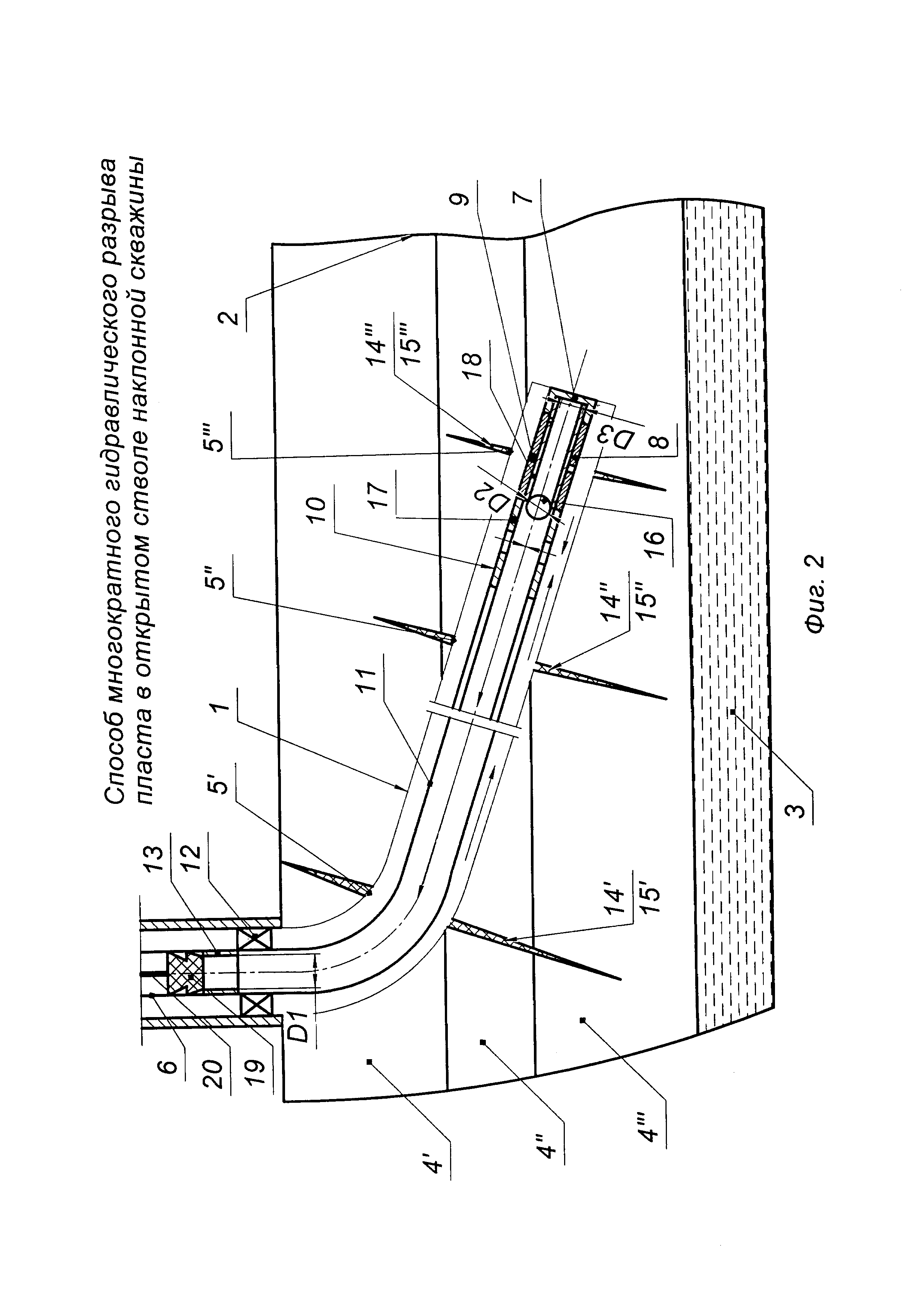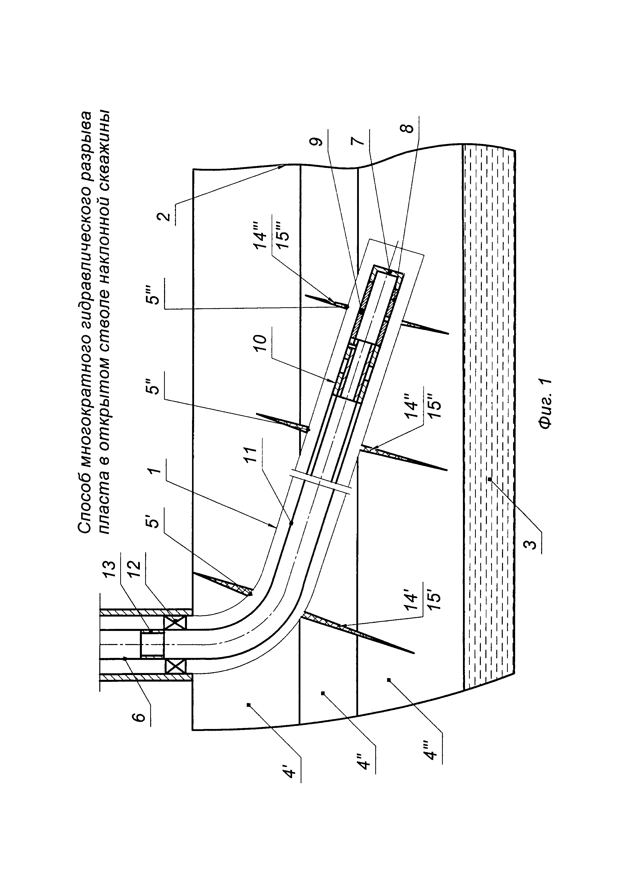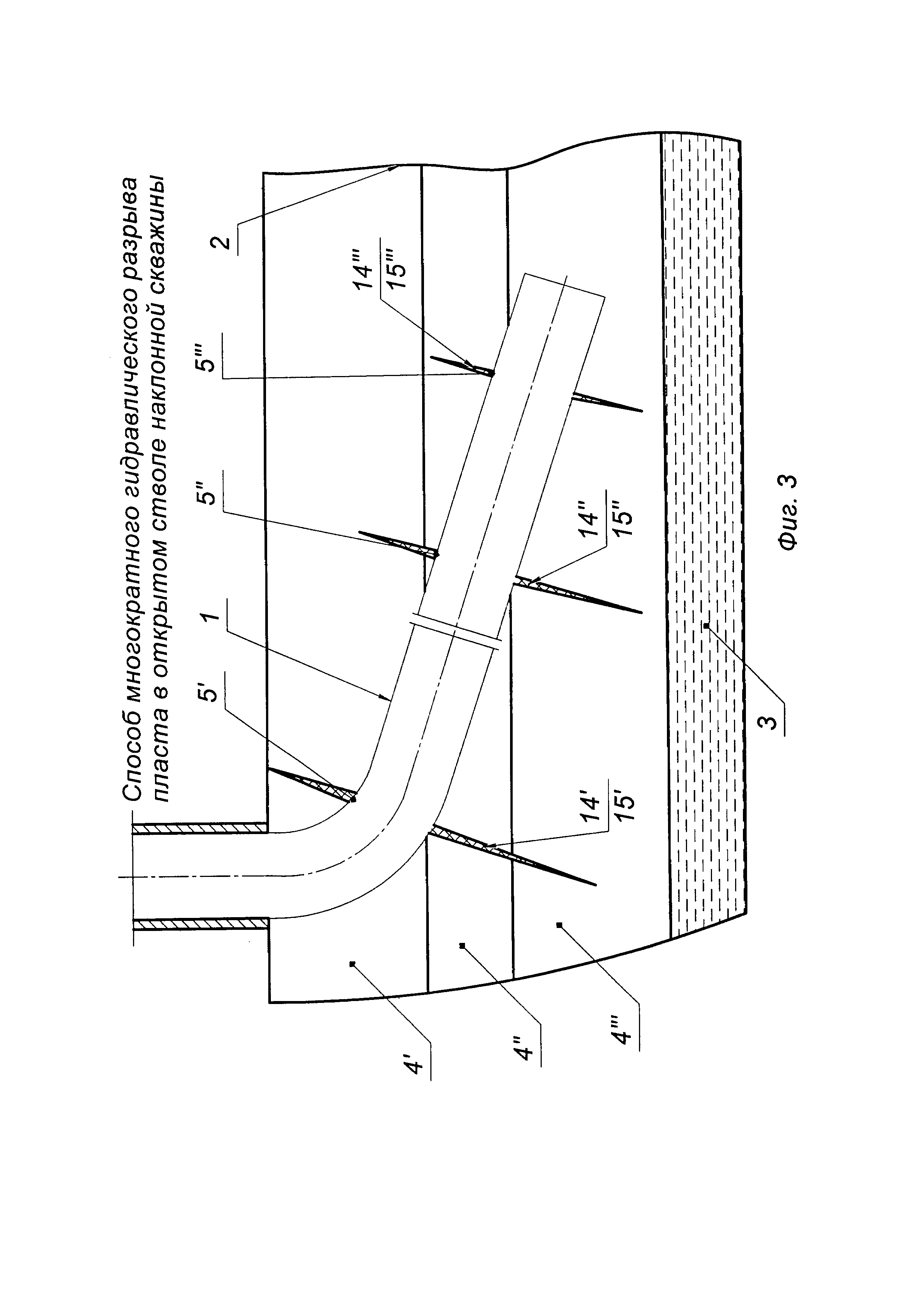 Способ многократного гидравлического разрыва пласта - ГРП в открытом стволе наклонной скважины, включающий бурение скважины в продуктивном пласте, определение фильтрационно-емкостных свойств пород и выявление интервалов продуктивного пласта с низкими фильтрационно-емкостными свойствами пород, спуск колонны труб в скважину, проведение поинтервального ГРП в открытом стволе скважины путем формирования перфорационных каналов и трещин закачкой гелированной жидкости разрыва, отличающийся тем, что производят бурение наклонного ствола в многопластовой продуктивной залежи нефти в карбонатных породах с подошвенной водой, по окончании бурения определяют фильтрационно-емкостные свойства пород и выявляют интервалы продуктивных пластов с низкими фильтрационно-емкостными свойствами пород, далее на устье скважины на нижний конец колонны труб снизу вверх устанавливают следующую компоновку: заглушку, гидромониторную насадку с соплами, перепускной клапан, хвостовик, технологический пакер, свабный ограничитель, спускают колонну труб с компоновкой в наклонный ствол скважины так, чтобы сопла гидромониторной насадки располагались напротив интервала с низкими фильтрационно-емкостными свойствами, соответствующего верхнему продуктивному пласту, производят в этом интервале ГРП с формированием трещины закачкой гелированной жидкости, в качестве которой используют гелированную кислоту, и креплением трещины проппантом, по окончании проведения ГРП перемещают колонну труб с компоновкой в следующий интервал с низкими фильтрационно-емкостными свойствами, соответствующий нижележащему продуктивному пласту, и производят ГРП с формированием трещины и креплением трещины проппантом, аналогичным образом перемещая колонну труб с компоновкой к забою скважины, выполняют ГРП в оставшихся интервалах с низкими фильтрационно-емкостными свойствами в соответствующих нижележащих продуктивных пластах, причем с каждым последующим выполнением поинтервального ГРП сокращают длину формируемой трещины путем снижения объемов закачиваемой гелированной кислоты и концентрации проппанта для крепления сформировавшейся трещины в каждом интервале проведения ГРП, причем используют проппант фракции 40/70 меш., по окончании выполнения ГРП в колонну труб сбрасывают шар, создают в колонне труб давление, достаточное для разрушения срезного винта перепускного клапана, при этом втулка перепускного клапана перемещается вниз и герметично изнутри перекрывает сопла гидромониторной насадки, сажают технологический пакер в обсаженной части скважины и осваивают скважину со снижением уровня жидкости до 1000 м, с откачкой жидкости из скважины в желобную емкость в объеме 25 м3, с отбором проб на рН фактор, если значение рН менее 4, продолжают откачку до рН более 4, с отбором проб через каждые 10 м3 откачанной жидкости, после чего прекращают освоение скважины, распакеровывают технологический пакер и извлекают колонну труб с компоновкой из скважины.