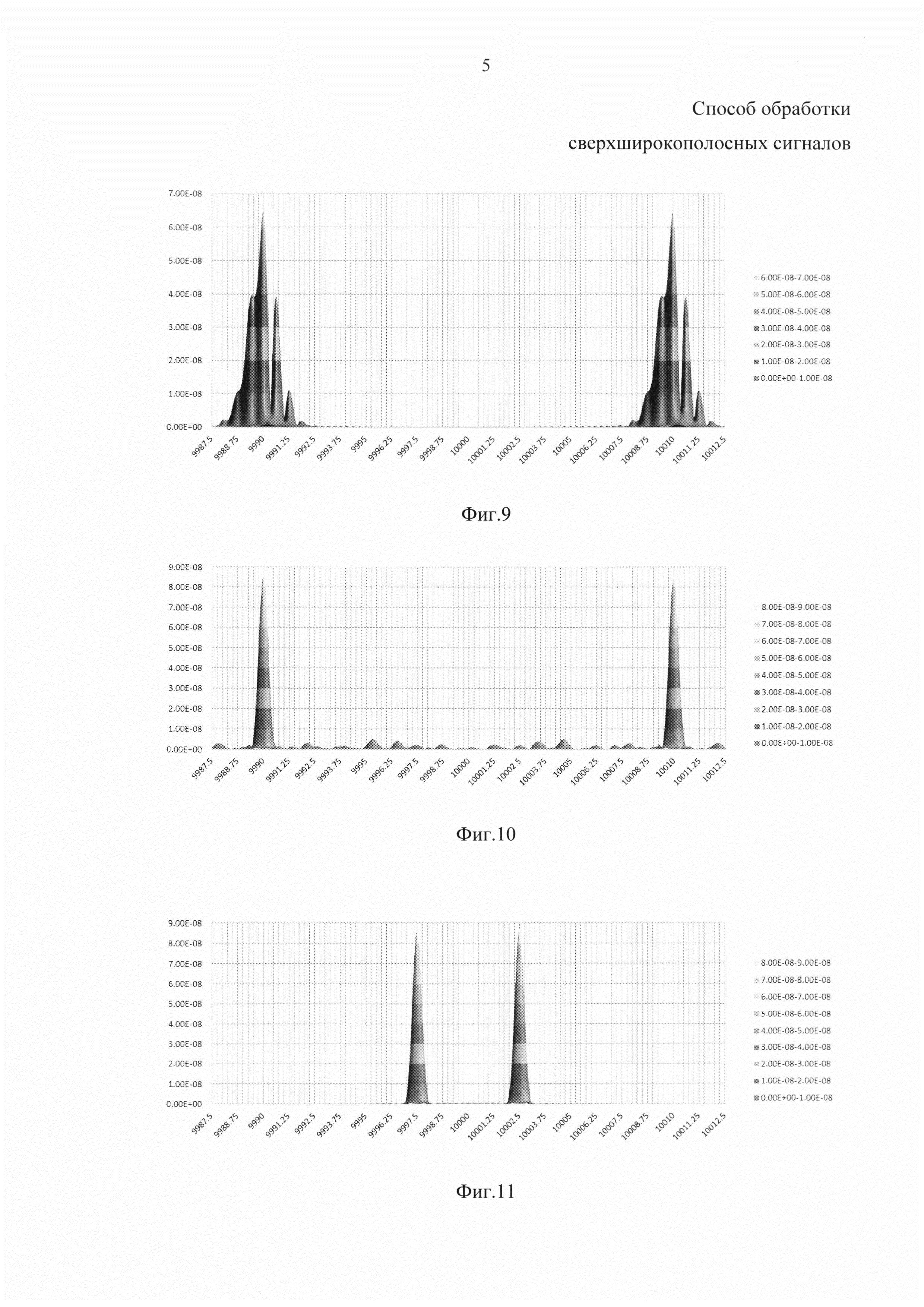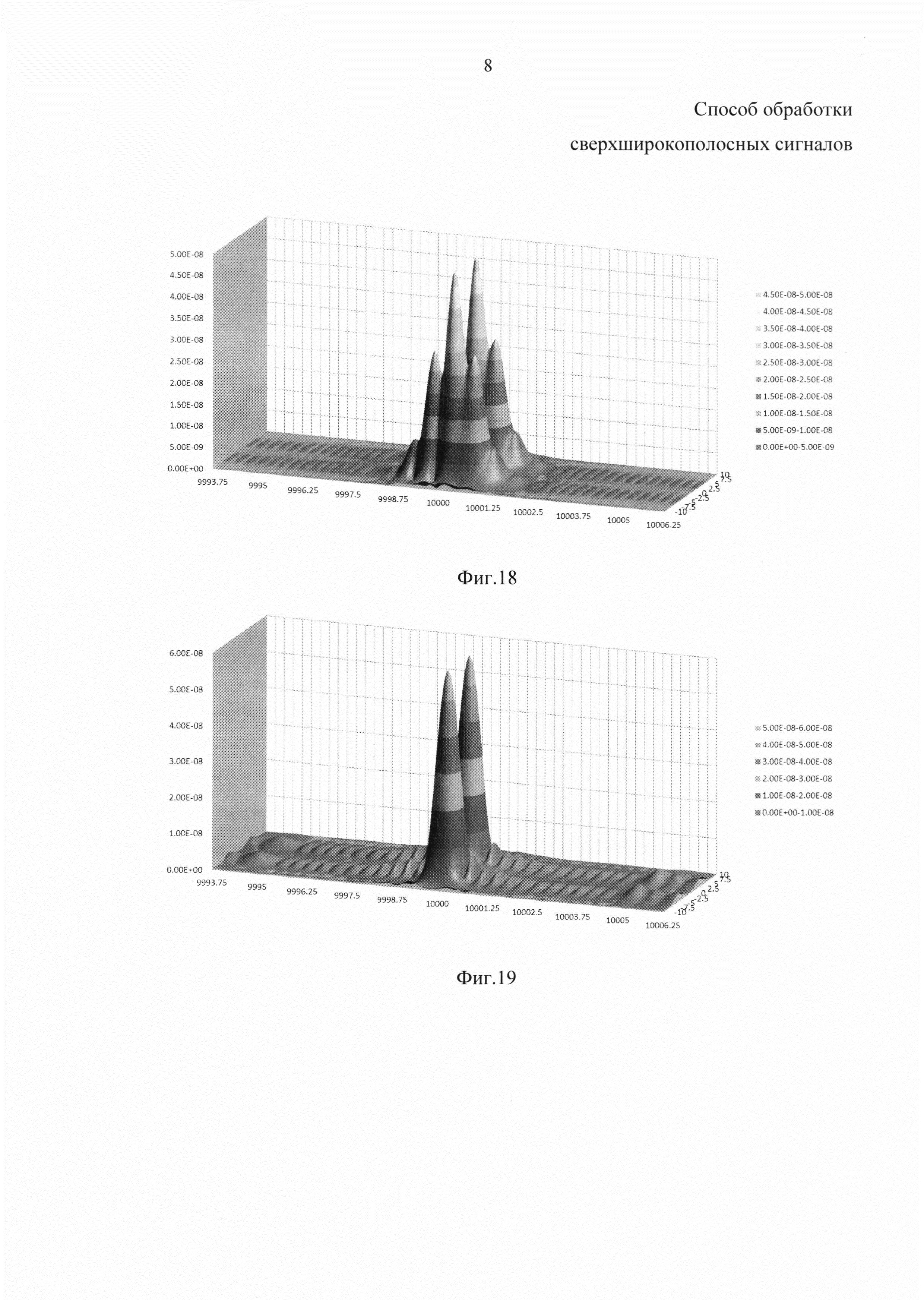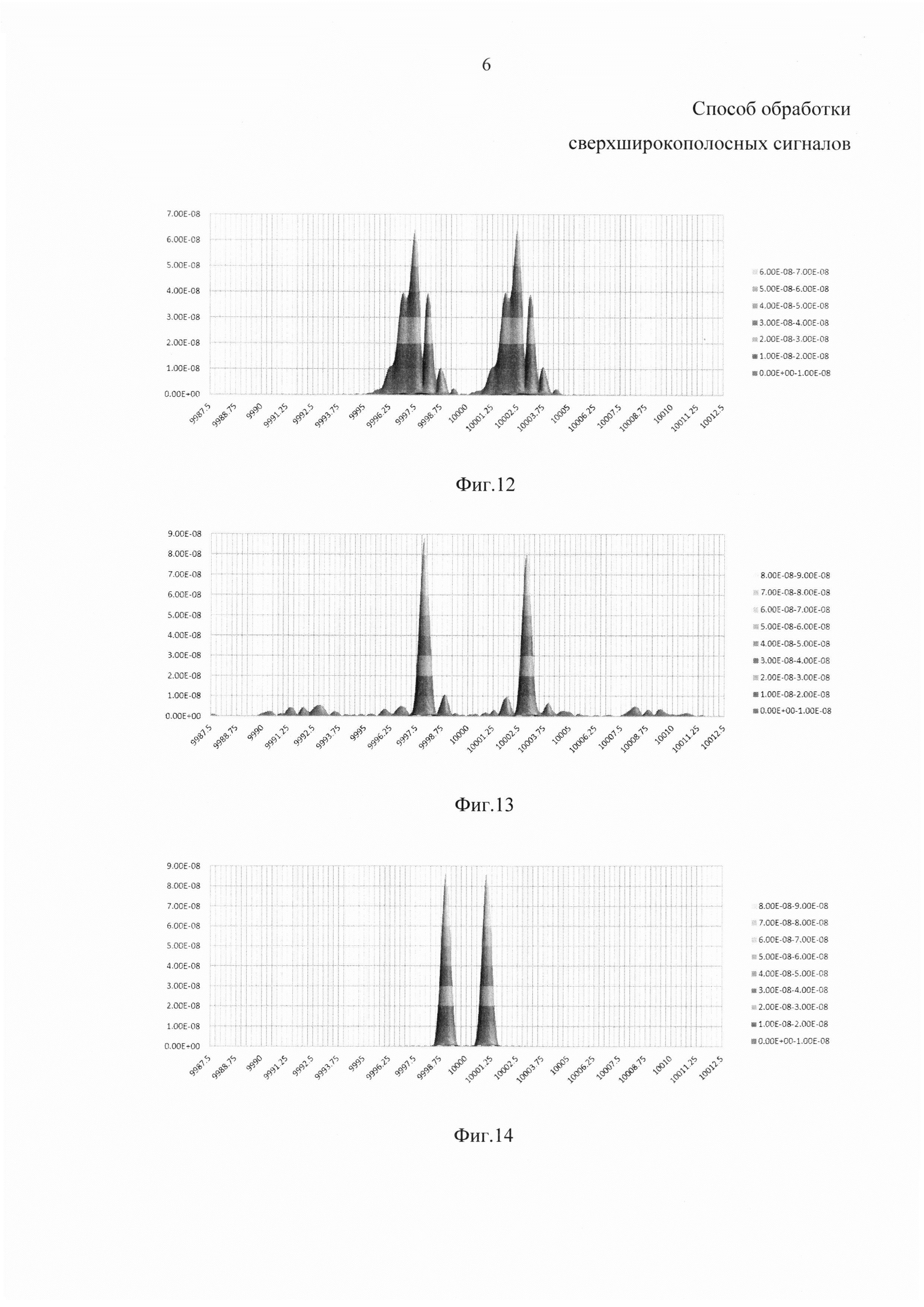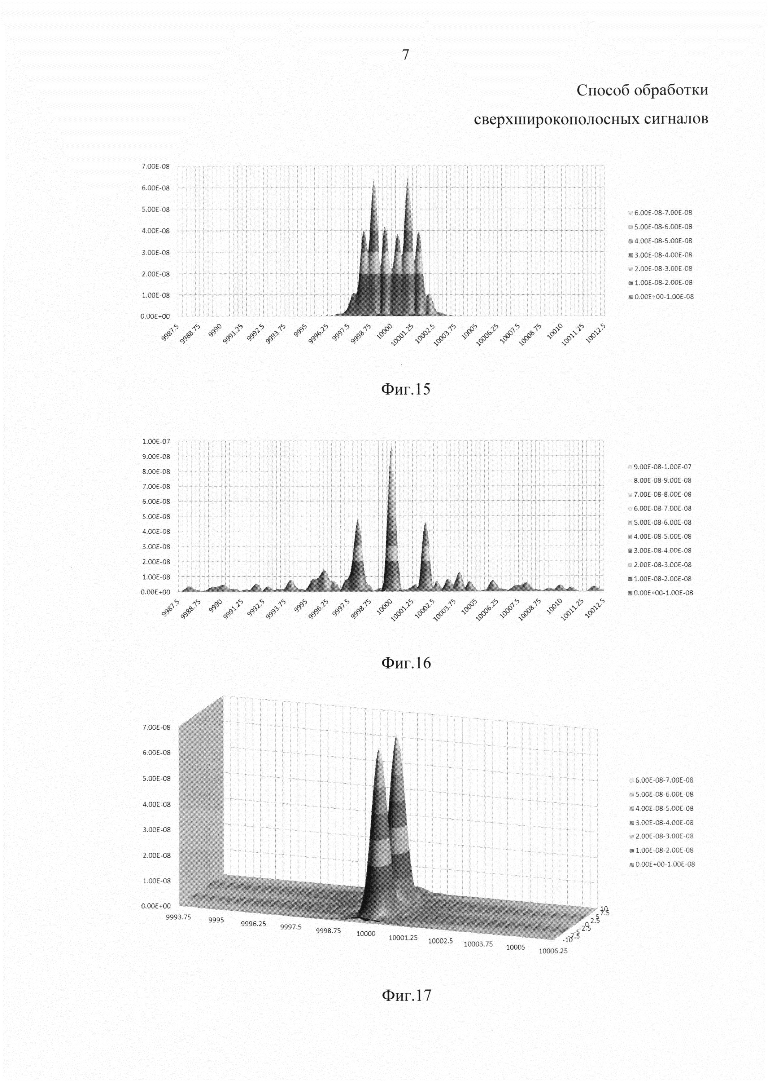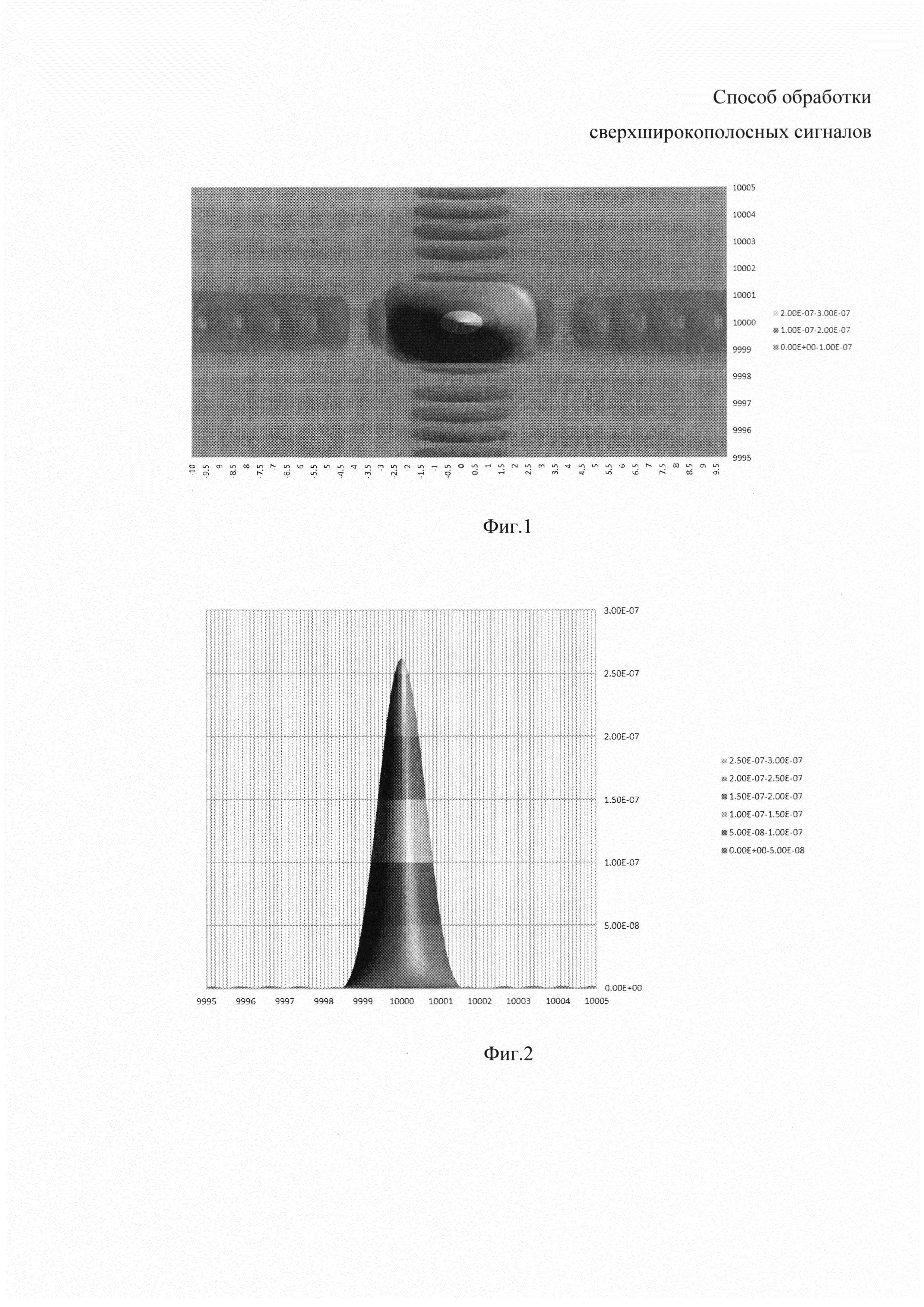 1. Способ обработки сверхширокополосных сигналов (СШС) в виде пачки из Nпач импульсов с линейной частотной модуляцией (ЛЧМ) при Nпач≥1, осуществляемый с использованием корреляционно-фильтрового способа, в соответствии с которым принятый входной сигнал сначала умножают на опорный сигнал, согласованный с сигналом, сформированным в передатчике, с образованием двух квадратурных каналов, в каждом из которых сигналы оцифровывают и затем обрабатывают в N дальностных каналах, формируя N пар квадратурных составляющих комплексного выходного сигнала обработки для задаваемых параметров, и далее находят амплитуды этих сигналов, которые определяют N выборок модуля выходного сигнала обработки, характеризующийся тем, что при обработке входного сигнала, искаженного вследствие нелинейности фазочастотных характеристик тракта, проходимого этими сигналами от формирования в передатчике до обработки в приемнике, с интервалом временной корреляции искажений τкор_иск, каждый импульс опорного сигнала разбивают на Кподымп узкополосных подымпульсов и в каждом квадратурном канале всех N дальностных каналов осуществляют обработку, согласованную с Кподымп пачками из Nпач подымпульсов каждая, формируя матрицу S комплексных сигналов Snkc, Snks, где k=1, …Кподымп - порядковый номер подымпульса, n=1, …N - номер дальностного канала, и далее, исходя из матрицы S, осуществляют оценку фазовых искажений Δψko в каждом подымпульсе и эти поправки вносят в соответствующие по номеру k сигналы подымпульсов 2. Способ по п. 1, характеризующийся тем, что длительность подымпульса τподымп выбирают такой, чтобы она была не менее чем в 5 раз меньше τкор_иск, но не менее чем в 5 раз больше интервала заданных значений задержек входных сигналов по времени, а отношение сигнал/шум при согласованной обработке пачки подымпульсов значительно превышало 1, а при оцифровывании сигнала такт временного квантования выбирают таким, чтобы число выборок сигнала на один подымпульс было не меньше 10. 3. Способ по п. 1, характеризующийся тем, что для оценки фазовых искажений Δψko сначала, исходя из матрицы S, формируют исходный выходной сигнал для всех N каналов и по исходному сигналу выбирают М-й дальностный канал, амплитуда выходного сигнала которого не менее чем в 5 раз превосходит амплитуды выходных сигналов других дальностных каналов, не совпадающих с М-м каналом по временной задержке или не разрешенных с ним ни по одному из параметров обработки, и далее по сигналам 4. Способ по п. 3, характеризующийся тем, что исходный выходной сигнал формируют за счет суммирования модулей сигналов 5. Способ по п. 3, характеризующийся тем, что исходный выходной сигнал в каждом n-ом дальностном канале формируют путем суммирования Кподымп сигналов 6. Способ по пп. 4 и 5, характеризующийся тем, что для оценки фазовых искажений Δψko в выбранном М-ом канале, исходя из сигналов и далее определяют поправки по фазе для корректировки искажений СШС в каждом k-м подымпульсе, исходя из выражения Δψko=ψMk-ψko. 7. Способ по п. 6, характеризующийся тем, что для упрощения обработки ψMk аппроксимируют прямой линией ψko=а+bk.