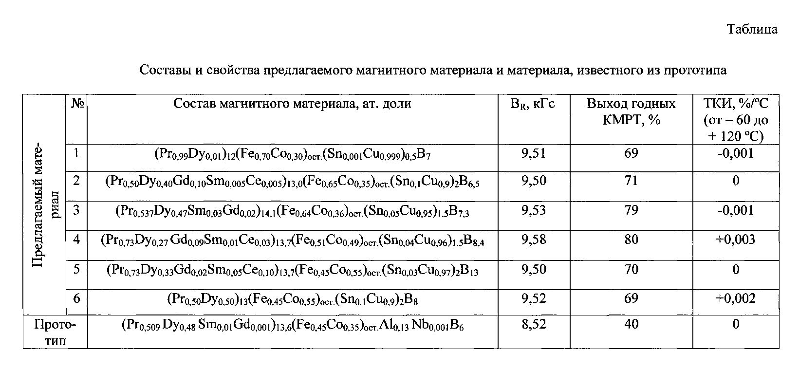 Группа изобретений относится к области порошковой металлургии, а именно к магнитным (магнитотвердым) материалам для постоянных магнитов на основе редкоземельных элементов и к изделиям, выполненным из таких материалов, и может быть использована в авиационной промышленности. Известен магнитный материал, содержащий железо, кобальт, бор, а также по меньшей мере один элемент, выбранный из группы тербий, диспрозий, гольмий, эрбий, тулий, который дополнительно содержит празеодим, а также по меньшей мере один элемент, выбранный из группы самарий, лантан, церий, неодим, иттрий, химический состав которого соответствует формуле, ат. %: Недостатками указанного магнитного материала являются недостаточно высокие магнитные свойства. Например, величина остаточной магнитной индукции (BR) не превышает 8,2 кГс при наилучшем значении температурного коэффициента индукции (ТКИ)=0 %/°С. Кроме того, кольцевые магниты с радиальной текстурой, выполненные из данного магнитного материала, имеют недостаточный выход годных при механической обработке. Известен магнитный материал, содержащий железо, кобальт, бор, а также по меньшей мере один элемент, выбранный из группы тербий, диспрозий, гольмий, эрбий, тулий, который дополнительно содержит церий, гадолиний и по меньшей мере один элемент, выбранный из группы самарий, лантан, неодим, иттрий, празеодим, химический состав которого соответствует формуле, ат. %: Недостатками указанного магнитного материала являются недостаточно высокие магнитные свойства. Например, величина модуля температурного коэффициента индукции (ТКИ) превышает 0,022. Кроме того, кольцевые магниты с радиальной текстурой, выполненные из этого материала, имеют недостаточный выход годных при механической обработке. Наиболее близким аналогом предлагаемой группы изобретений, принятым за прототип, является магнитный материал, содержащий железо, кобальт, бор, а также по меньшей мере один элемент, выбранный из группы тербий, диспрозий, который дополнительно содержит празеодим, гадолиний, а также по меньшей мере один элемент, выбранный из группы самарий, неодим, церий, при этом химический состав материала соответствует формуле, ат. %: Недостатками магнитного материала, известного из прототипа, являются недостаточно высокие магнитные свойства. Например, величина остаточной индукции (BR) не превышает 8,52 кГс. Кроме того, кольцевые магниты с радиальной текстурой, выполненные из данного материала, имеют недостаточный выход годных при механической обработке. Техническим результатом предлагаемой группы изобретений является разработка магнитного материала для постоянных магнитов и изделия, выполненного из него, обладающих повышенным значением остаточной магнитной индукции BR при величине ТКИ, близкой к нулю, и увеличение выхода годных изделий - кольцевых магнитов с радиальной текстурой (КМРТ), - выполненных из данного материала. Для достижения поставленного технического результата предложен магнитный материал, содержащий празеодим, железо, кобальт, бор, медь и по меньшей мере один элемент, выбранный из группы, включающей гадолиний, диспрозий, самарий, церий, отличающийся тем, что он дополнительно содержит олово, при этом химический состав магнитного материала соответствует формуле, ат. долей: где R - по меньшей мере один элемент, выбранный из груп