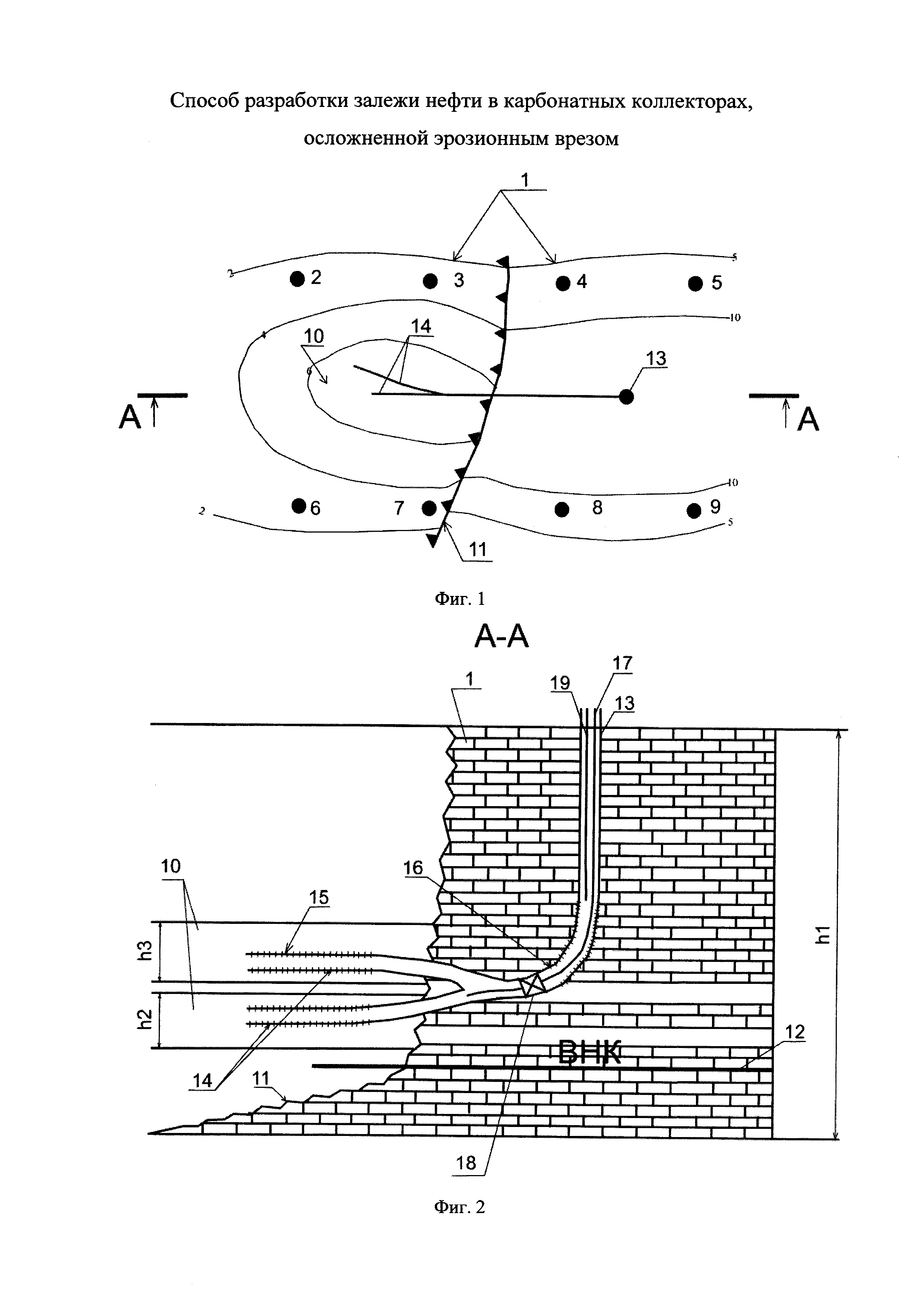 Способ разработки залежи нефти в карбонатных коллекторах, осложненной эрозионным врезом, включающий уточнение контура нефтеносности залежи и борта вреза, определение нефтенасыщенной толщины продуктивных терригенных пластов в эрозионном врезе, бурение добывающих, в том числе горизонтальных скважин в продуктивных терригенных пластах эрозионного вреза со вскрытием его борта, и нагнетательных скважин, причем горизонтальные скважины бурят из залежи нефти в карбонатных коллекторах в продуктивный пласт эрозионного вреза, производят отбор продукции из добывающей скважины и закачку рабочего агента через нагнетательные скважины в пласт, отличающийся тем, что определяют количество пластов в эрозионном врезе, добывающую скважину бурят с несколькими горизонтальными участками, вскрывающими соответствующий продуктивный пласт в эрозионном врезе, производят вторичное вскрытие в каждом горизонтальном участке скважины в интервалах пластов эрозионного вреза и залежи нефти в карбонатном коллекторе, а отбор продукции производят при помощи устройства для одновременно-раздельной эксплуатации независимо от вреза и карбонатного коллектора.