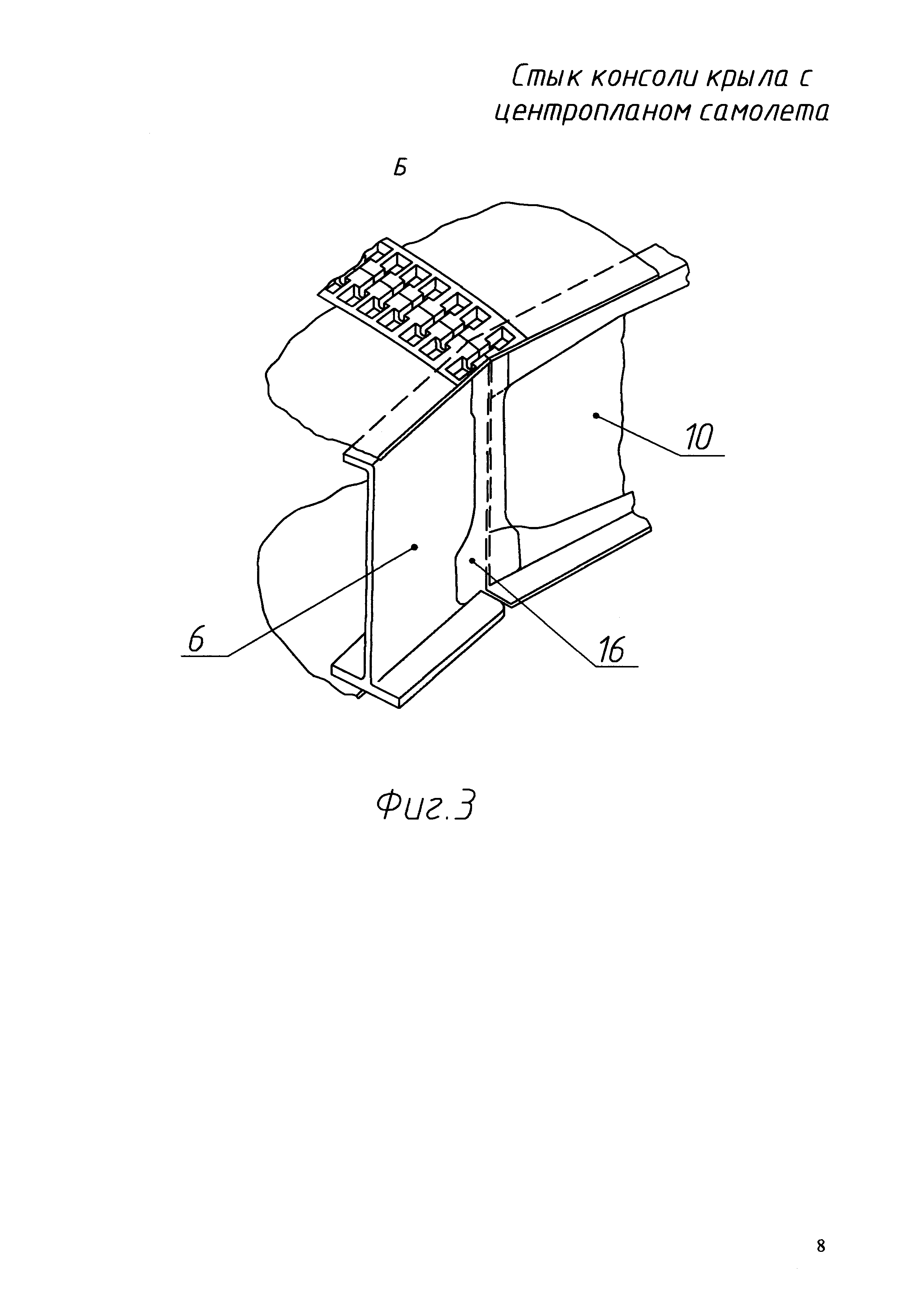 Изобретение относится к области авиастроения, а именно к конструкции самолетов, касается конструкции стыка консоли крыла с центропланом самолета. Известно устройство соединения консолей крыла и центроплана по патенту RU №2556268 C1, МПК В64С 1/26. В данной публикации раскрывается соединение консолей крыла и центроплана самолета, в котором консоль крыла выполнена с верхними и нижними панелями, а центроплан выполнен в виде коробчатой конструкции, содержит стенки бортовых нервюр, верхнюю и нижнюю панели, при этом верхние и нижние панели центроплана соединены соответственно с верхними и нижними панелями консоли крыла посредством верхних и нижних внешних и внутренних накладок, причем: в первом варианте прокладки установлены между верхней внутренней накладкой и верхней панелью центроплана, во втором варианте прокладки установлены между верхней внешней накладкой и верхней панелью центроплана. Недостатками устройства являются значительные затраты времени при подборе и подгонке прокладок и, как следствие, увеличенный цикл сборки. Наиболее близким техническим решением, выбранным в качестве прототипа, является патент US №2012/0286090 А1, в котором приводится способ соединения фюзеляжа с крылом, характеризующийся тем, что торцевая нервюра коробчатого центроплана, расположенная на поверхности фюзеляжа, обеспечивает стыковку консоли крыла с центропланом по всему контуру. Нижние панели стыкуются на тавровом нижнем поясе нервюры. Верхняя панель отъемной части крыла и верхняя панель центроплана состыкованы кронштейнами, установленными на наружной и внутренней поверхностях верхней панели консоли крыла и верхней панели центроплана крыла. Кронштейны соединены между собой в поперечном направлении через нервюру, продлевающую фюзеляж, болтами, в целях передачи механических напряжений. Недостатками известного технического решения является большое количество стыковочных кронштейнов и соединительного крепежа, что приводит к повышенной массе конструкции, высокой трудоемкости при изготовлении деталей и стыковке. Технический результат заявленного изобретения заключается в уменьшении трудоемкости и времени стыковки частей крыла, уменьшении количества стыковочных деталей и крепежа, снижении массы конструкции. Указанный технический результат достигается тем, что консоль крыла выполнена в виде коробчатой конструкции, имеющая стыковочную нервюру, установленную на торце консольной части крыла. Центроплан коробчатой конструкции не имеет стыковочной нервюры. Стыковочная нервюра, установленная на торце консольной части крыла, обеспечивает стыковку нижних панелей на тавровом нижнем поясе нервюры. Стыковка стенок лонжеронов выполнена на тавровых стойках нервюры с прокладками по стенкам лонжеронов центроплана. Стык верхних панелей консольной части крыла и центроплана выполнен со смещением от плоскости стыковочной нервюры в сторону центроплана. Стыковка верхних панелей консольной части крыла и центроплана выполнена при помощи фрезерованных фланцевых узлов с колодцами, выполненными зацело с верхними фрезерованными панелями или цельнофрезерованных фланцевых узлов с колодцами, установленных на верхних панелях. Торцы колодцев центроплана и консоли крыла стыкуются болтами. Колодцы закрыты съемной лентой, которая защищает их от вл