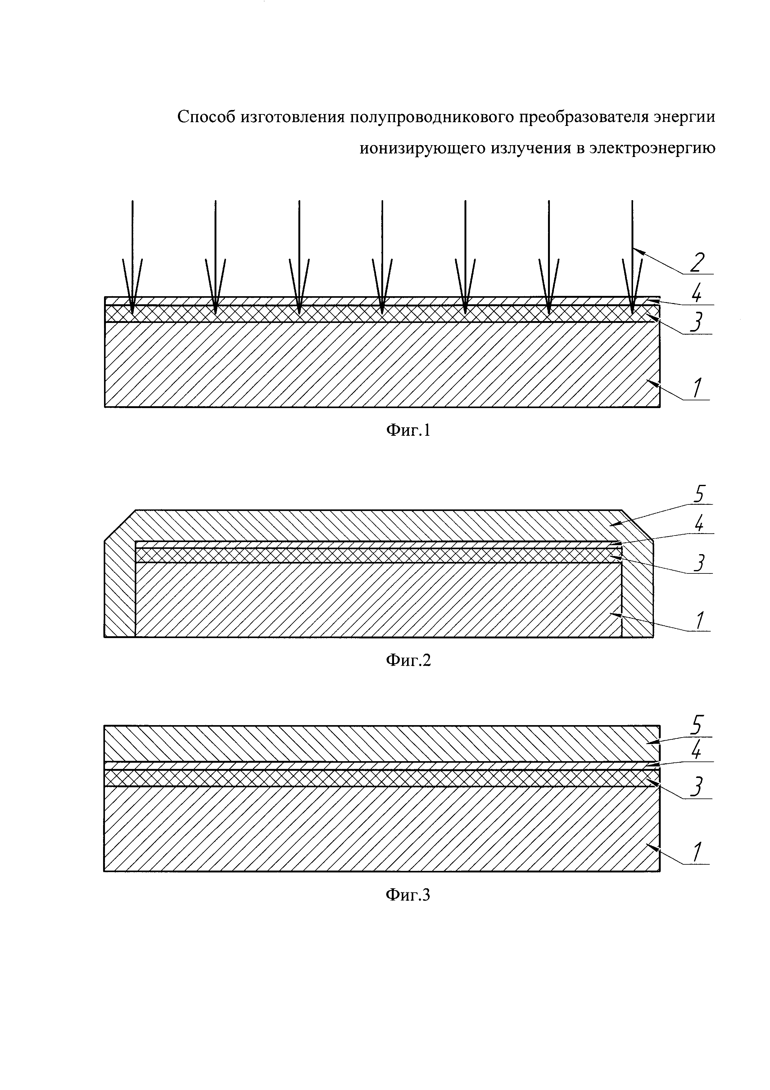 1. Способ изготовления полупроводникового преобразователя энергии ионизирующего излучения в электроэнергию, включающий изготовление на подложке из полупроводника эпитаксиального слоя и формирование положительного и отрицательного контактов, отличающийся тем, что подложку изготавливают из алмаза типа IIb, на одной из сторон алмазной подложки формируют жертвенный слой и остаточный слой посредством имплантации ионов с энергией не менее 100 кэВ с последующим отжигом подложки в вакууме или атмосфере инертного газа при температуре от 700 до 2000°С, затем на остаточном слое проводят синтез эпитаксиального слоя алмаза типа IIb толщиной от 5 до 50 мкм, удаляют синтезированный слой алмаза с торцов подложки, затем методом электрохимического травления в сильном окислителе удаляют жертвенный слой, отделяют эпитаксиальный слой алмаза с остаточным слоем от основной части подложки, формируют положительный контакт преобразователя на остаточном слое, затем эпитаксиальный слой алмаза подвергают воздействию ионизирующего излучения длиной волны не более 200 нм и мощностью не менее 50 мкВт/см2 в атмосфере кислорода при давлении 10-50 кПа в течение не менее 5 мин или эпитаксиальный слой алмаза подвергают нагреву до температуры 600-700°С в атмосфере кислорода в течение не менее 5 мин или эпитаксиальный слой алмаза подвергают воздействию кислородной плазмы при давлении 0,5-20 Торр при плотности мощности 10-2000 мВт/см2 в течение не менее 20 секунд и формируют отрицательный контакт преобразователя на эпитаксиальном слое алмаза. 2. Способ по п. 1, отличающийся тем, что положительный контакт преобразователя выполняют магнетронным напылением из трех слоев, причем первый слой положительного контакта преобразователя выполняют из металла, выбранного из ряда: титан, молибден, вольфрам, хром, второй слой положительного контакта преобразователя выполняют из платины, а третий слой положительного контакта преобразователя выполняют из золота. 3. Способ по п. 1, отличающийся тем, что отрицательный контакт преобразователя выполняют магнетронным напылением из металла, выбранного из ряда: золото, платина, алюминий, никель.