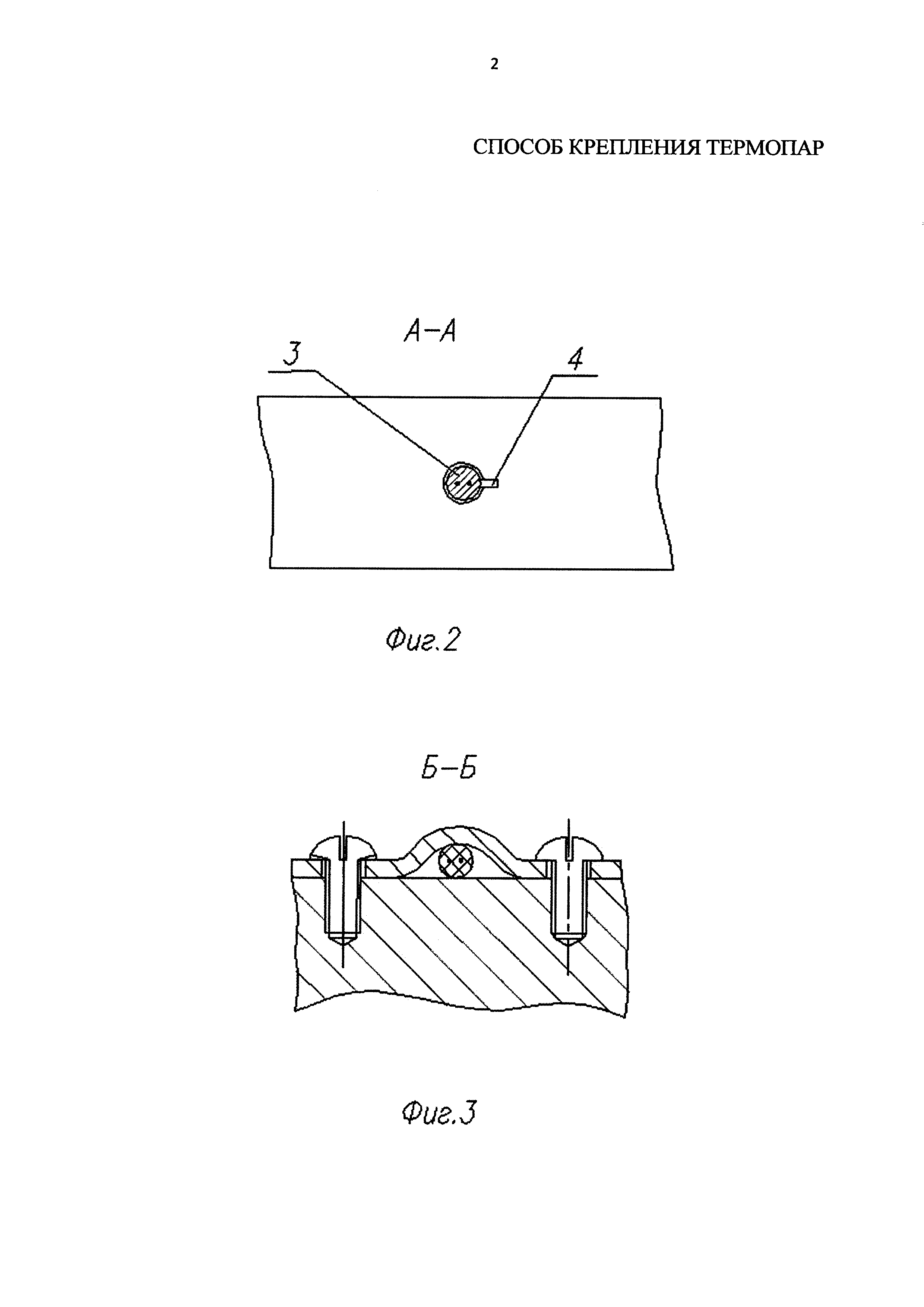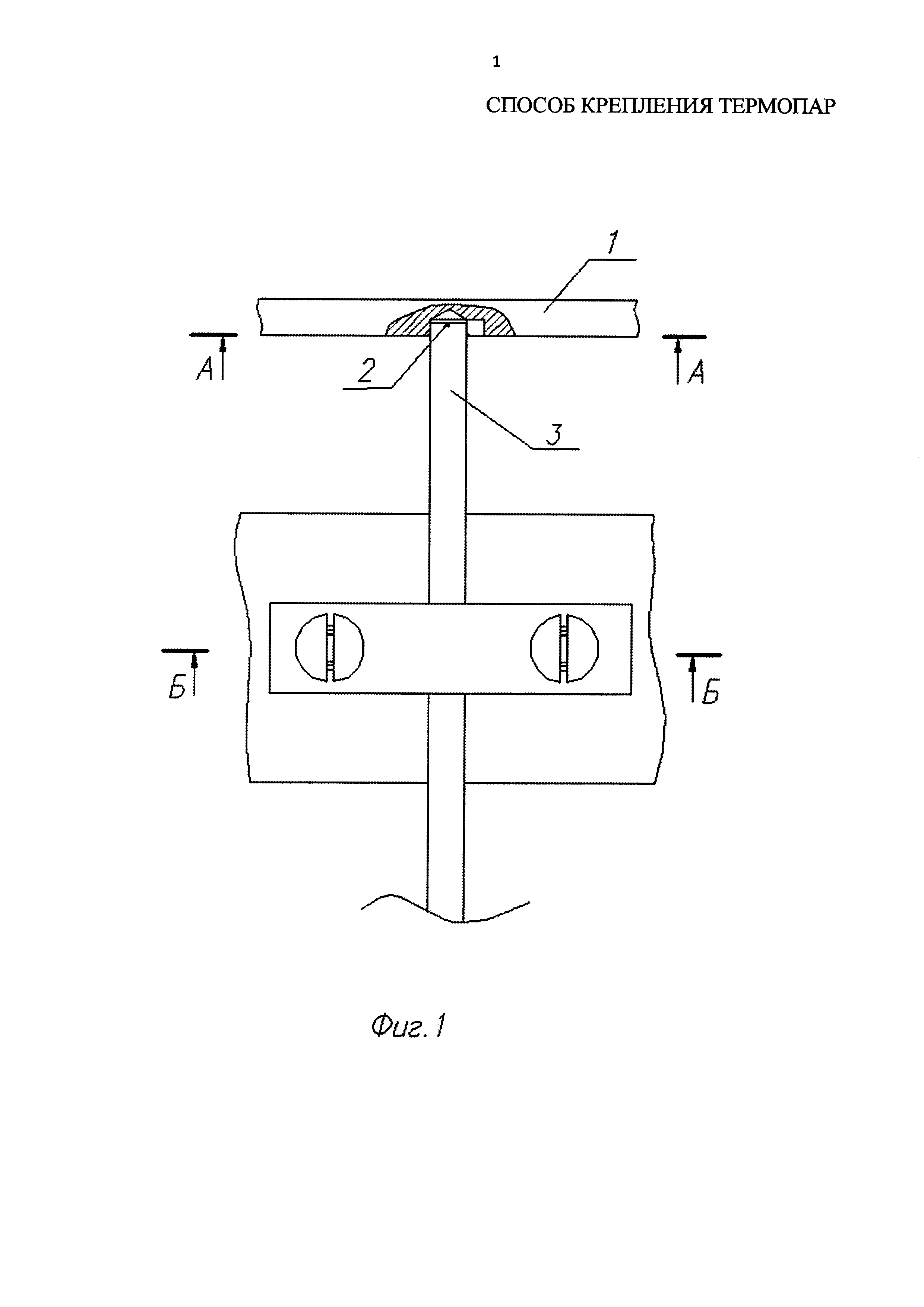 Изобретение относится к области измерения температуры с использованием термопар, а именно к способам крепления термопар к объектам, подверженным деформациям вследствие линейных расширений при высоких температурах и вибрационным воздействиям, например, к корпусам летательных аппаратов. Условия, которые необходимо соблюдать при измерении температуры подобных объектов, следующие: - максимальный тепловой контакт горячего спая с образцом; - сохранение целостности и прочности образца; - сохранение целостности и электрических характеристик термопары в процессе измерений. Требуемые условия для закрепления термопар достигаются двумя путями. Первый путь - это механическое прижатие термопары к поверхности образца [1. Авт. св. SU №49379, кл. G01K 7/02. Прибор для измерения температуры поверхностей / Брюханов Ф.С. (12.12.1935). Опубл. 31.08.1936 г.]. Такой способ не обеспечивает надежное контактирование горячего спая и испытуемого образца в широком диапазоне измеряемых температур. Возможно механическое повреждение термопары из-за соударений с испытуемым образцом при вибрации. При нарушении механического контакта термопары и испытуемого образца результаты измерений становятся недостоверными, резко увеличивается инерционность измерений. Второй путь - это вдавливание горячего спая термопары в расплавленный металл в точке измерений [2. Патент RU №2034246. МПК6 G01K 7/02. Способ крепления термопар / Мугалев А.П. (23.07.1982). Опубл. 30.04.1995]. Наряду с достоинствами метода - хороший контакт термопары и образца, хорошие метрологические характеристики - он не может использоваться для динамически подвижных объектов в связи с риском поломки термопар. Известен способ крепления по авторскому свидетельству SU №180382 [3. Авт. св. SU №180382. МПК6 G01K. Способ установки термопары для контроля температуры продукта в процессе сублимационной сушки / Яушева Э.Ф., Камовников Б.П. (13.11.1965). Опубл. 21.03.1966. Бюл. №7.] По этому способу в образце выполняется отверстие, термопара вводится в тело испытуемого образца в отверстие и жестко фиксируется в таком положении. Такой способ, создавая механическую прочность крепления термопары к образцу, не обеспечивает надежность контактирования при деформациях образца вследствие линейных температурных расширений при высоких температурах и воздействии вибрации. Более того, при жестком креплении термопары к испытуемому объекту при перемещении объекта возможны повреждения термопары и невозможность выполнения измерений. Известен способ крепления термопар путем их размещения в теле испытуемого объекта, характеризующегося температурными деформациями и воздействием вибрационных нагрузок, причем гибкий корпус термопары жестко крепят вблизи точки измерения к неподвижным окружающим конструкциям [4. CN 1936525 А. МПК6G01K 1/14, G01K 7/02, G01K 3/08. Carbon-fiber composite material highspeed air-craft rectifying cover surface transient temperature measuring apparatus (BEIJING AERONAUTICAL & SPACE U) 28.03.2007, описание с. 6, абз. 4-5, фиг. 1-3.] В данном решении в теле испытуемого объекта в точке измерения отсутствует глухое отверстие с фаской и дренажным каналом для отвода горячего воздуха из глухой полости точки измерения, тем самым не обеспечено касание корпуса термопары и испытуемого объекта в процессе измерений. Наиболее близкой к изобретению является методика температурных измерений, предусматривающая выполнение в теле испытуемого объекта в точке 