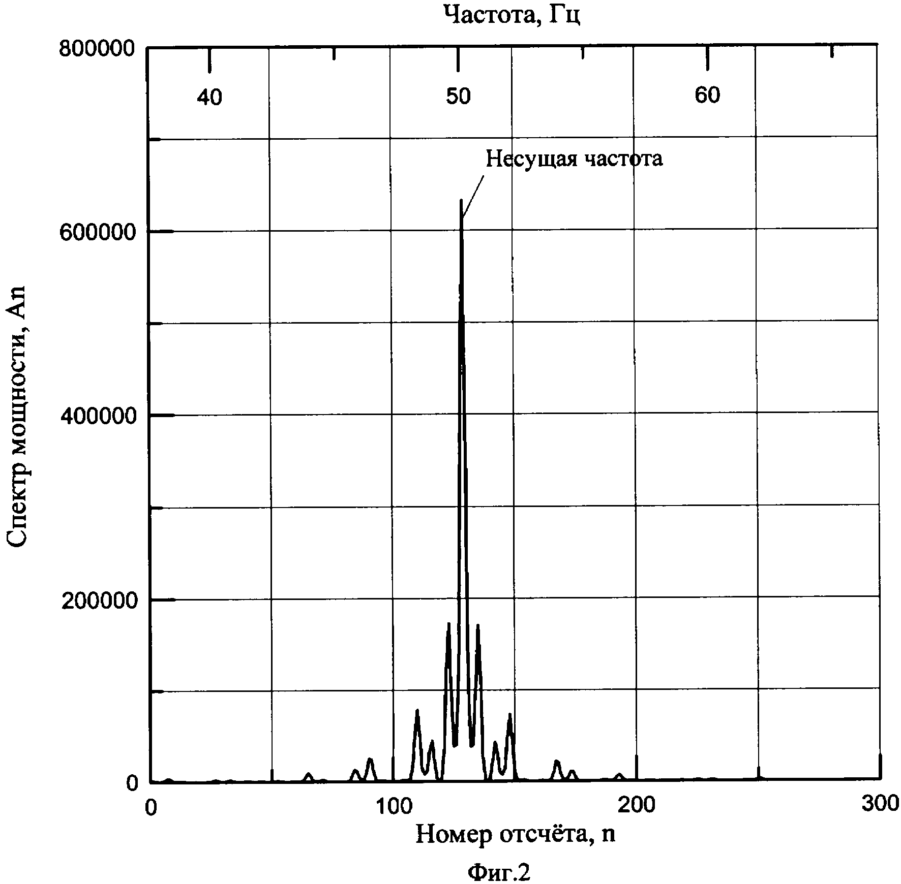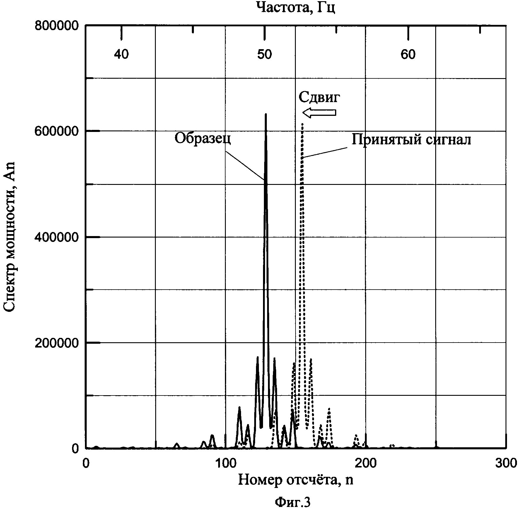 сигнала с несущей частотой. На фиг.3 представлены спектры мощности образцового сигнала и принятого сигнала. У принятого сигнала значение несущей частоты выше значения несущей частоты