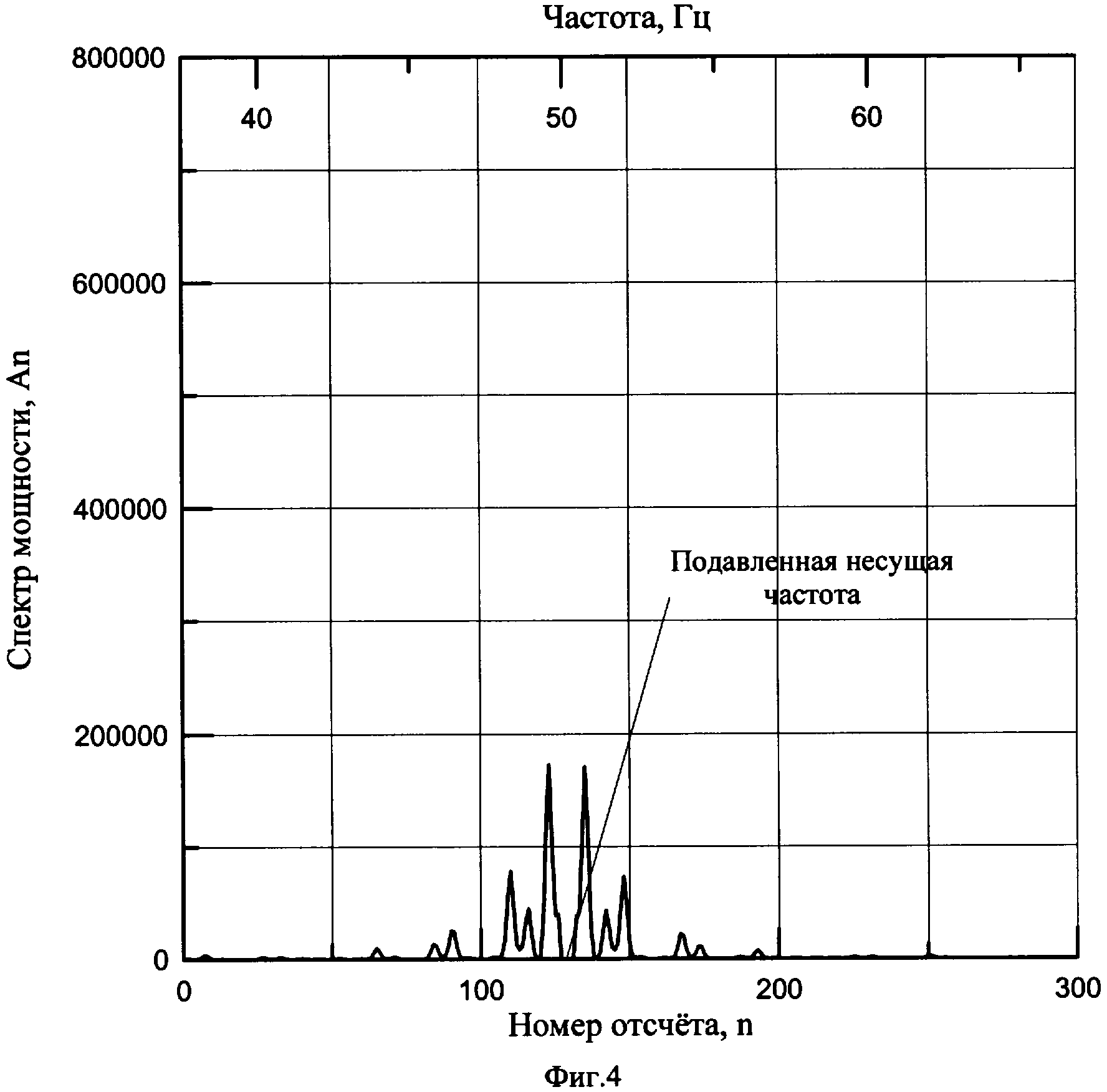необходимо совместить энергетический портрет принятого сигнала с портретом образцового сигнала так, чтобы максимумы, соответствующие несущим, совпали. Такую операцию сдвига иллюстрирует фиг.3. После этого для корректного расчета значений коэффициентов корреляции осуществляется подавление несущей частоты в образцовых спектрах и спектре принятого сигнала фиг.4. Для