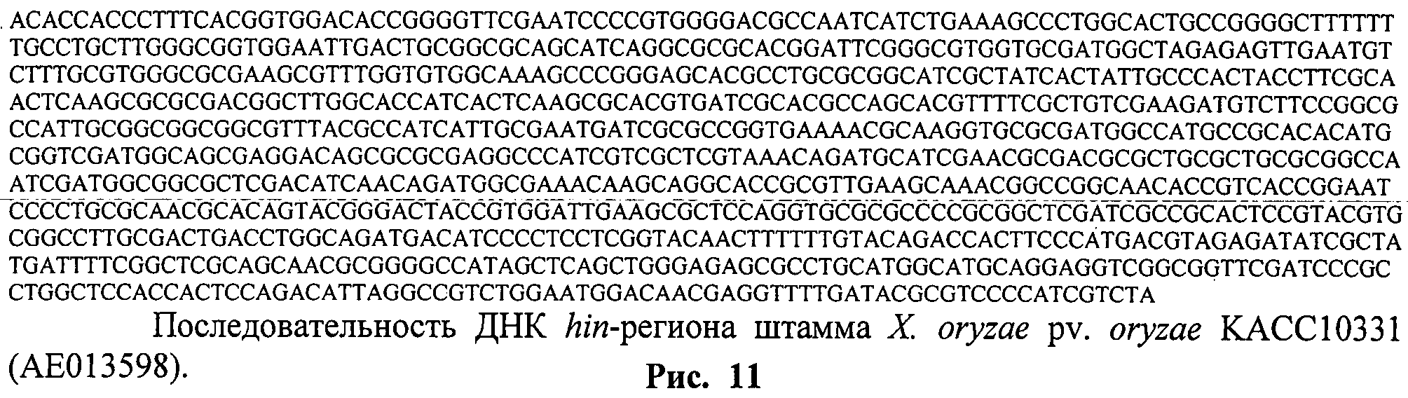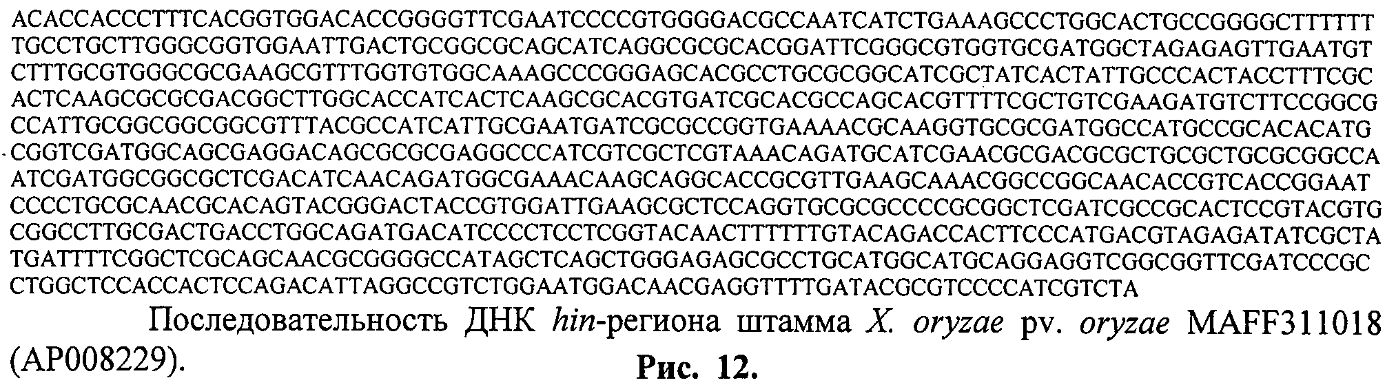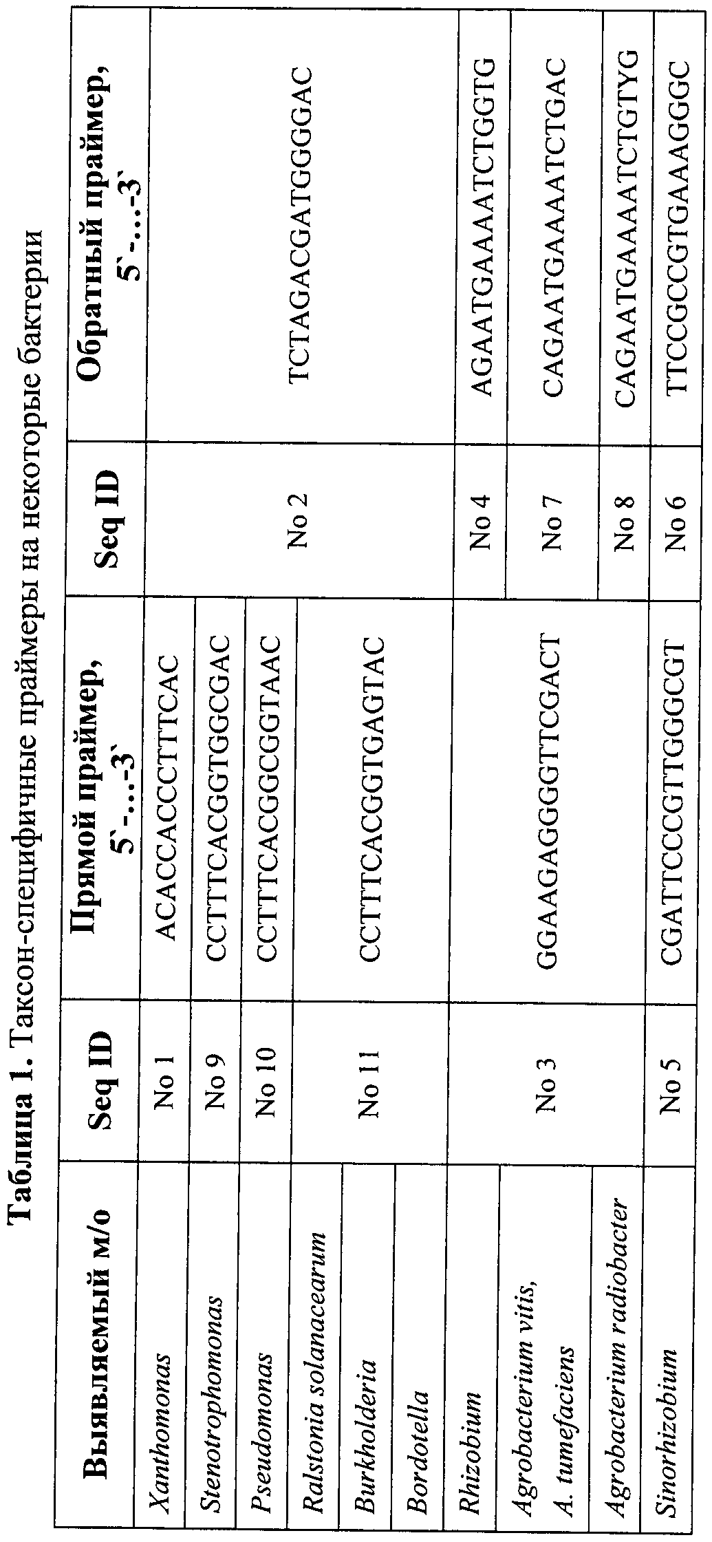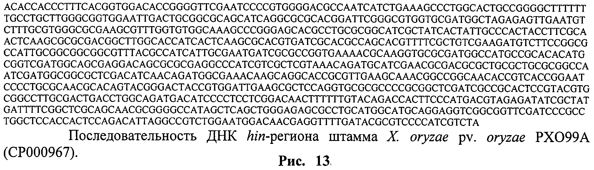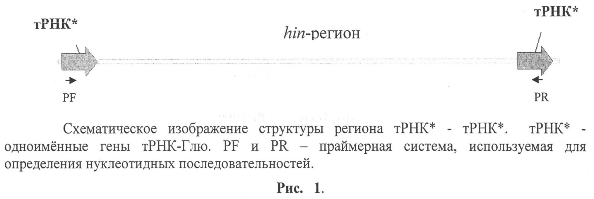 Изобретение относится к области биотехнологии и касается способа идентификации одного микроорганизма или одновременной идентификации нескольких различных микроорганизмов в образце по нуклеотидной последовательности hin-региона (от латинского Hin - уникальный, неповторимый), расположенного между копиями одноименных генов тРНК-Глю. Основные молекулярно-биологические методы, используемые для дифференциации и идентификации организмов, можно разделить на три категории: методы, базируемые на рестрикции, на амплификации (ПЦР) и на совокупности последних. К первой группе относится техника RFLP (Полиморфизм Длин Рестрикционных Фрагментов), которая заключается в фрагментировании нативной ДНК исследуемого организма с помощью ферментов рестриктаз и последующем разделении полученных фрагментов при помощи Пульс-Гель Электрофореза (PFGE) /Schwartz D.C., Cantor C.R. 1984. Separation of yeast chromosome-sized DNAs by pulsed field gradient gel electrophoresis. Cell. 37(1):67-75/. Обладая оригинальным принципом разделения фрагментов ДНК в геле, тем не менее данный метод весьма трудоемок на стадии получения и рестрикции целой нефрагментированной ДНК. Ко второй группе относятся такие техники, как: АР-ПЦР (случайная ПЦР, осуществляемая без знания нуклеотидной последовательности организма, основанная на геномном распределении случайных повторов) /Williams J.G-K., Kubelik A.R., Livak K.J., Rafalski J.A, Tingey S.V. 1990. DNA polymorphisms amplified by arbitrary primers are useful as genetic markers // Nucleic Acids Res. 18:6531-6535/; - гер-ПЦР (техника представляет собой комплекс праймеров на часто повторяющиеся в геномах энтеробактерий последовательности, получившие названия Box, Rep, Eric) /Versalotic J., Koeuth Т., Lupski J.R. 1991. Distribution of repetitive DNA sequences in eubacteria and application to fingerprinting of bacterial genomes //Nucleic Acids Res. 19:6823-6831/; - микросаттелитная ПЦР (техника, основанная на геномном распределении микросаттелитных последовательностей типа (GC)4, (GTG)5 и др.) /Epplen J.T., Ammer H., Epplen С. 1991. Oligonucleotide fingerprinting using simple repeat motifs: a convenient, ubiquitously applicable method to detect hypervariability for multiple purposes // In: DNA fingerprinting: approaches and applications. Eds.: G. Burke, G.Dolf, A.J.Jeffreys, and R.Wolff, Birkhauser, Basel. P.50-69; Toonen R. 1997. Microsatellites for Ecologists: Non-Radioactive Isolation and Amplification Protocols for microsatellite markers. Version 1. University of California; Ellegren H. 2004. MICROSATELLITES: SIMPLE SEQUENCES WITH COMPLEX EVOLUTION // Nature Reviews Genetics 5, No 6,435-445/; - тРНК-ПЦР (tDNA-ILP) (техника, основанная на геномном распределении консервативных участков генов тРНК) /Welsh J., McClelland M. 1991. Genomic fingerprints produced by PCR with consensus tRNA gene primers // Nucleic Acids Res. 19:861-866/; - IS-ПЦР (техника, основанная на геномном распределении последовательностей мобильных элементов, встречаемых в геноме исследуемого организма) /Mahillon J., Chandler M. 1998. Insertion sequences // Microbiol. Mol. Biol. Rev. 62:725-774; George M.L.C., Bustamam M., Cruz W.T., Leach J.E., Nelson R.J. 1997. Movement of Xanthomonas oryzae pv. oryzae in southeast Asia detected using PCR-based DNA fingerprinting // Phytopathology. 87:302-309/; - ПЦР анализ с праймерами на целевые гены (такими генами могут быть гены домашнего хозяйства (housekeeping) (gyrB, rpoD, dnaK, fyuA, atpD, recA, ginll, rpoB и др.) /Berg Т., Tesoriero L., Hailstones D.L. 2005. A multiplex real-time PCR assay for detection of Xanthomonas campestris from brassicas. // Letters in Appl. Microbiology. 42(6):624-630; Parkinson N., Aritua V., Heeney J., Cowie C., Bew J.D., Stead D. 2007. Phylogenetic analysis of Xanthomonas species by comparison of partial gyrase В gene sequences // Int. J. of Syst. and Evol. Microbiology. 57:2881-2887; Maiden M.C., Bygraves J.A., Feil E. 1998. Multilocus sequence typing: a portable approach to the identification of clones within populations of pathogenic microorganisms // Proc. Natl. Acad. Sci. U.S.A. 95:3140-3145); Vinuesa P., Rojas-Jiménez K., Contreras-Moreira В., Mahna S.K., Nandan Prasad В., Мое H., Babu Selvaraju S., Thierfelder H., Wemer D. 2008. Multilocus sequence analysis for assessment of the biogeography and evolutionary genetics of four Bradyrhizobium species that nodulate soybeans on the asiatic continent // Applied and Environmental Microbiology. 74(22):69