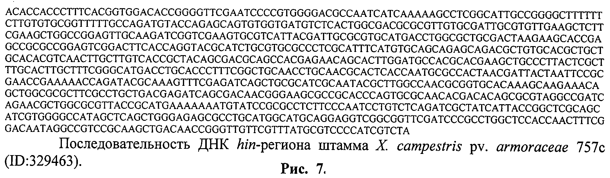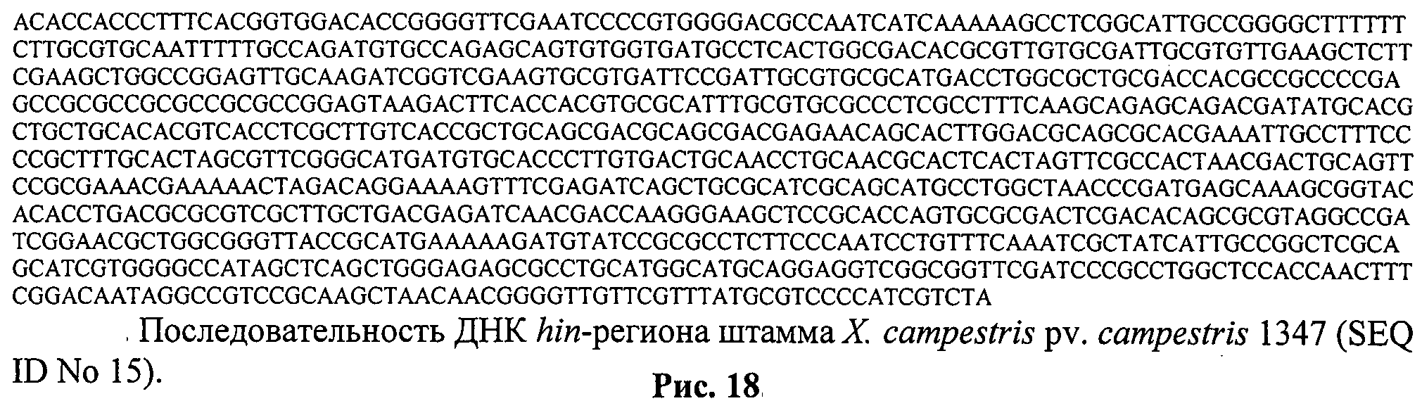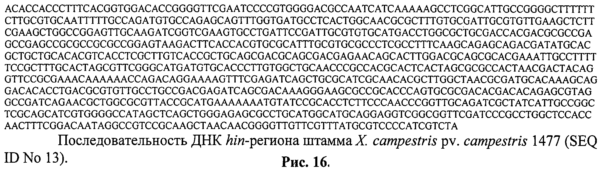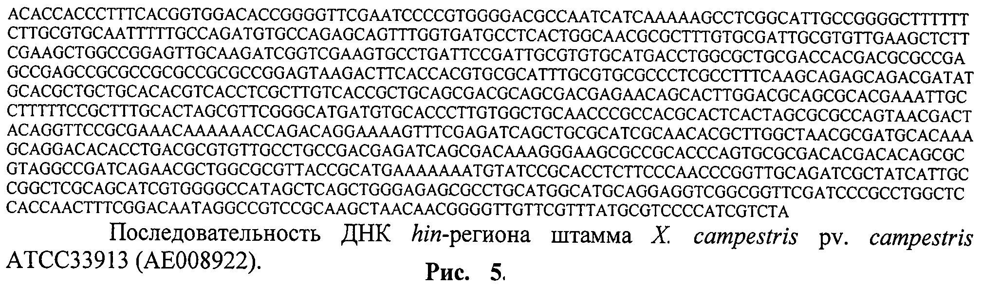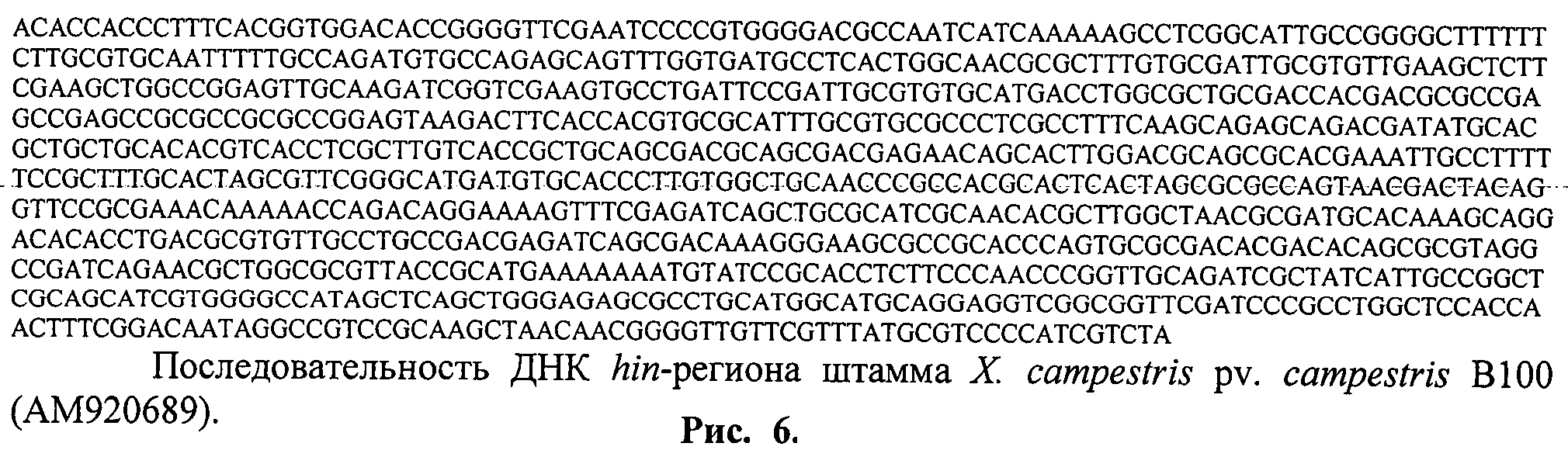 Изобретение относится к области биотехнологии и касается способа идентификации одного микроорганизма или одновременной идентификации нескольких различных микроорганизмов в образце по нуклеотидной последовательности hin-региона (от латинского Hin - уникальный, неповторимый), расположенного между копиями одноименных генов тРНК-Глю. Основные молекулярно-биологические методы, используемые для дифференциации и идентификации организмов, можно разделить на три категории: методы, базируемые на рестрикции, на амплификации (ПЦР) и на совокупности последних. К первой группе относится техника RFLP (Полиморфизм Длин Рестрикционных Фрагментов), которая заключается в фрагментировании нативной ДНК исследуемого организма с помощью ферментов рестриктаз и последующем разделении полученных фрагментов при помощи Пульс-Гель Электрофореза (PFGE) /Schwartz D.C., Cantor C.R. 1984. Separation of yeast chromosome-sized DNAs by pulsed field gradient gel electrophoresis. Cell. 37(1):67-75/. Обладая оригинальным принципом разделения фрагментов ДНК в геле, тем не менее данный метод весьма трудоемок на стадии получения и рестрикции целой нефрагментированной ДНК. Ко второй группе относятся такие техники, как: АР-ПЦР (случайная ПЦР, осуществляемая без знания нуклеотидной последовательности организма, основанная на геномном распределении случайных повторов) /Williams J.G-K., Kubelik A.R., Livak K.J., Rafalski J.A, Tingey S.V. 1990. DNA polymorphisms amplified by arbitrary primers are useful as genetic markers // Nucleic Acids Res. 18:6531-6535/; - гер-ПЦР (техника представляет собой комплекс праймеров на часто повторяющиеся в геномах энтеробактерий последовательности, получившие названия Box, Rep, Eric) /Versalotic J., Koeuth Т., Lupski J.R. 1991. Distribution of repetitive DNA sequences in eubacteria and application to fingerprinting of bacterial genomes //Nucleic Acids Res. 19:6823-6831/; - микросаттелитная ПЦР (техника, основанная на геномном распределении микросаттелитных последовательностей типа (GC)4, (GTG)5 и др.) /Epplen J.T., Ammer H., Epplen С. 1991. Oligonucleotide fingerprinting using simple repeat motifs: a convenient, ubiquitously applicable method to detect hypervariability for multiple purposes // In: DNA fingerprinting: approaches and applications. Eds.: G. Burke, G.Dolf, A.J.Jeffreys, and R.Wolff, Birkhauser, Basel. P.50-69; Toonen R. 1997. Microsatellites for Ecologists: Non-Radioactive Isolation and Amplification Protocols for microsatellite markers. Version 1. University of California; Ellegren H. 2004. MICROSATELLITES: SIMPLE SEQUENCES WITH COMPLEX EVOLUTION // Nature Reviews Genetics 5, No 6,435-445/; - тРНК-ПЦР (tDNA-ILP) (техника, основанная на геномном распределении консервативных участков генов тРНК) /Welsh J., McClelland M. 1991. Genomic fingerprints produced by PCR with consensus tRNA gene primers // Nucleic Acids Res. 19:861-866/; - IS-ПЦР (техника, основанная на геномном распределении последовательностей мобильных элементов, встречаемых в геноме исследуемого организма) /Mahillon J., Chandler M. 1998. Insertion sequences // Microbiol. Mol. Biol. Rev. 62:725-774; George M.L.C., Bustamam M., Cruz W.T., Leach J.E., Nelson R.J. 1997. Movement of Xanthomonas oryzae pv. oryzae in southeast Asia detected using PCR-based DNA fingerprinting // Phytopathology. 87:302-309/; - ПЦР анализ с праймерами на целевые гены (такими генами могут быть гены домашнего хозяйства (housekeeping) (gyrB, rpoD, dnaK, fyuA, atpD, recA, ginll, rpoB и др.) /Berg Т., Tesoriero L., Hailstones D.L. 2005. A multiplex real-time PCR assay for detection of Xanthomonas campestris from brassicas. // Letters in Appl. Microbiology. 42(6):624-630; Parkinson N., Aritua V., Heeney J., Cowie C., Bew J.D., Stead D. 2007. Phylogenetic analysis of Xanthomonas species by comparison of partial gyrase В gene sequences // Int. J. of Syst. and Evol. Microbiology. 57:2881-2887; Maiden M.C., Bygraves J.A., Feil E. 1998. Multilocus sequence typing: a portable approach to the identification of clones within populations of pathogenic microorganisms // Proc. Natl. Acad. Sci. U.S.A. 95:3140-3145); Vinuesa P., Rojas-Jiménez K., Contreras-Moreira В., Mahna S.K., Nandan Prasad В., Мое H., Babu Selvaraju S., Thierfelder H., Wemer D. 2008. Multilocus sequence analysis for assessment of the biogeography and evolutionary genetics of four Bradyrhizobium species that nodulate soybeans on the asiatic continent // Applied and Environmental Microbiology. 74(22):69