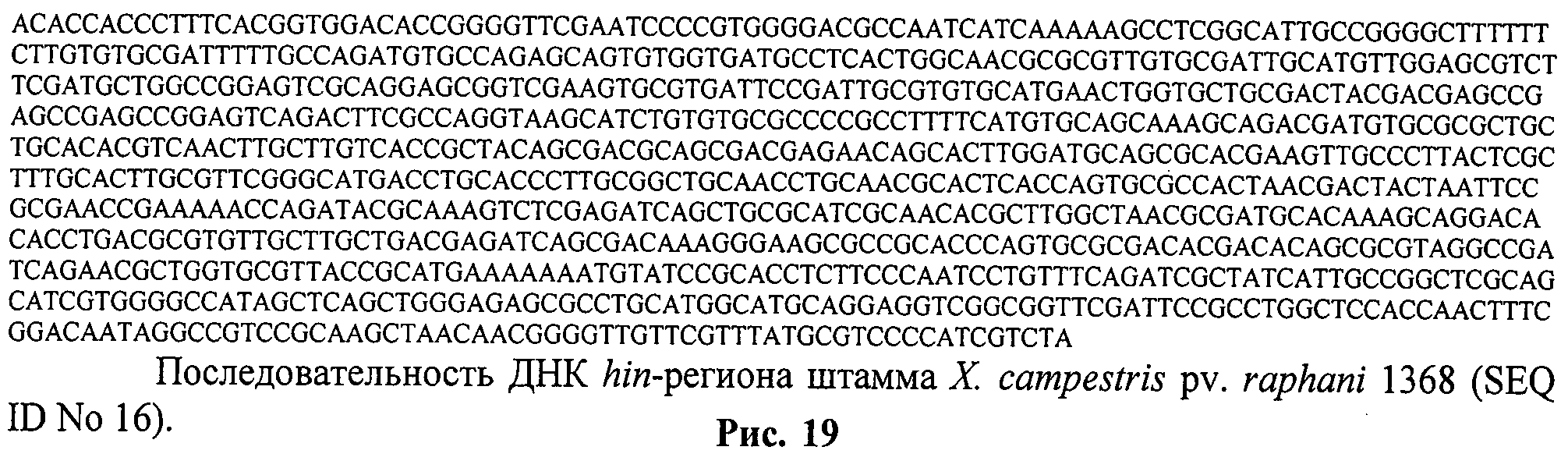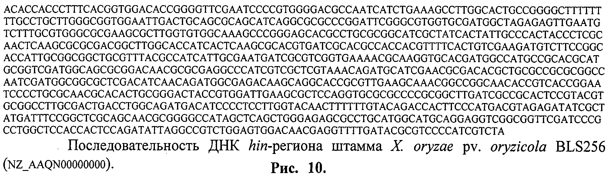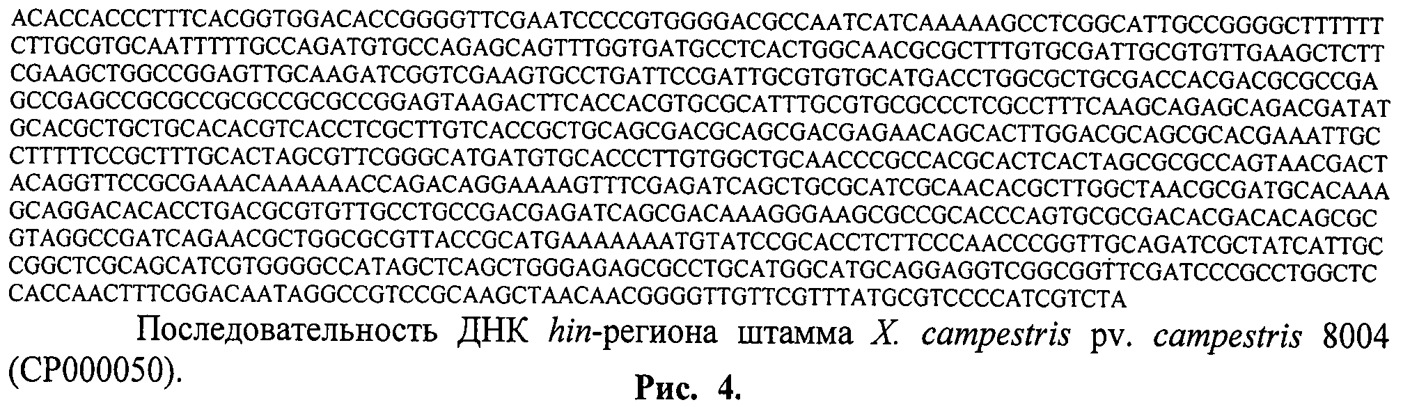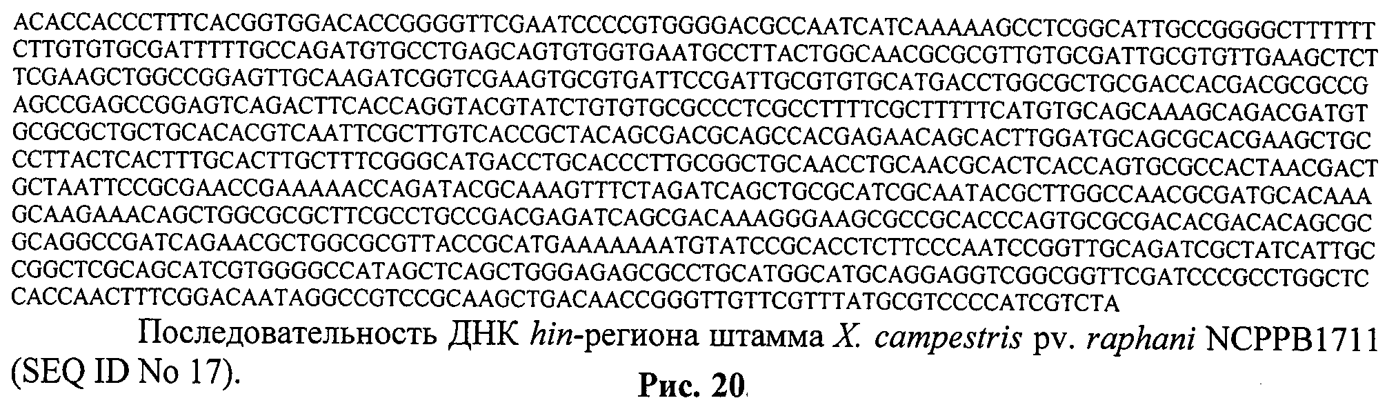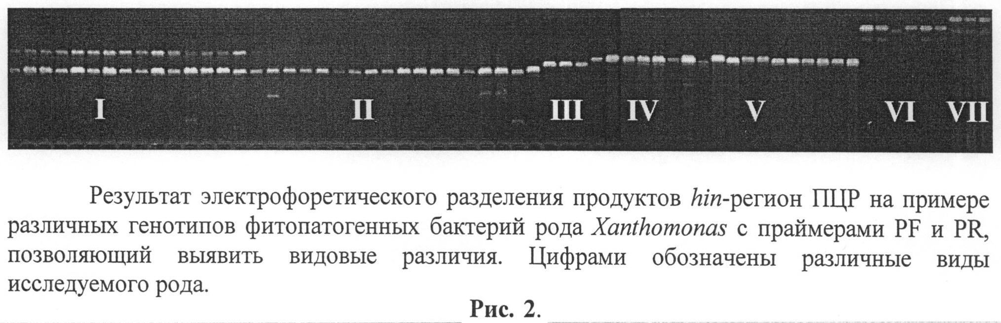 Изобретение относится к области биотехнологии и касается способа идентификации одного микроорганизма или одновременной идентификации нескольких различных микроорганизмов в образце по нуклеотидной последовательности hin-региона (от латинского Hin - уникальный, неповторимый), расположенного между копиями одноименных генов тРНК-Глю. Основные молекулярно-биологические методы, используемые для дифференциации и идентификации организмов, можно разделить на три категории: методы, базируемые на рестрикции, на амплификации (ПЦР) и на совокупности последних. К первой группе относится техника RFLP (Полиморфизм Длин Рестрикционных Фрагментов), которая заключается в фрагментировании нативной ДНК исследуемого организма с помощью ферментов рестриктаз и последующем разделении полученных фрагментов при помощи Пульс-Гель Электрофореза (PFGE) /Schwartz D.C., Cantor C.R. 1984. Separation of yeast chromosome-sized DNAs by pulsed field gradient gel electrophoresis. Cell. 37(1):67-75/. Обладая оригинальным принципом разделения фрагментов ДНК в геле, тем не менее данный метод весьма трудоемок на стадии получения и рестрикции целой нефрагментированной ДНК. Ко второй группе относятся такие техники, как: АР-ПЦР (случайная ПЦР, осуществляемая без знания нуклеотидной последовательности организма, основанная на геномном распределении случайных повторов) /Williams J.G-K., Kubelik A.R., Livak K.J., Rafalski J.A, Tingey S.V. 1990. DNA polymorphisms amplified by arbitrary primers are useful as genetic markers // Nucleic Acids Res. 18:6531-6535/; - гер-ПЦР (техника представляет собой комплекс праймеров на часто повторяющиеся в геномах энтеробактерий последовательности, получившие названия Box, Rep, Eric) /Versalotic J., Koeuth Т., Lupski J.R. 1991. Distribution of repetitive DNA sequences in eubacteria and application to fingerprinting of bacterial genomes //Nucleic Acids Res. 19:6823-6831/; - микросаттелитная ПЦР (техника, основанная на геномном распределении микросаттелитных последовательностей типа (GC)4, (GTG)5 и др.) /Epplen J.T., Ammer H., Epplen С. 1991. Oligonucleotide fingerprinting using simple repeat motifs: a convenient, ubiquitously applicable method to detect hypervariability for multiple purposes // In: DNA fingerprinting: approaches and applications. Eds.: G. Burke, G.Dolf, A.J.Jeffreys, and R.Wolff, Birkhauser, Basel. P.50-69; Toonen R. 1997. Microsatellites for Ecologists: Non-Radioactive Isolation and Amplification Protocols for microsatellite markers. Version 1. University of California; Ellegren H. 2004. MICROSATELLITES: SIMPLE SEQUENCES WITH COMPLEX EVOLUTION // Nature Reviews Genetics 5, No 6,435-445/; - тРНК-ПЦР (tDNA-ILP) (техника, основанная на геномном распределении консервативных участков генов тРНК) /Welsh J., McClelland M. 1991. Genomic fingerprints produced by PCR with consensus tRNA gene primers // Nucleic Acids Res. 19:861-866/; - IS-ПЦР (техника, основанная на геномном распределении последовательностей мобильных элементов, встречаемых в геноме исследуемого организма) /Mahillon J., Chandler M. 1998. Insertion sequences // Microbiol. Mol. Biol. Rev. 62:725-774; George M.L.C., Bustamam M., Cruz W.T., Leach J.E., Nelson R.J. 1997. Movement of Xanthomonas oryzae pv. oryzae in southeast Asia detected using PCR-based DNA fingerprinting // Phytopathology. 87:302-309/; - ПЦР анализ с праймерами на целевые гены (такими генами могут быть гены домашнего хозяйства (housekeeping) (gyrB, rpoD, dnaK, fyuA, atpD, recA, ginll, rpoB и др.) /Berg Т., Tesoriero L., Hailstones D.L. 2005. A multiplex real-time PCR assay for detection of Xanthomonas campestris from brassicas. // Letters in Appl. Microbiology. 42(6):624-630; Parkinson N., Aritua V., Heeney J., Cowie C., Bew J.D., Stead D. 2007. Phylogenetic analysis of Xanthomonas species by comparison of partial gyrase В gene sequences // Int. J. of Syst. and Evol. Microbiology. 57:2881-2887; Maiden M.C., Bygraves J.A., Feil E. 1998. Multilocus sequence typing: a portable approach to the identification of clones within populations of pathogenic microorganisms // Proc. Natl. Acad. Sci. U.S.A. 95:3140-3145); Vinuesa P., Rojas-Jiménez K., Contreras-Moreira В., Mahna S.K., Nandan Prasad В., Мое H., Babu Selvaraju S., Thierfelder H., Wemer D. 2008. Multilocus sequence analysis for assessment of the biogeography and evolutionary genetics of four Bradyrhizobium species that nodulate soybeans on the asiatic continent // Applied and Environmental Microbiology. 74(22):69