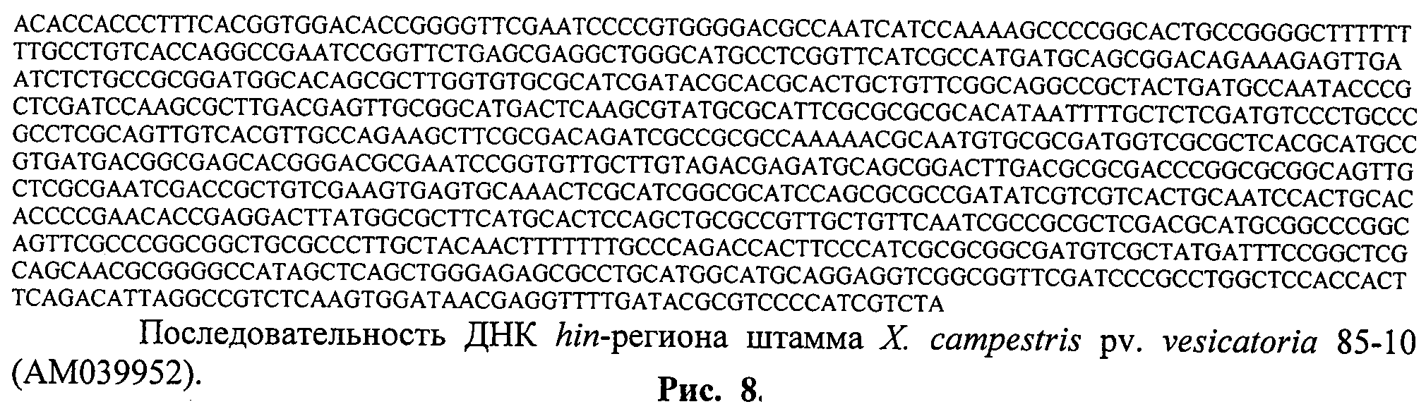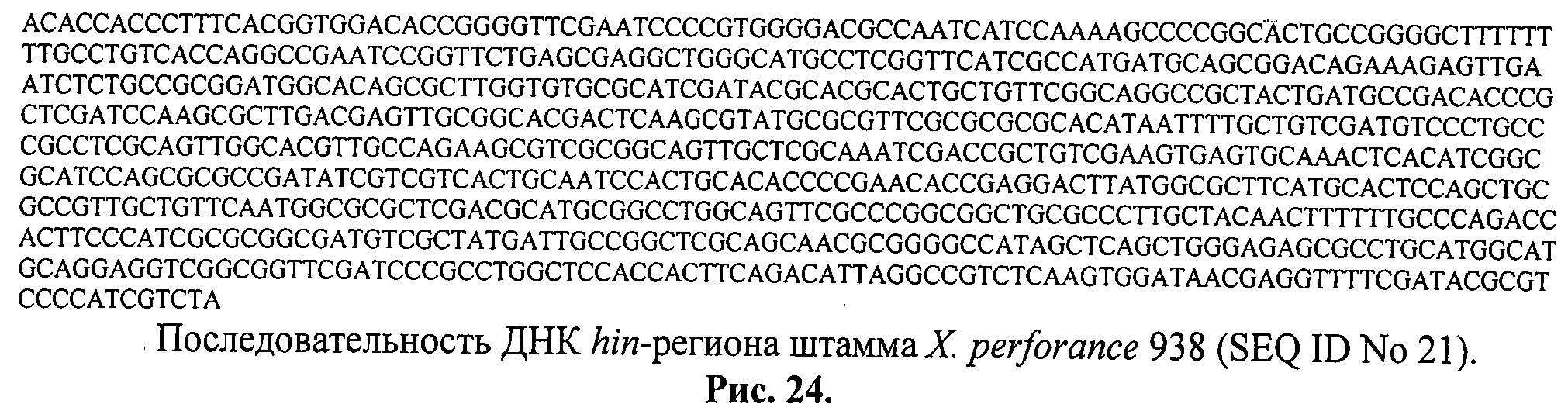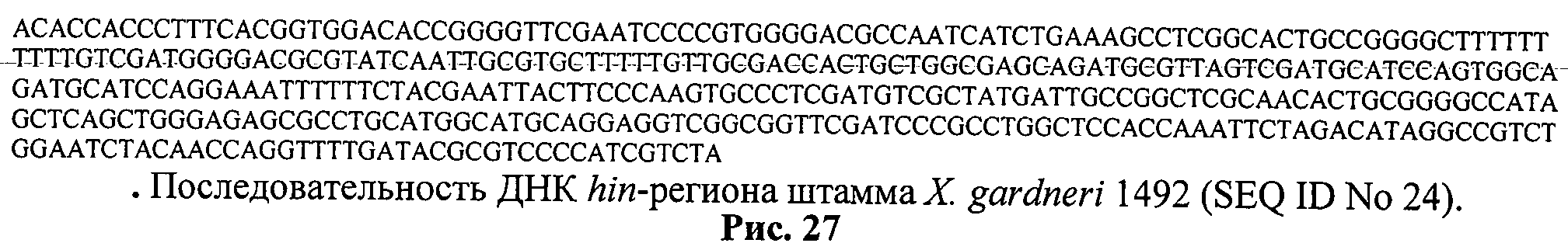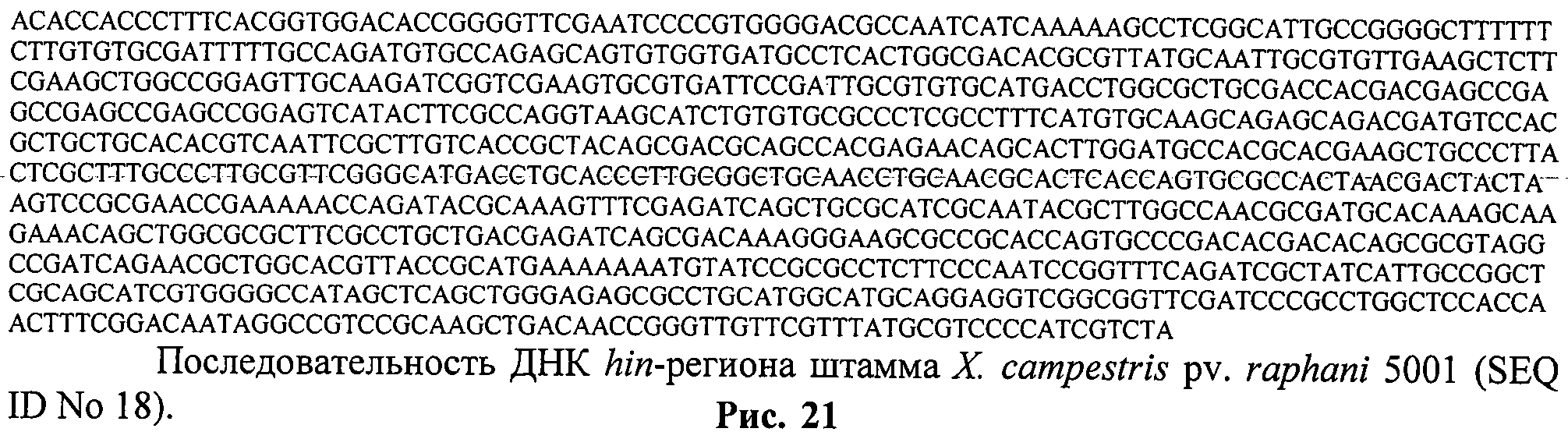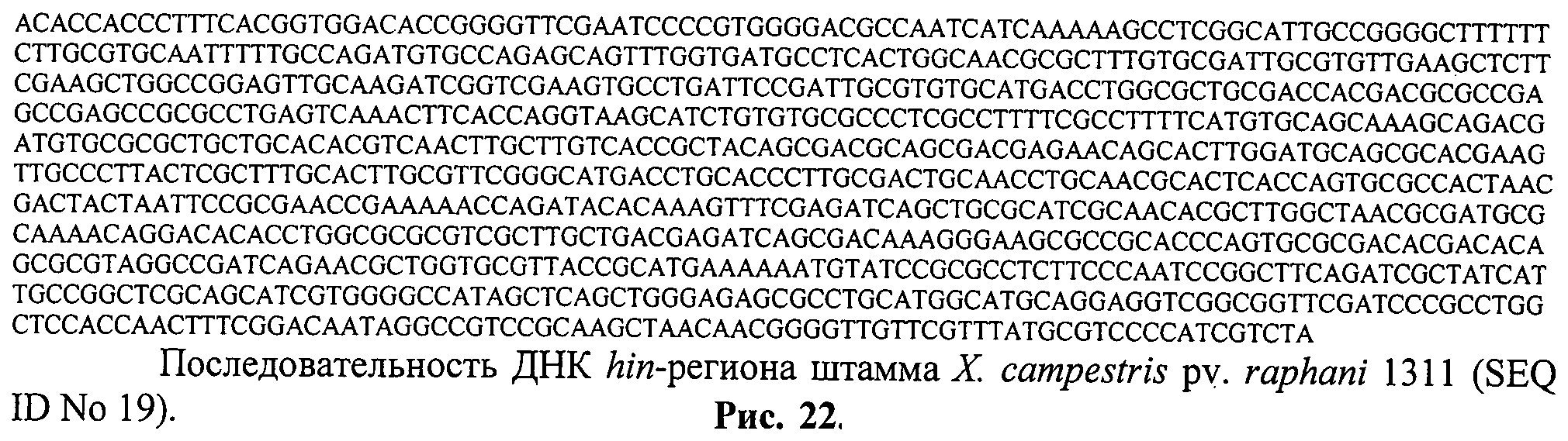 Изобретение относится к области биотехнологии и касается способа идентификации одного микроорганизма или одновременной идентификации нескольких различных микроорганизмов в образце по нуклеотидной последовательности hin-региона (от латинского Hin - уникальный, неповторимый), расположенного между копиями одноименных генов тРНК-Глю. Основные молекулярно-биологические методы, используемые для дифференциации и идентификации организмов, можно разделить на три категории: методы, базируемые на рестрикции, на амплификации (ПЦР) и на совокупности последних. К первой группе относится техника RFLP (Полиморфизм Длин Рестрикционных Фрагментов), которая заключается в фрагментировании нативной ДНК исследуемого организма с помощью ферментов рестриктаз и последующем разделении полученных фрагментов при помощи Пульс-Гель Электрофореза (PFGE) /Schwartz D.C., Cantor C.R. 1984. Separation of yeast chromosome-sized DNAs by pulsed field gradient gel electrophoresis. Cell. 37(1):67-75/. Обладая оригинальным принципом разделения фрагментов ДНК в геле, тем не менее данный метод весьма трудоемок на стадии получения и рестрикции целой нефрагментированной ДНК. Ко второй группе относятся такие техники, как: АР-ПЦР (случайная ПЦР, осуществляемая без знания нуклеотидной последовательности организма, основанная на геномном распределении случайных повторов) /Williams J.G-K., Kubelik A.R., Livak K.J., Rafalski J.A, Tingey S.V. 1990. DNA polymorphisms amplified by arbitrary primers are useful as genetic markers // Nucleic Acids Res. 18:6531-6535/; - гер-ПЦР (техника представляет собой комплекс праймеров на часто повторяющиеся в геномах энтеробактерий последовательности, получившие названия Box, Rep, Eric) /Versalotic J., Koeuth Т., Lupski J.R. 1991. Distribution of repetitive DNA sequences in eubacteria and application to fingerprinting of bacterial genomes //Nucleic Acids Res. 19:6823-6831/; - микросаттелитная ПЦР (техника, основанная на геномном распределении микросаттелитных последовательностей типа (GC)4, (GTG)5 и др.) /Epplen J.T., Ammer H., Epplen С. 1991. Oligonucleotide fingerprinting using simple repeat motifs: a convenient, ubiquitously applicable method to detect hypervariability for multiple purposes // In: DNA fingerprinting: approaches and applications. Eds.: G. Burke, G.Dolf, A.J.Jeffreys, and R.Wolff, Birkhauser, Basel. P.50-69; Toonen R. 1997. Microsatellites for Ecologists: Non-Radioactive Isolation and Amplification Protocols for microsatellite markers. Version 1. University of California; Ellegren H. 2004. MICROSATELLITES: SIMPLE SEQUENCES WITH COMPLEX EVOLUTION // Nature Reviews Genetics 5, No 6,435-445/; - тРНК-ПЦР (tDNA-ILP) (техника, основанная на геномном распределении консервативных участков генов тРНК) /Welsh J., McClelland M. 1991. Genomic fingerprints produced by PCR with consensus tRNA gene primers // Nucleic Acids Res. 19:861-866/; - IS-ПЦР (техника, основанная на геномном распределении последовательностей мобильных элементов, встречаемых в геноме исследуемого организма) /Mahillon J., Chandler M. 1998. Insertion sequences // Microbiol. Mol. Biol. Rev. 62:725-774; George M.L.C., Bustamam M., Cruz W.T., Leach J.E., Nelson R.J. 1997. Movement of Xanthomonas oryzae pv. oryzae in southeast Asia detected using PCR-based DNA fingerprinting // Phytopathology. 87:302-309/; - ПЦР анализ с праймерами на целевые гены (такими генами могут быть гены домашнего хозяйства (housekeeping) (gyrB, rpoD, dnaK, fyuA, atpD, recA, ginll, rpoB и др.) /Berg Т., Tesoriero L., Hailstones D.L. 2005. A multiplex real-time PCR assay for detection of Xanthomonas campestris from brassicas. // Letters in Appl. Microbiology. 42(6):624-630; Parkinson N., Aritua V., Heeney J., Cowie C., Bew J.D., Stead D. 2007. Phylogenetic analysis of Xanthomonas species by comparison of partial gyrase В gene sequences // Int. J. of Syst. and Evol. Microbiology. 57:2881-2887; Maiden M.C., Bygraves J.A., Feil E. 1998. Multilocus sequence typing: a portable approach to the identification of clones within populations of pathogenic microorganisms // Proc. Natl. Acad. Sci. U.S.A. 95:3140-3145); Vinuesa P., Rojas-Jiménez K., Contreras-Moreira В., Mahna S.K., Nandan Prasad В., Мое H., Babu Selvaraju S., Thierfelder H., Wemer D. 2008. Multilocus sequence analysis for assessment of the biogeography and evolutionary genetics of four Bradyrhizobium species that nodulate soybeans on the asiatic continent // Applied and Environmental Microbiology. 74(22):69