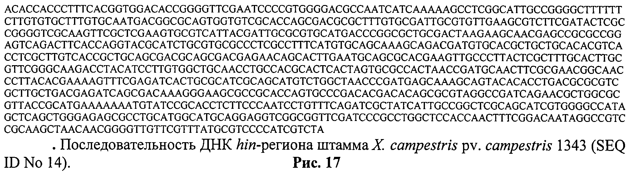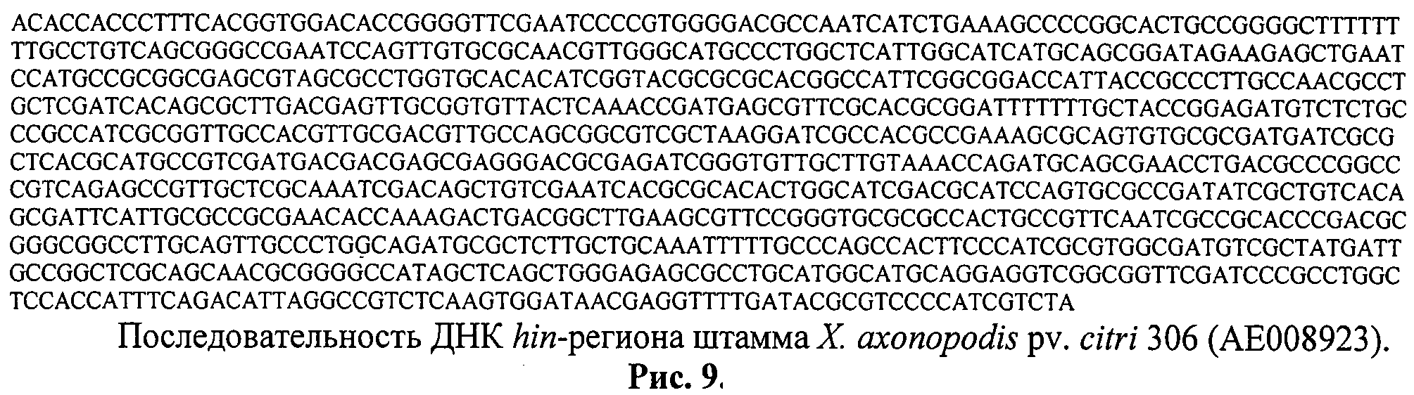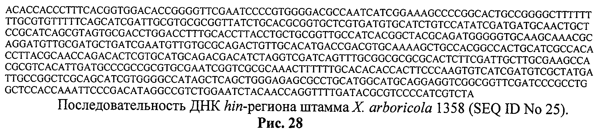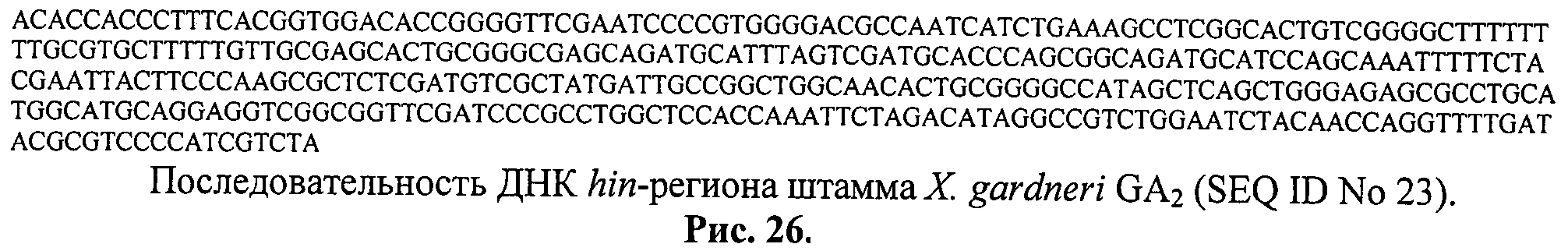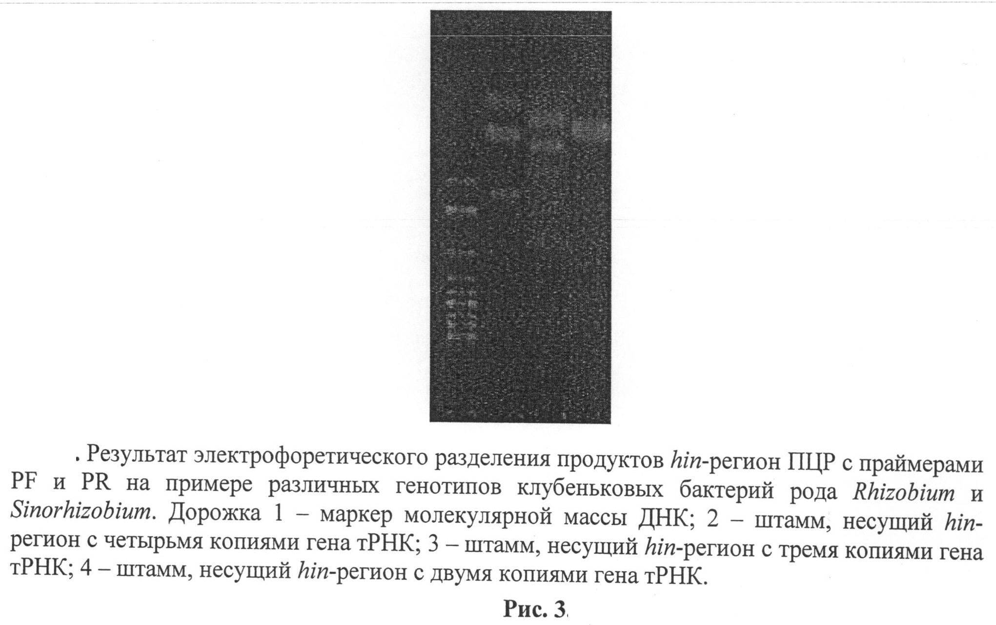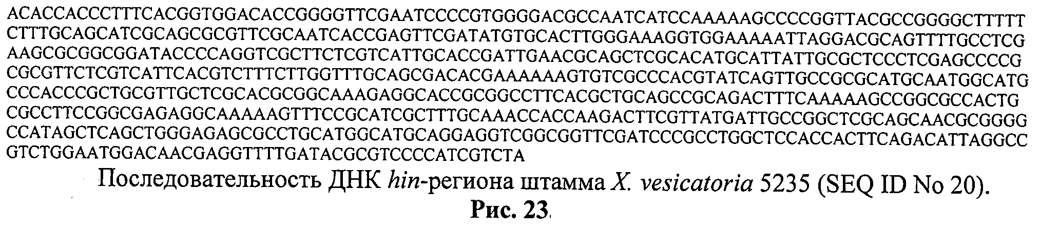 Изобретение относится к области биотехнологии и касается способа идентификации одного микроорганизма или одновременной идентификации нескольких различных микроорганизмов в образце по нуклеотидной последовательности hin-региона (от латинского Hin - уникальный, неповторимый), расположенного между копиями одноименных генов тРНК-Глю. Основные молекулярно-биологические методы, используемые для дифференциации и идентификации организмов, можно разделить на три категории: методы, базируемые на рестрикции, на амплификации (ПЦР) и на совокупности последних. К первой группе относится техника RFLP (Полиморфизм Длин Рестрикционных Фрагментов), которая заключается в фрагментировании нативной ДНК исследуемого организма с помощью ферментов рестриктаз и последующем разделении полученных фрагментов при помощи Пульс-Гель Электрофореза (PFGE) /Schwartz D.C., Cantor C.R. 1984. Separation of yeast chromosome-sized DNAs by pulsed field gradient gel electrophoresis. Cell. 37(1):67-75/. Обладая оригинальным принципом разделения фрагментов ДНК в геле, тем не менее данный метод весьма трудоемок на стадии получения и рестрикции целой нефрагментированной ДНК. Ко второй группе относятся такие техники, как: АР-ПЦР (случайная ПЦР, осуществляемая без знания нуклеотидной последовательности организма, основанная на геномном распределении случайных повторов) /Williams J.G-K., Kubelik A.R., Livak K.J., Rafalski J.A, Tingey S.V. 1990. DNA polymorphisms amplified by arbitrary primers are useful as genetic markers // Nucleic Acids Res. 18:6531-6535/; - гер-ПЦР (техника представляет собой комплекс праймеров на часто повторяющиеся в геномах энтеробактерий последовательности, получившие названия Box, Rep, Eric) /Versalotic J., Koeuth Т., Lupski J.R. 1991. Distribution of repetitive DNA sequences in eubacteria and application to fingerprinting of bacterial genomes //Nucleic Acids Res. 19:6823-6831/; - микросаттелитная ПЦР (техника, основанная на геномном распределении микросаттелитных последовательностей типа (GC)4, (GTG)5 и др.) /Epplen J.T., Ammer H., Epplen С. 1991. Oligonucleotide fingerprinting using simple repeat motifs: a convenient, ubiquitously applicable method to detect hypervariability for multiple purposes // In: DNA fingerprinting: approaches and applications. Eds.: G. Burke, G.Dolf, A.J.Jeffreys, and R.Wolff, Birkhauser, Basel. P.50-69; Toonen R. 1997. Microsatellites for Ecologists: Non-Radioactive Isolation and Amplification Protocols for microsatellite markers. Version 1. University of California; Ellegren H. 2004. MICROSATELLITES: SIMPLE SEQUENCES WITH COMPLEX EVOLUTION // Nature Reviews Genetics 5, No 6,435-445/; - тРНК-ПЦР (tDNA-ILP) (техника, основанная на геномном распределении консервативных участков генов тРНК) /Welsh J., McClelland M. 1991. Genomic fingerprints produced by PCR with consensus tRNA gene primers // Nucleic Acids Res. 19:861-866/; - IS-ПЦР (техника, основанная на геномном распределении последовательностей мобильных элементов, встречаемых в геноме исследуемого организма) /Mahillon J., Chandler M. 1998. Insertion sequences // Microbiol. Mol. Biol. Rev. 62:725-774; George M.L.C., Bustamam M., Cruz W.T., Leach J.E., Nelson R.J. 1997. Movement of Xanthomonas oryzae pv. oryzae in southeast Asia detected using PCR-based DNA fingerprinting // Phytopathology. 87:302-309/; - ПЦР анализ с праймерами на целевые гены (такими генами могут быть гены домашнего хозяйства (housekeeping) (gyrB, rpoD, dnaK, fyuA, atpD, recA, ginll, rpoB и др.) /Berg Т., Tesoriero L., Hailstones D.L. 2005. A multiplex real-time PCR assay for detection of Xanthomonas campestris from brassicas. // Letters in Appl. Microbiology. 42(6):624-630; Parkinson N., Aritua V., Heeney J., Cowie C., Bew J.D., Stead D. 2007. Phylogenetic analysis of Xanthomonas species by comparison of partial gyrase В gene sequences // Int. J. of Syst. and Evol. Microbiology. 57:2881-2887; Maiden M.C., Bygraves J.A., Feil E. 1998. Multilocus sequence typing: a portable approach to the identification of clones within populations of pathogenic microorganisms // Proc. Natl. Acad. Sci. U.S.A. 95:3140-3145); Vinuesa P., Rojas-Jiménez K., Contreras-Moreira В., Mahna S.K., Nandan Prasad В., Мое H., Babu Selvaraju S., Thierfelder H., Wemer D. 2008. Multilocus sequence analysis for assessment of the biogeography and evolutionary genetics of four Bradyrhizobium species that nodulate soybeans on the asiatic continent // Applied and Environmental Microbiology. 74(22):69