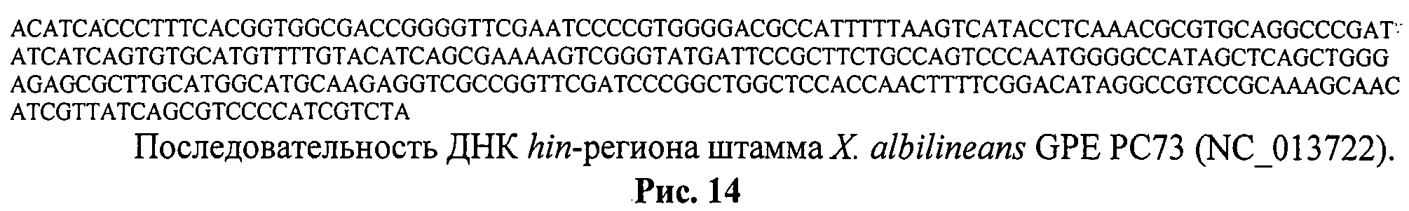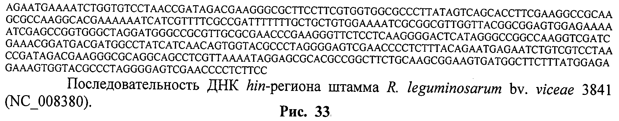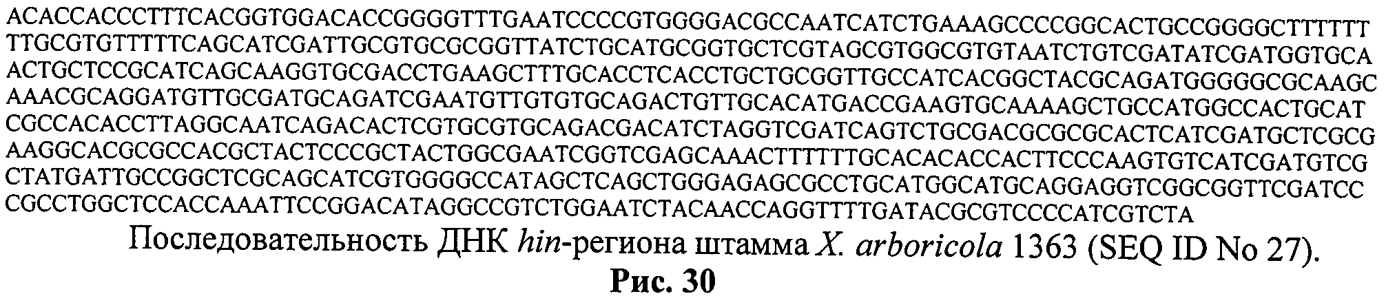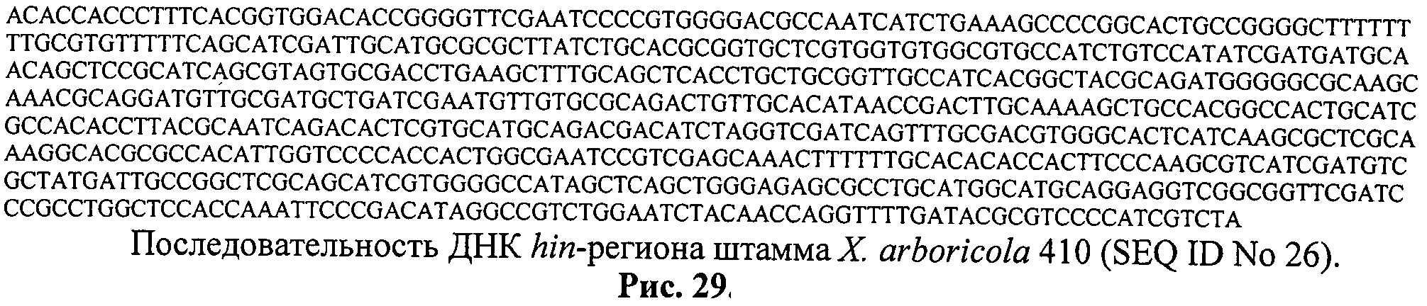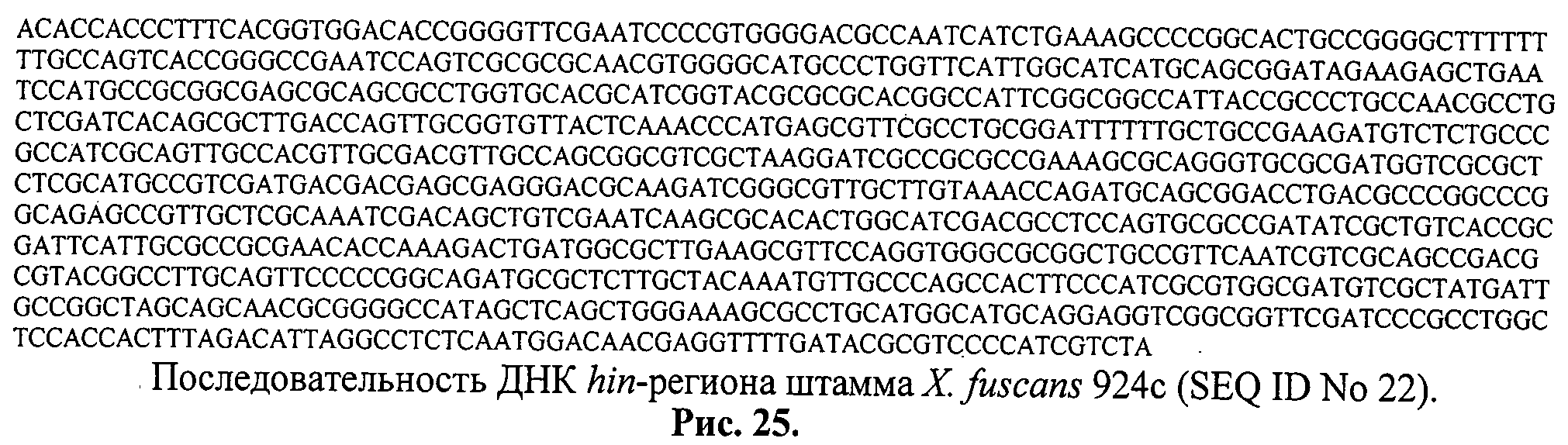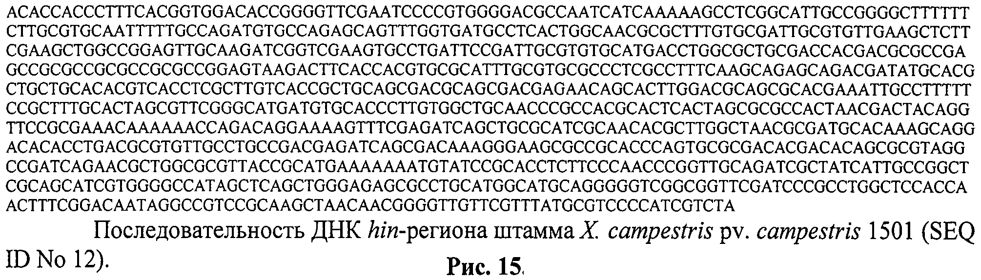 Изобретение относится к области биотехнологии и касается способа идентификации одного микроорганизма или одновременной идентификации нескольких различных микроорганизмов в образце по нуклеотидной последовательности hin-региона (от латинского Hin - уникальный, неповторимый), расположенного между копиями одноименных генов тРНК-Глю. Основные молекулярно-биологические методы, используемые для дифференциации и идентификации организмов, можно разделить на три категории: методы, базируемые на рестрикции, на амплификации (ПЦР) и на совокупности последних. К первой группе относится техника RFLP (Полиморфизм Длин Рестрикционных Фрагментов), которая заключается в фрагментировании нативной ДНК исследуемого организма с помощью ферментов рестриктаз и последующем разделении полученных фрагментов при помощи Пульс-Гель Электрофореза (PFGE) /Schwartz D.C., Cantor C.R. 1984. Separation of yeast chromosome-sized DNAs by pulsed field gradient gel electrophoresis. Cell. 37(1):67-75/. Обладая оригинальным принципом разделения фрагментов ДНК в геле, тем не менее данный метод весьма трудоемок на стадии получения и рестрикции целой нефрагментированной ДНК. Ко второй группе относятся такие техники, как: АР-ПЦР (случайная ПЦР, осуществляемая без знания нуклеотидной последовательности организма, основанная на геномном распределении случайных повторов) /Williams J.G-K., Kubelik A.R., Livak K.J., Rafalski J.A, Tingey S.V. 1990. DNA polymorphisms amplified by arbitrary primers are useful as genetic markers // Nucleic Acids Res. 18:6531-6535/; - гер-ПЦР (техника представляет собой комплекс праймеров на часто повторяющиеся в геномах энтеробактерий последовательности, получившие названия Box, Rep, Eric) /Versalotic J., Koeuth Т., Lupski J.R. 1991. Distribution of repetitive DNA sequences in eubacteria and application to fingerprinting of bacterial genomes //Nucleic Acids Res. 19:6823-6831/; - микросаттелитная ПЦР (техника, основанная на геномном распределении микросаттелитных последовательностей типа (GC)4, (GTG)5 и др.) /Epplen J.T., Ammer H., Epplen С. 1991. Oligonucleotide fingerprinting using simple repeat motifs: a convenient, ubiquitously applicable method to detect hypervariability for multiple purposes // In: DNA fingerprinting: approaches and applications. Eds.: G. Burke, G.Dolf, A.J.Jeffreys, and R.Wolff, Birkhauser, Basel. P.50-69; Toonen R. 1997. Microsatellites for Ecologists: Non-Radioactive Isolation and Amplification Protocols for microsatellite markers. Version 1. University of California; Ellegren H. 2004. MICROSATELLITES: SIMPLE SEQUENCES WITH COMPLEX EVOLUTION // Nature Reviews Genetics 5, No 6,435-445/; - тРНК-ПЦР (tDNA-ILP) (техника, основанная на геномном распределении консервативных участков генов тРНК) /Welsh J., McClelland M. 1991. Genomic fingerprints produced by PCR with consensus tRNA gene primers // Nucleic Acids Res. 19:861-866/; - IS-ПЦР (техника, основанная на геномном распределении последовательностей мобильных элементов, встречаемых в геноме исследуемого организма) /Mahillon J., Chandler M. 1998. Insertion sequences // Microbiol. Mol. Biol. Rev. 62:725-774; George M.L.C., Bustamam M., Cruz W.T., Leach J.E., Nelson R.J. 1997. Movement of Xanthomonas oryzae pv. oryzae in southeast Asia detected using PCR-based DNA fingerprinting // Phytopathology. 87:302-309/; - ПЦР анализ с праймерами на целевые гены (такими генами могут быть гены домашнего хозяйства (housekeeping) (gyrB, rpoD, dnaK, fyuA, atpD, recA, ginll, rpoB и др.) /Berg Т., Tesoriero L., Hailstones D.L. 2005. A multiplex real-time PCR assay for detection of Xanthomonas campestris from brassicas. // Letters in Appl. Microbiology. 42(6):624-630; Parkinson N., Aritua V., Heeney J., Cowie C., Bew J.D., Stead D. 2007. Phylogenetic analysis of Xanthomonas species by comparison of partial gyrase В gene sequences // Int. J. of Syst. and Evol. Microbiology. 57:2881-2887; Maiden M.C., Bygraves J.A., Feil E. 1998. Multilocus sequence typing: a portable approach to the identification of clones within populations of pathogenic microorganisms // Proc. Natl. Acad. Sci. U.S.A. 95:3140-3145); Vinuesa P., Rojas-Jiménez K., Contreras-Moreira В., Mahna S.K., Nandan Prasad В., Мое H., Babu Selvaraju S., Thierfelder H., Wemer D. 2008. Multilocus sequence analysis for assessment of the biogeography and evolutionary genetics of four Bradyrhizobium species that nodulate soybeans on the asiatic continent // Applied and Environmental Microbiology. 74(22):69