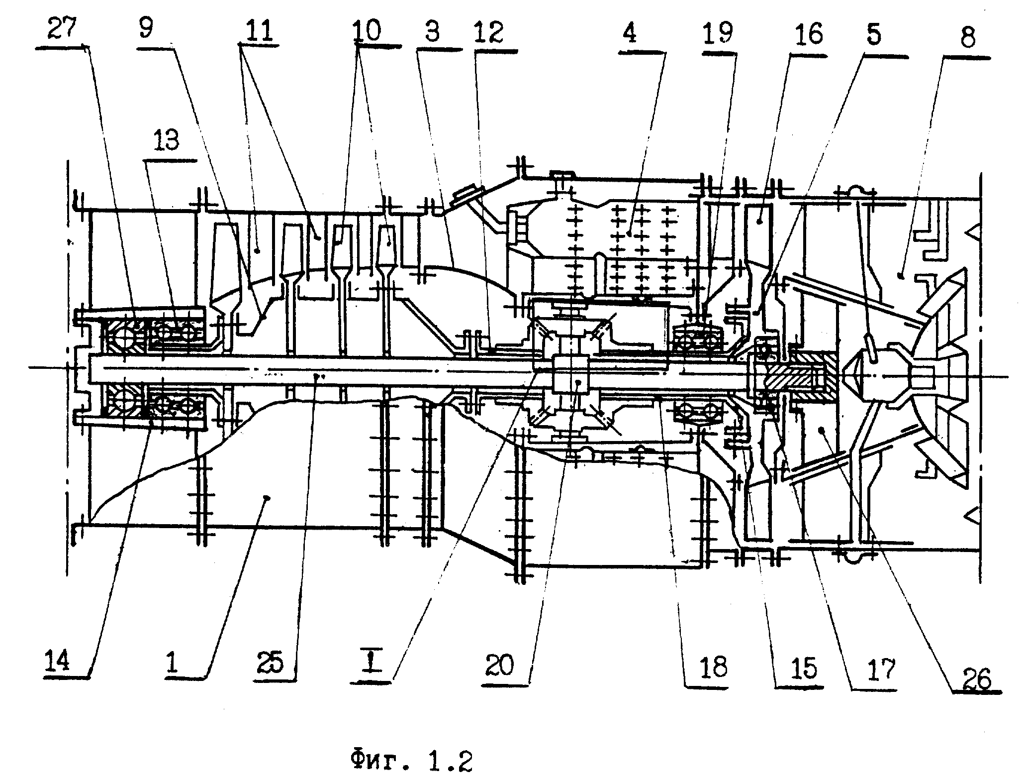 двигателя, и служит силовой системой турбокомпрессора, являясь дополнительной промежуточной опорой для несущей оси 25, увеличивая конструкционную жесткость двигателя, разгружая роторы 9, 15