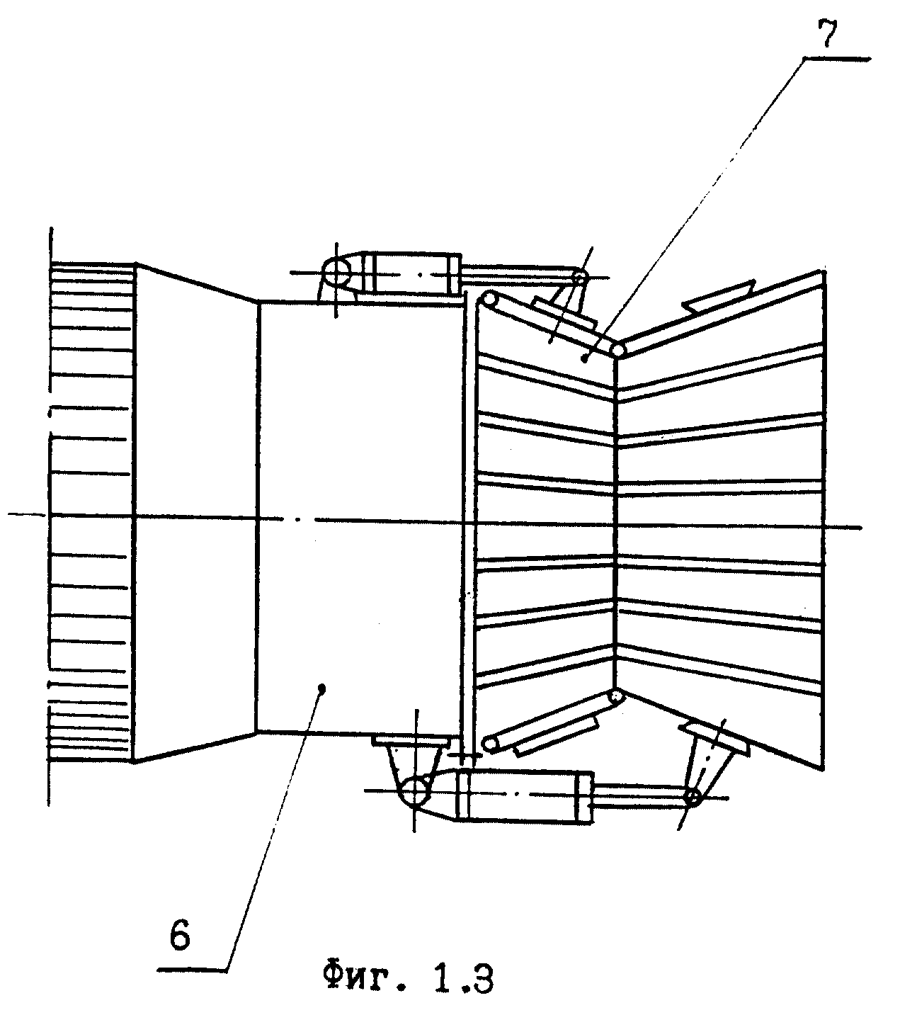 установленные в корпусе 1 регулируемый воздухозаборник 2 (фиг. 1.1.), осевой компрессор 3, кольцевую камеру 4 сгорания и газовую турбину 5, образующие турбокомпрессор (фиг. 1.2. ), и выходное