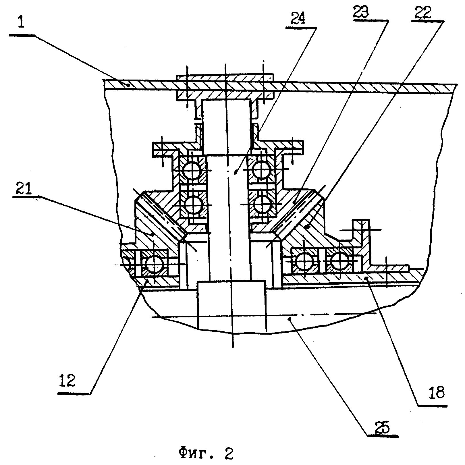 на фиг. 2. На сопрягаемых торцах валов 12 и 18 укреплены конические шестерни 21 и 22 соответственно, с равным числом зубьев зеркального отображения угла их наклона, которые зацеплены с коническими
