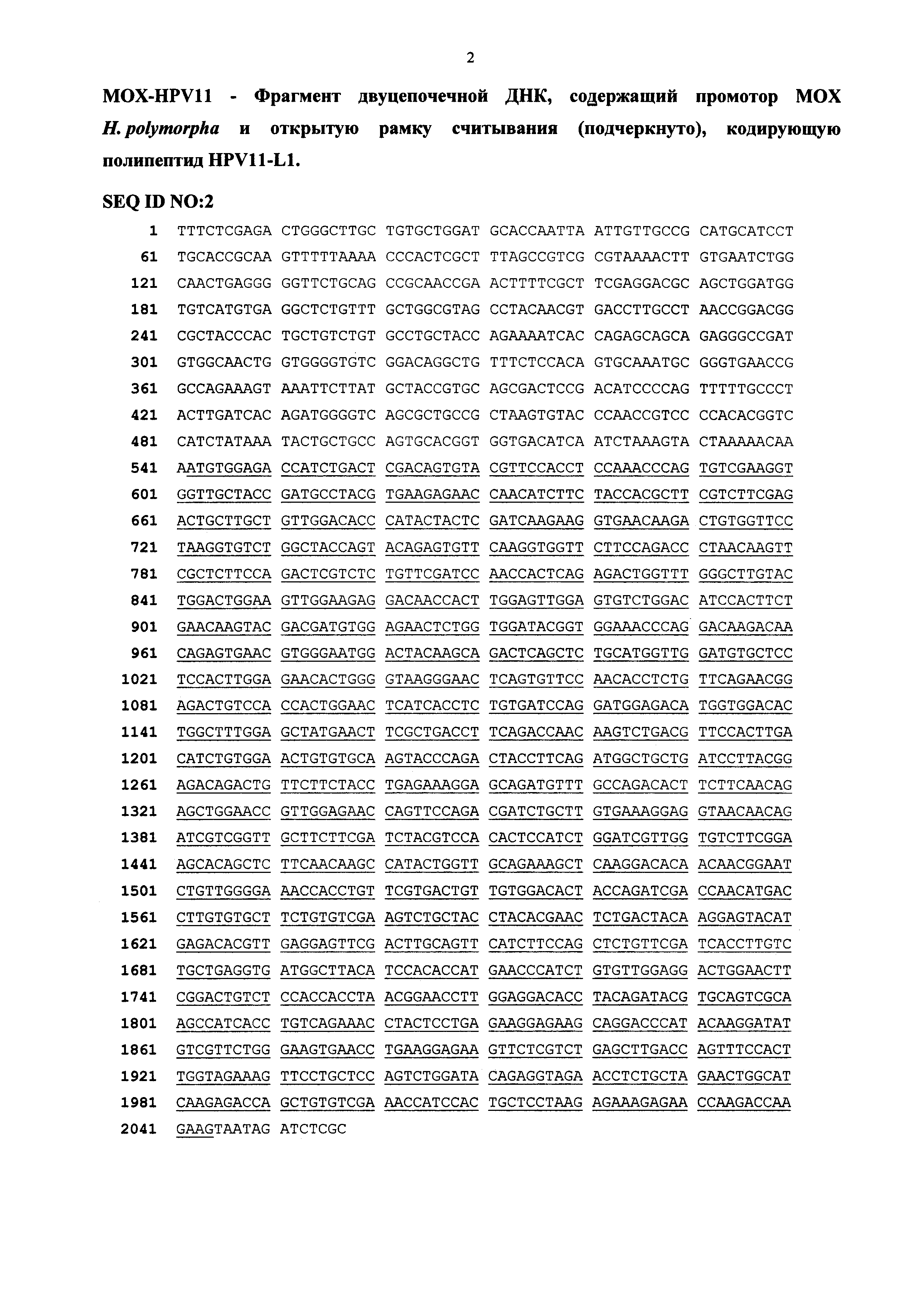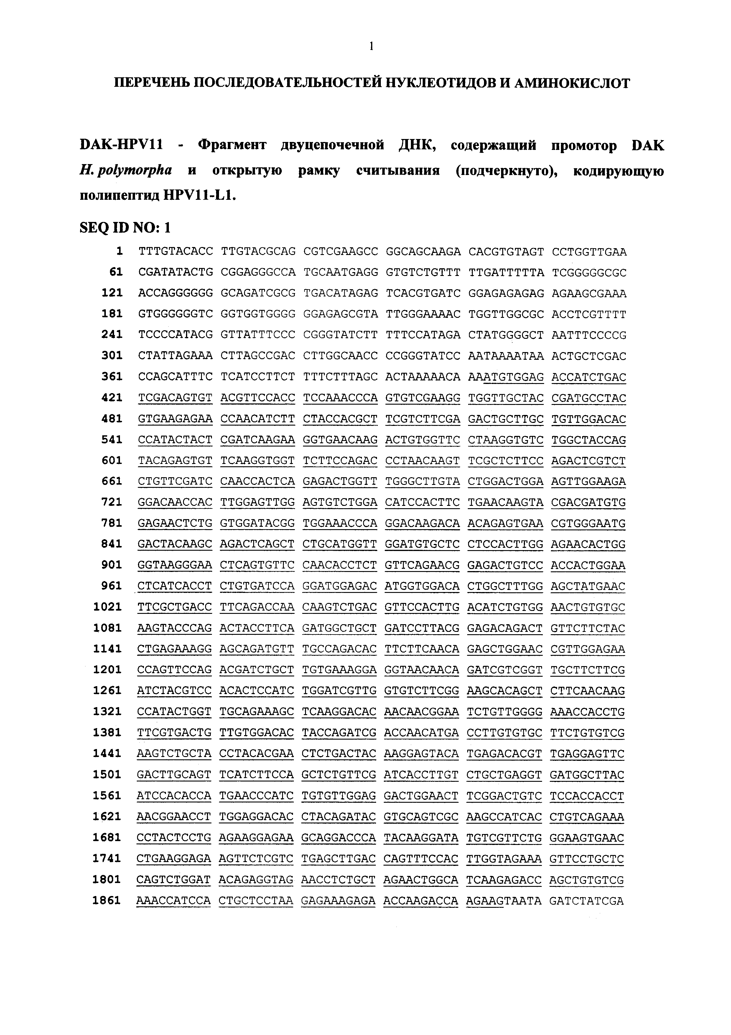 Изобретение относится к области биотехнологии, а именно генной инженерии, и может быть использовано для создания микробиологического дрожжевого продуцента капсидного белка L1 вируса папилломы человека типа 11. Вирус папилломы человека (HPV - Human Papilloma Virus), поражая эпителиальные клетки, вызывает различные заболевания у человека. На основании отличий в последовательности ДНК выделяют более 200 типов вируса папилломы. По данным ВОЗ более 630 миллионов человек являются носителями папилломавирусной инфекции, из них у 190 миллионов наблюдаются клинические проявления. Вирус папилломы человека типа 16 и 18 вызывает эпителиальную дисплазию слизистой половых органов, именно эти типы вируса папилломы ассоциированы с большей частью преинвазивных и инвазивных карцином аногенитальной сферы (рак шейки матки, влагалища, вульвы и анального канала), из которых рак шейки матки - один из самых распространенных и опасных видов новообразований у женщин. В исследовании, проведенном на территории РФ, показано, что у женщин с высокой степенью плоскоклеточного интраэпителиального поражения и раком шейки матки наряду с HPV типа 16 обнаруживается HPV типа 56, причем в случае мультиинфекции этот тип вируса преобладает (V11 Всероссийская научно-практическая конференция с международным участием «Молекулярная диагностика - 2010», Сб.трудов п/ред. Академика РАМН В.И. Покровского, т. 3, с. 373-409). Ежегодно раком шейки матки заболевают около 500 тысяч женщин во всем мире, причем более половины этих случаев заканчиваются летальным исходом. Вирус папилломы человека типов 6 и 11 не относятся к онкогенным: папилломавирусная инфекция в этом случае проявляется в виде образования доброкачественных бородавок, незлокачественных кондилом или папиллом на слизистой половых органов или дыхательных путей. В мире ежегодно регистрируется 30 миллионов новых случаев генитальных бородавок, связанных с папилломавирусной инфекцией. Клинические проявления инфекции не обнаруживаются длительное время, в то же время ранняя диагностика папилломавирусной инфекции довольно сложна. Именно поэтому в борьбе с распространением такого тяжелого заболевания предпочтение отдается профилактике папилломавирусной инфекции, в частности, путем индуцирования иммунного ответа у человека при вакцинации. Вирус папилломы относится к семейству паповирусов (Papoviridae), имеет диаметр 40-50 нм. Капсид вируса образован из 72 белковых капсомеров, состоящих из основного белка L1 и минорного белка L2. Геном вируса представлен в виде кольцевой двуцепочечной ДНК, которая содержит 8 ранних генов (Е1-Е7) и два поздних гена, кодирующих белки капсида L1 и L2. Главный белок L1 (55-60 кДа) способен сам собираться в вирусоподобные частицы (VLP - virus-like particle), сходные по строению с вирионами, но не содержащие вирусную ДНК. Белок L1 обладает высокой иммуногенностью и индуцирует образование антител, нейтрализующих инфекционный вирус. В настоящее время рекомбинантные белки L1 HPV представляют собой перспективные иммуногенные компоненты для создания профилактических вакцин, направленных против опасных типов папилломавируса. Затруднения, препятствующие созданию эффективных папилломавирусных вакцин, прежде всего, связаны с разработкой оптимальных экспрессионных систем для продукции рекомбинантных белков HPV, обладающих иммуногенными свойства