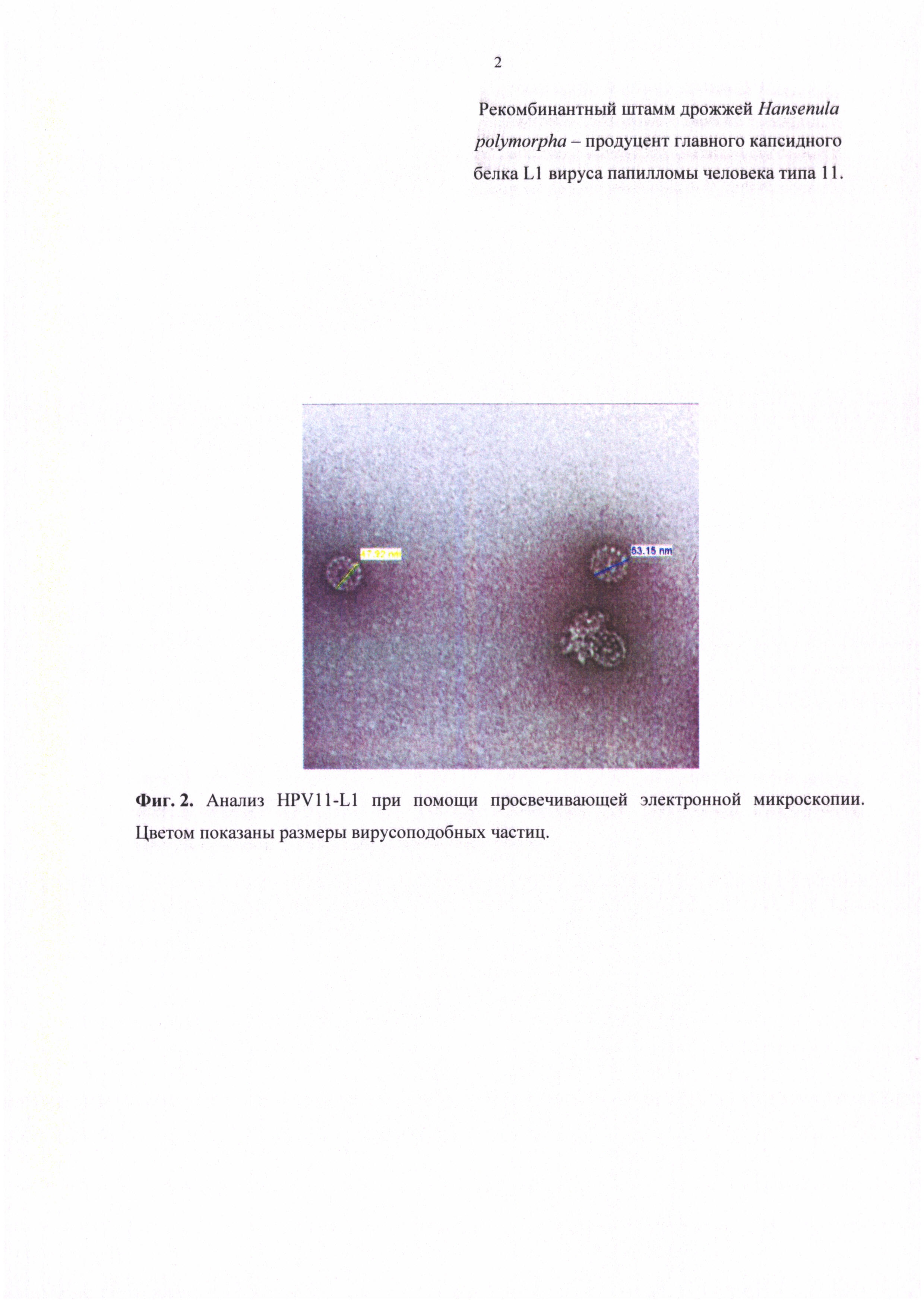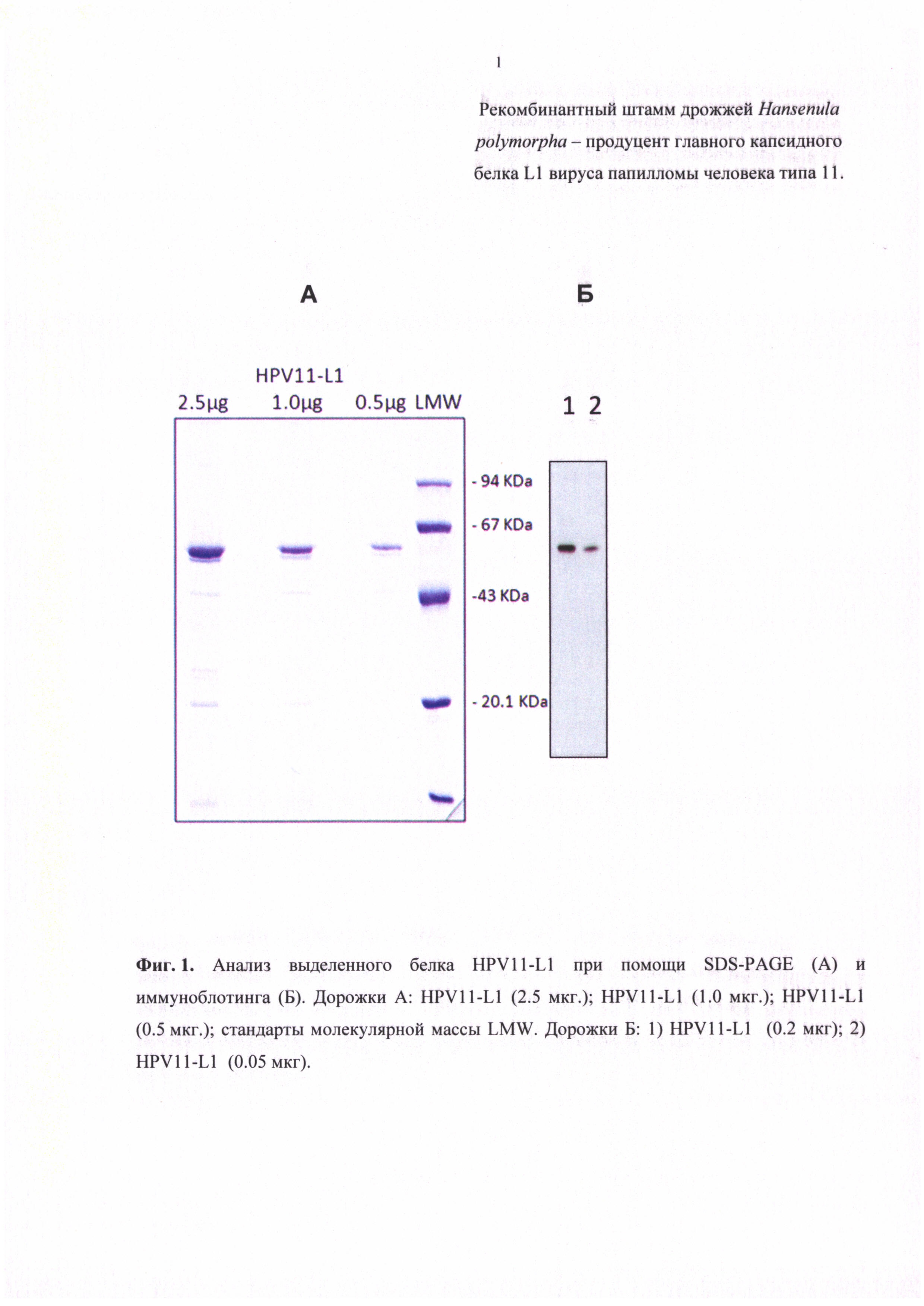 Изобретение относится к биотехнологии, а именно генной инженерии. Предложен штамм дрожжей Hansenula polymorpha - продуцент рекомбинантного белка L1 вируса папилломы человека (HPV) типа 11. Штамм был получен путем введения в геном клетки дрожжей одной копии последовательности ДНК, кодирующей капсидный белок L1 HPV типа 11, под контролем промотора ДАК, и одной копии последовательности ДНК, кодирующей капсидный белок L1 HPV типа 11, под контролем промотора МОХ. Штамм обеспечивает высокий выход рекомбинантного белка L1 HPV, обладающего антигенными и иммуногенными свойствами природного антигена. Изобретение может быть использовано для микробиологического получения рекомбинантного белка L1 HPV типа 11. 2 ил., 1 табл., 9 пр.