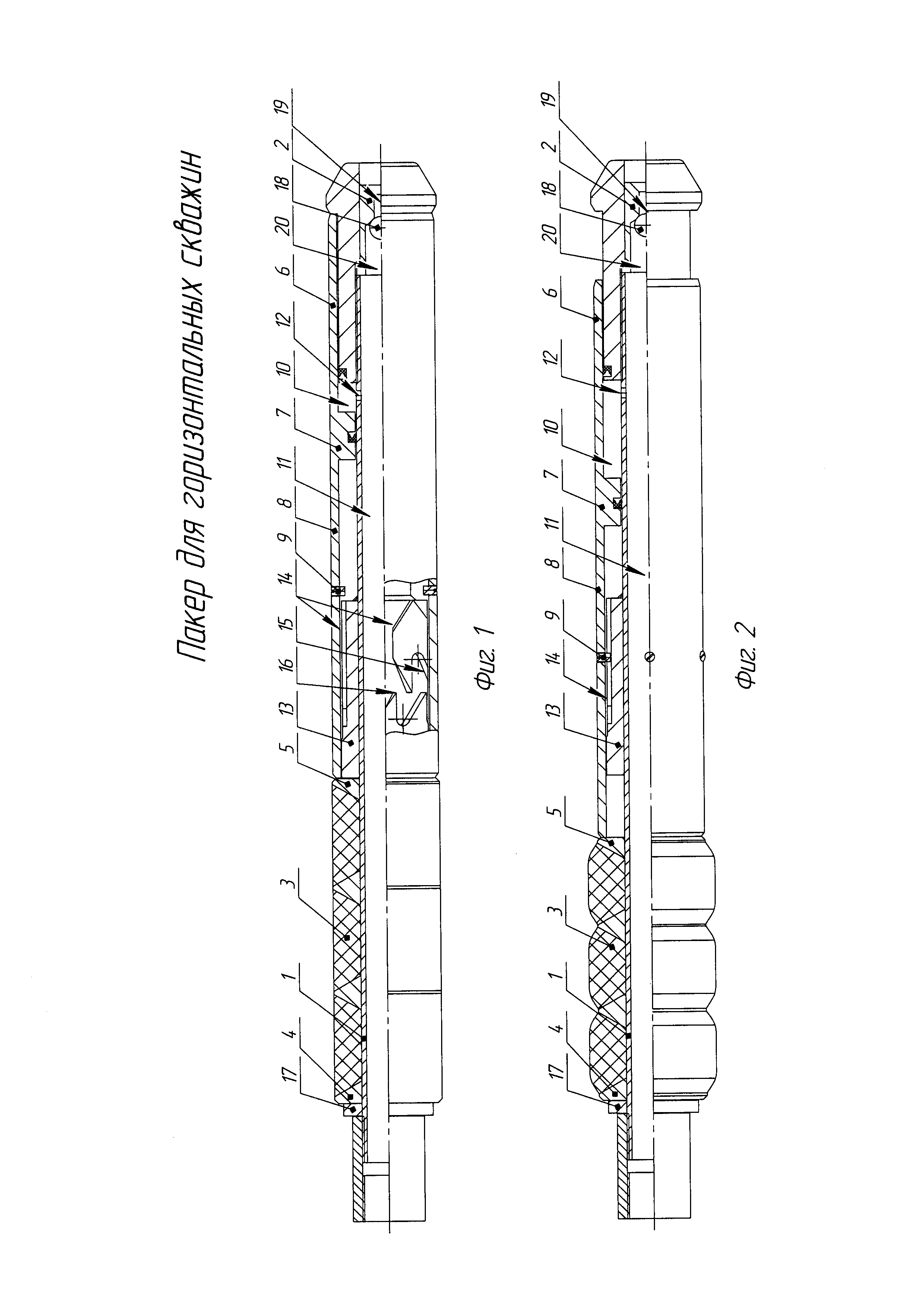 1. Пакер для горизонтальных скважин, содержащий полый ствол с регулятором давления внизу, установленные на стволе уплотнительные элементы с верхним, нижним и промежуточными упорами, размещенный под ними на стволе подвижный гидроцилиндр с поршнем, который оснащен толкателем, выполненным с возможностью взаимодействия с нижним упором, а верхний упор соединен со стволом с возможностью перемещения навстречу нижнему упору с сжатием уплотнительных элементов под действием поршня с гидроцилиндром, полость которого сообщена с полостью ствола через радиальный канал, отличающийся тем, что толкатель поршня выполнен кольцевым, опирающимся на нижний упор и оснащенным изнутри одним или несколькими штифтами, регулятор давления изготовлен в виде обратного клапана, а между нижним упором и поршнем размещен на стволе кольцевой выступ с наружными продольными чередующимися длинными и короткими проточками, соединенными фигурными проточками под штифты толкателя, позволяющими при возвратно-поступательном перемещении толкателя относительно ствола штифтам располагаться поочередно то в длинных продольных проточках - транспортное положение, то в коротких продольных проточках - рабочее положение после сжатия уплотнительных элементов, при этом верхний упор соединен со стволом через регулировочную втулку, толщина которой подбирается в зависимости от номинального диаметра ствола скважины. 2. Пакер для горизонтальных скважин по п. 1, отличающийся тем, что регулятор давления выполнен без ограничителя шара, при этом шар выполнен деформируемым при определенном перепаде давления для возможности его проталкивания через отверстие регулятора давления. 3. Пакер для горизонтальных скважин по п. 1, отличающийся тем, что штифты выполнены с возможностью разрушения при невозможности перевода пакера в транспортное положение из рабочего.