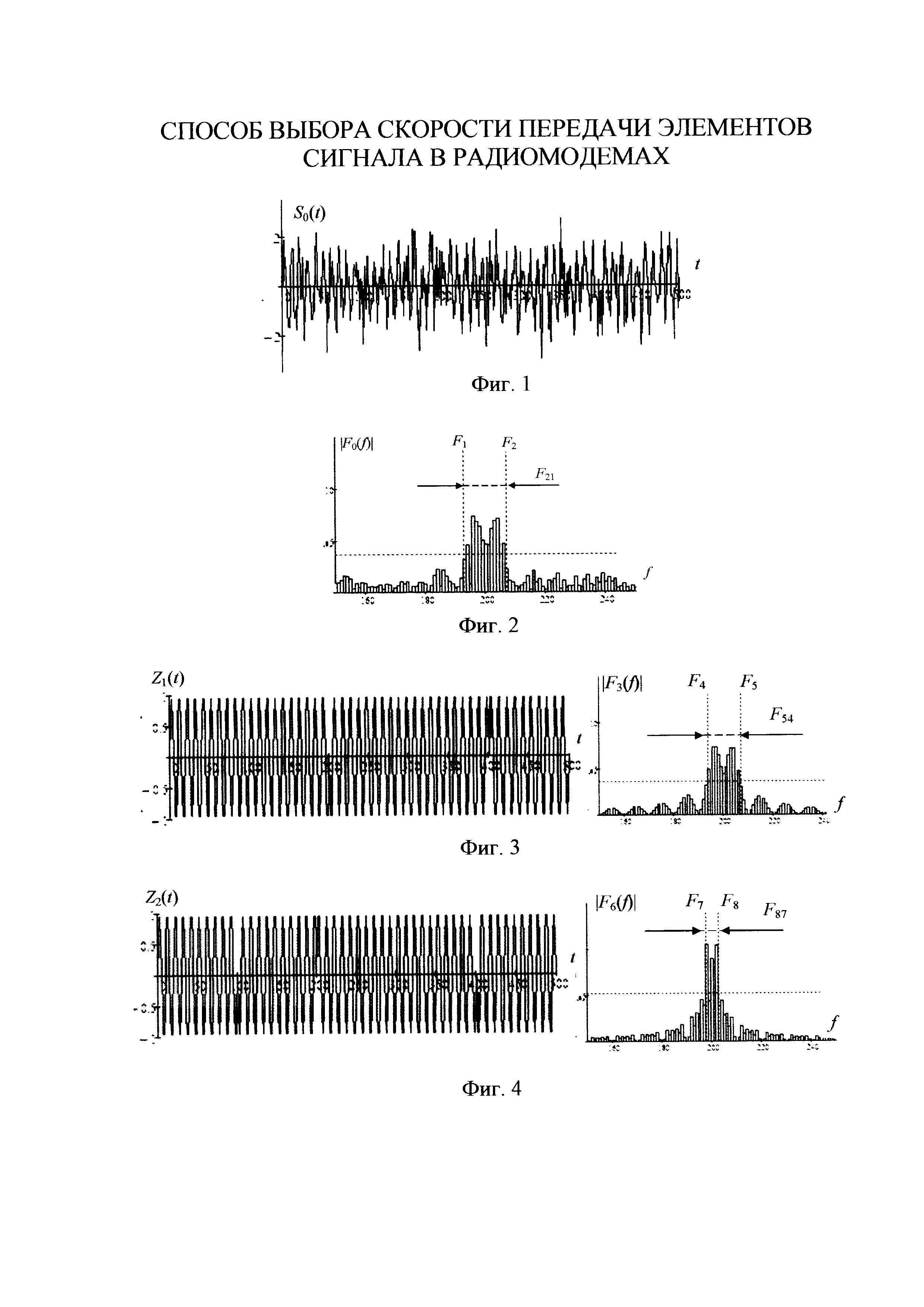 , с соответствующими измеренными значениями ширины спектра F54 и F87. Здесь F4, F5, F7, F8 - соответственно границы ширины спектров сигналов Z1(t) и Z2(t) по уровню их половинной мощности. Принятие решения об искомом значении градации скорости осуществляется путем сравнения измеренного значения F21 с предварительно рассчитанными значениями F54 и F87. В рассмотренном примере по результатам измерения скорость принятого сигнала S0(t) будет соответствовать скорости сигнала Z1(t), т.к. значение F21 примерно равно F54 и значительно отличается от F87.