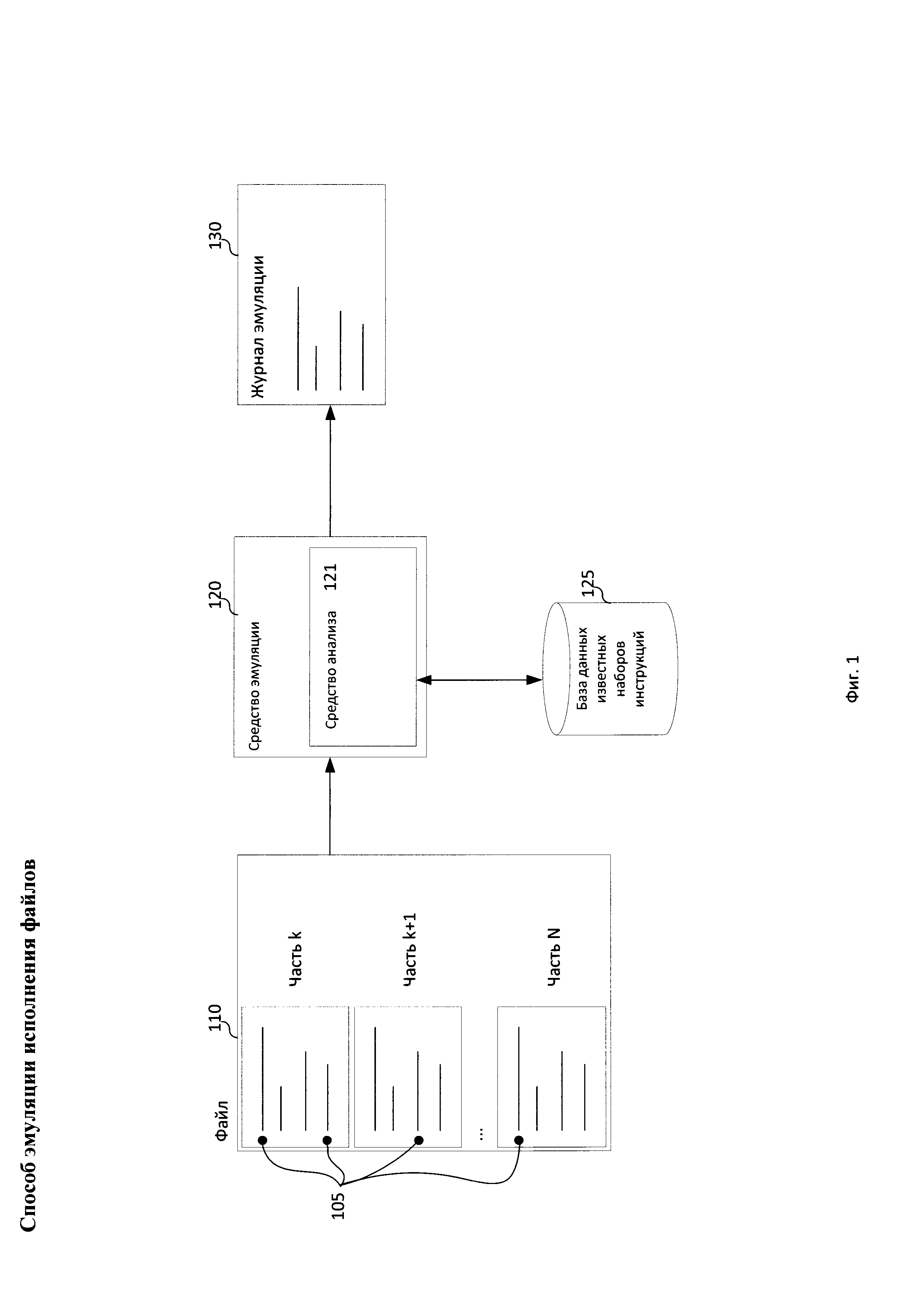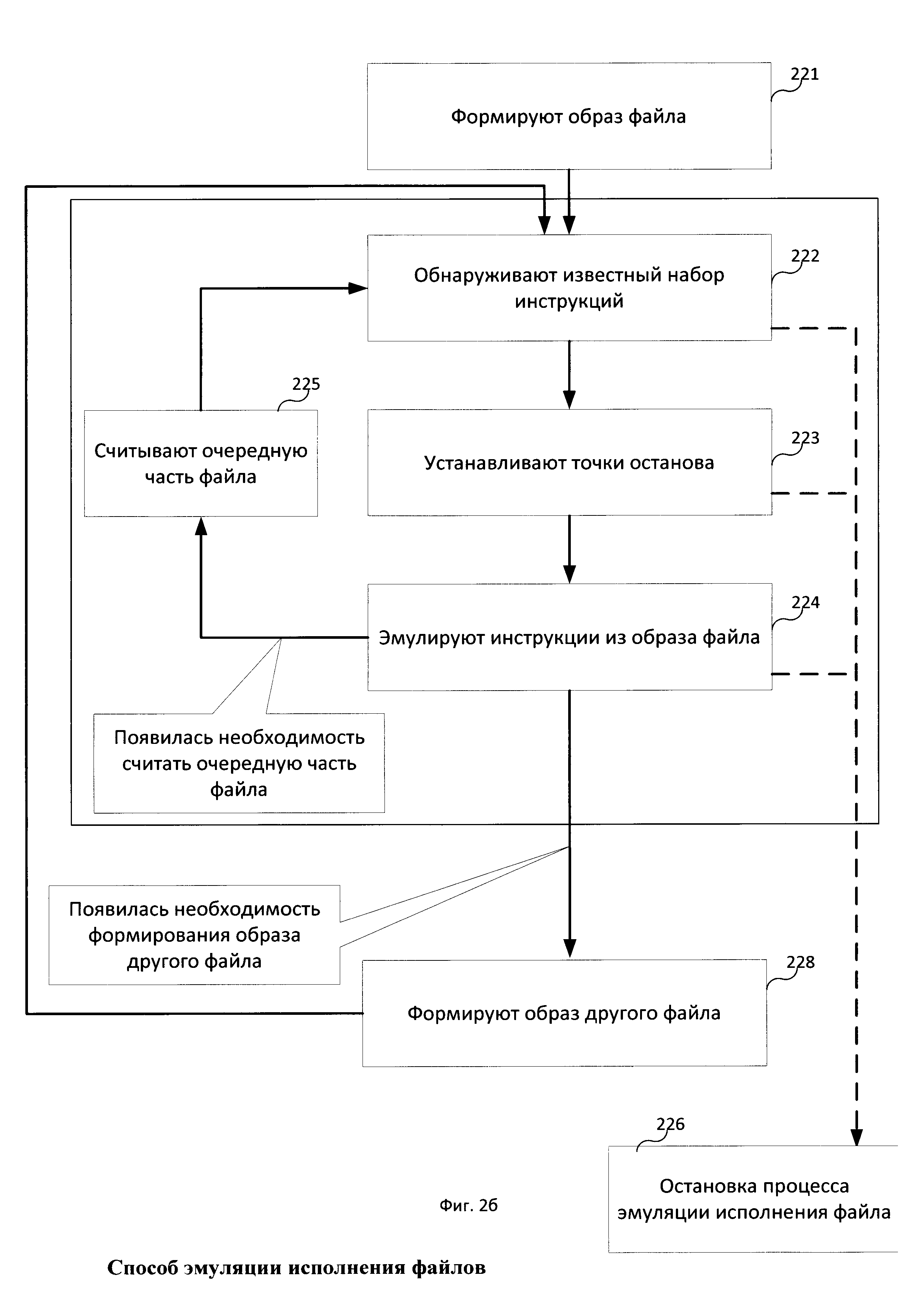 1. Способ эмуляции исполнения файла, реализуемый электронным вычислительным устройством, в котором: a. формируют образ файла при помощи средства эмуляции путем считывания части файла; b. обнаруживают при помощи средства анализа в считанной части файла по меньшей мере один известный набор инструкций; c. устанавливают при помощи средства анализа точки останова в начале по меньшей мере одного обнаруженного известного набора инструкций в образе файла; d. эмулируют при помощи средства эмуляции исполнение инструкций из образа файла, при этом при достижении средством эмуляции точки останова в журнал эмуляции добавляется запись о эмуляции исполнения известного набора инструкций, в начале которого установлена упомянутая точка останова. 2. Способ по п. 1, в котором обнаружение известного набора инструкций осуществляется с использованием по меньшей мере одной сигнатуры известного набора инструкций. 3. Способ по п. 1, в котором на этапе эмулирования при необходимости считывают при помощи средства эмуляции очередную часть файла для обновления образа файла и повторяют шаги b-d. 4. Способ по п. 3, в котором необходимость считывания очередной части файла появляется при обращении средства эмуляции во время эмуляции исполнения инструкций к инструкциям или данным, отсутствующим в образе файла. 5. Способ по п. 1, в котором процесс эмуляции останавливается по меньшей мере при следующих условиях: истечение установленного времени эмуляции, эмуляция исполнения инструкции для вызова прерывания или функции завершения исполнения. 6. Способ по п. 1, в котором файл разделен на части фиксированного размера. 7. Способ по п. 6, в котором размер части файла равняется 4 килобайтам. 8. Способ по п. 1, в котором известным набором инструкций является набор инструкций, содержащий инструкции подпрограммы. 9. Способ по п. 8, в котором подпрограммой является подпрограмма, входящая в состав статической библиотеки среды разработки файла. 10. Способ по п. 1, в котором при эмуляции инструкций осуществляется формирование журнала эмуляции, который содержит последовательность исполнения известных наборов инструкций. 11. Способ по п. 1, в котором при достижении средством эмуляции точки останова в начале известного набора инструкций вместо эмуляции исполнения инструкций из этого набора инструкций средство эмуляции эмулирует исполнение альтернативного набора инструкций. 12. Способ по п. 11, в котором альтернативным набором инструкций является оптимизированный набор инструкций, соответствующий упомянутому набору инструкций.