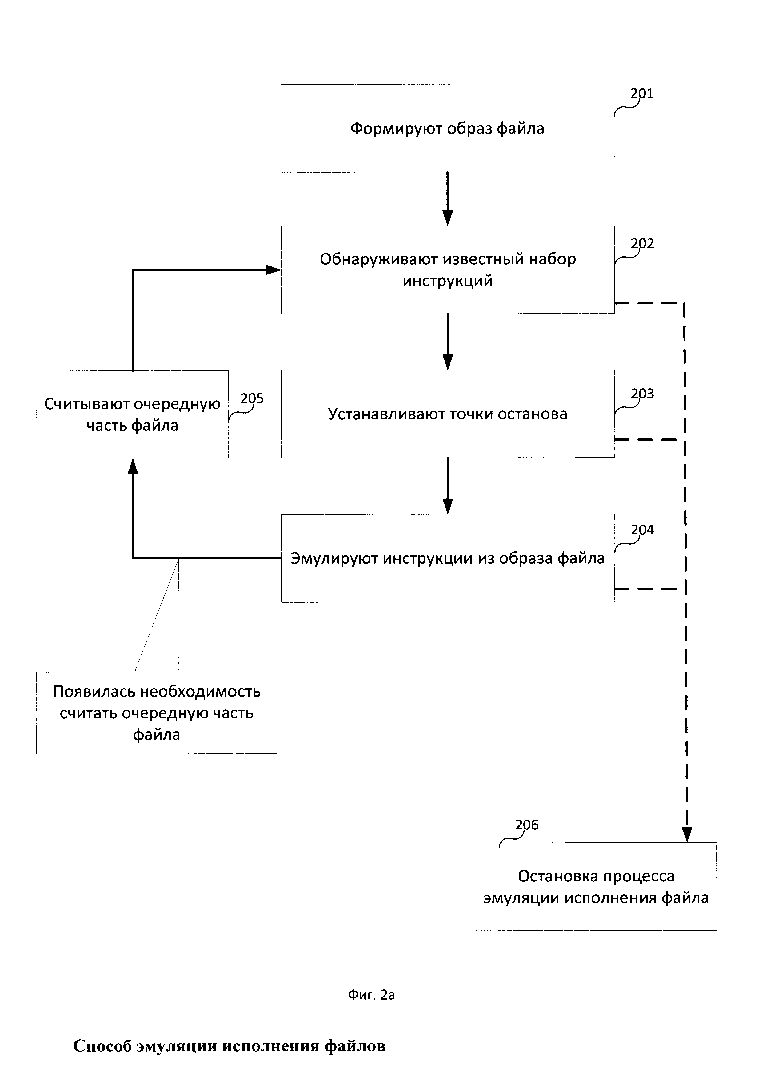 Изобретение относится к области компьютерной техники. Техническим результатом является эмуляция исполнения файлов. Раскрыт способ эмуляции исполнения файла, реализуемый электронным вычислительным устройством, в котором: a. формируют образ файла при помощи средства эмуляции путем считывания части файла; b. обнаруживают при помощи средства анализа в считанной части файла по меньшей мере один известный набор инструкций; c. устанавливают при помощи средства анализа точки останова в начале по меньшей мере одного обнаруженного известного набора инструкций в образе файла; d. эмулируют при помощи средства эмуляции исполнение инструкций из образа файла, при этом при достижении средством эмуляции точки останова в журнал эмуляции добавляется запись о эмуляции исполнения известного набора инструкций, в начале которого установлена упомянутая точка останова. 11 з.п. ф-лы, 4 ил.