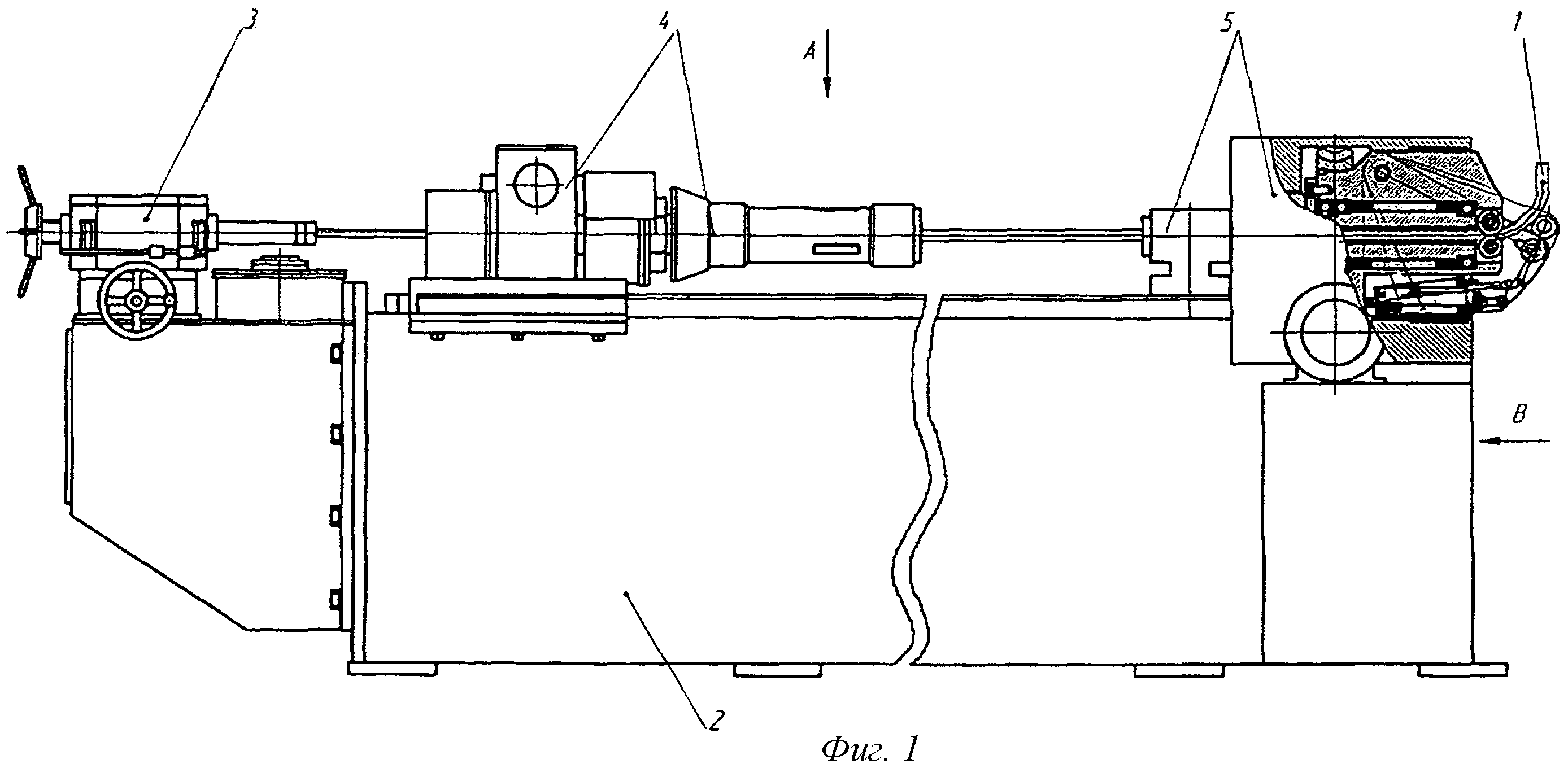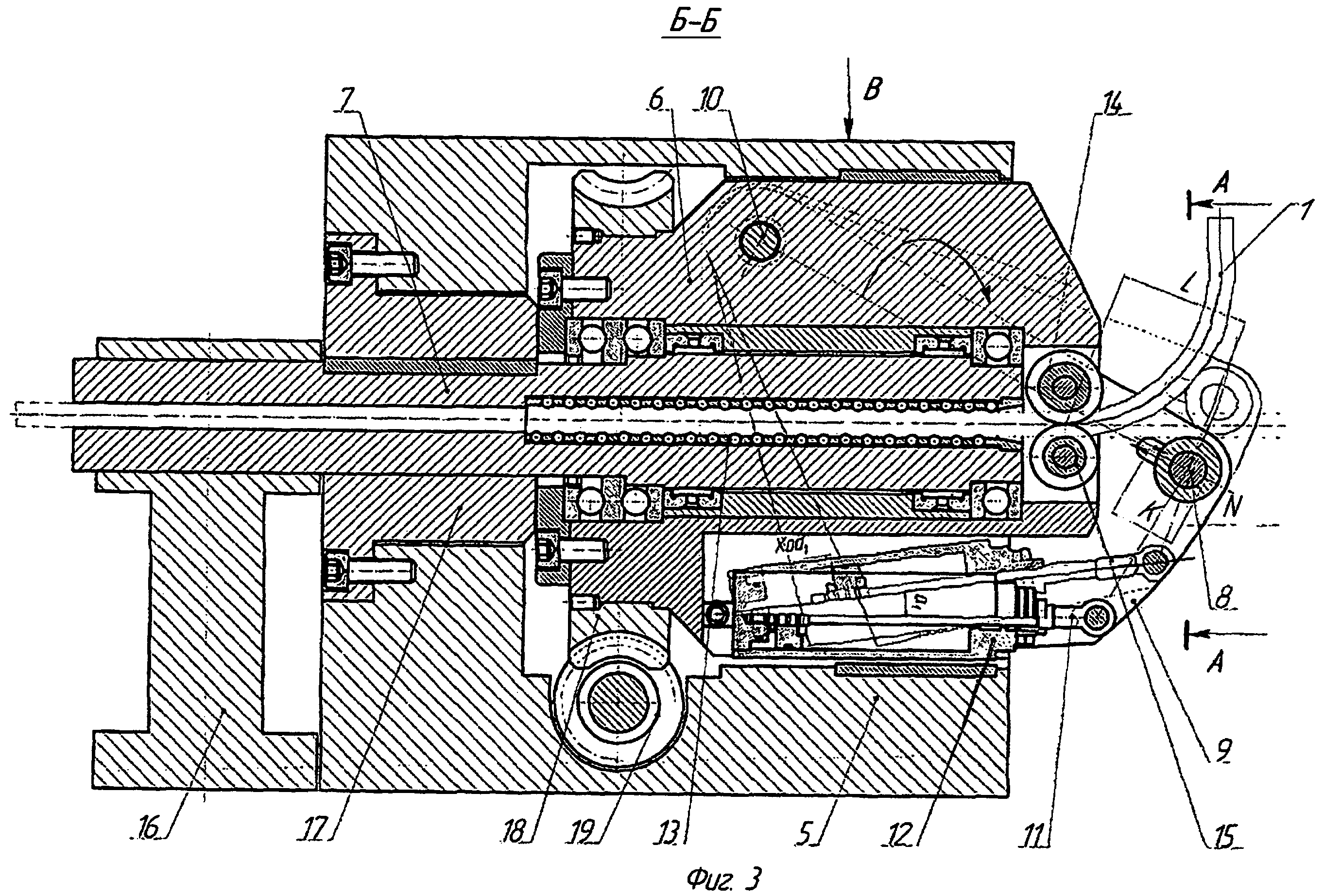 Изобретение относится к обработке металлов давлением, в частности к трубогибочному производству, и может быть использовано для изготовления труб многоколенной пространственной формы, в том числе с переменными радиусами изгиба. Известен способ гибки труб многоколенной пространственной формы, согласно которому размещают и фиксируют трубчатую заготовку на формующем элементе установленной на станок гибочной головки, деформируют заготовку изгибом с последующей расфиксацией заготовки, перед следующем изгибом заготовки в другой плоскости измеряют напряженное состояние заготовки в зоне ее гиба, а операцию поворота заготовки для ее каждого последующего гиба осуществляют в направлении, противоположном закручиванию под действием собственного веса изогнутых участков, причем поворот трубчатой заготовки осуществляют на величину измеренного угла закрутки, после чего фиксируют заготовку на формующем элементе гибочной машины, а затем осуществляют разворот ее прямолинейной части, подлежащей дальнейшему гибу, для исключения имеющейся закрутки в первоначальное положение и проводят последующий гиб (см. патент РФ №2076009, кл. B21D 9/05, 1997 г.). В результате анализа известного способа необходимо отметить, что данный способ может быть использован на известном оборудовании для получения изогнутых труб пространственной формы, однако обладает невысокими функциональными возможностями, так как не может быть использован для получения трубчатых изделий с переменными радиусами гиба, а также имеющих большие радиусы гиба. Измерение напряженного состояния места гиба заготовки связано с необходимостью периодического прекращения технологического процесса гибки, что снижает его производительность, оборудование для осуществления способа весьма сложно. Известен трубогибочный станок, содержащий смонтированную на станине балку с установленным в ней на подшипниках приводным валом с гибочным шаблоном. На балке закреплен неповоротный суппорт с приводной кареткой, несущей поджимную колодку. На приводном валу закреплен поворотный суппорт с приводной кареткой, несущей зажимную колодку. Привод каретки содержит шарнирно закрепленный в суппорте качающийся силовой цилиндр со штоком, связанным с осью шарнирного соединения одних концов двух рычагов, второй конец одного из которых шарнирно закреплен в корпусе суппорта, а второй конец другого шарнирно связан с подвижно установленной в направляющих суппорта кареткой. Шток силового цилиндра с осью шарнирного соединения концов двух рычагов соединен непосредственно или промежуточным элементом через прорезь в одном из рычагов (см. патент РФ №2088358, кл. B21D 9/05, 1996 г.). В результате анализа конструкции данного станка необходимо отметить, что он весьма сложен конструктивно, обладает невысокой точностью по заданному радиусу гиба, непроизводителен. Известна машина для гибки труб, состоящая из станины, блока управления, устройства прижима трубы, механизма регулировки поджима трубы с колодкой поджима трубы, привода, механизма установки угла гиба, балки с разметочной шкалой линейного выдвижения трубы, устройства фиксации линейного выдвижения трубы, дорна с механизмом его выдвижения, на балке установлена задняя бабка. Машина оснащена переключателем значений углов гиба трубы с регулировочными упорами, об
